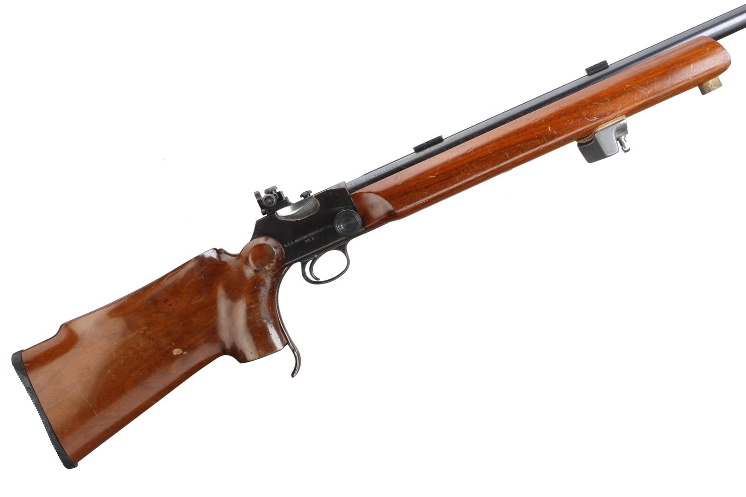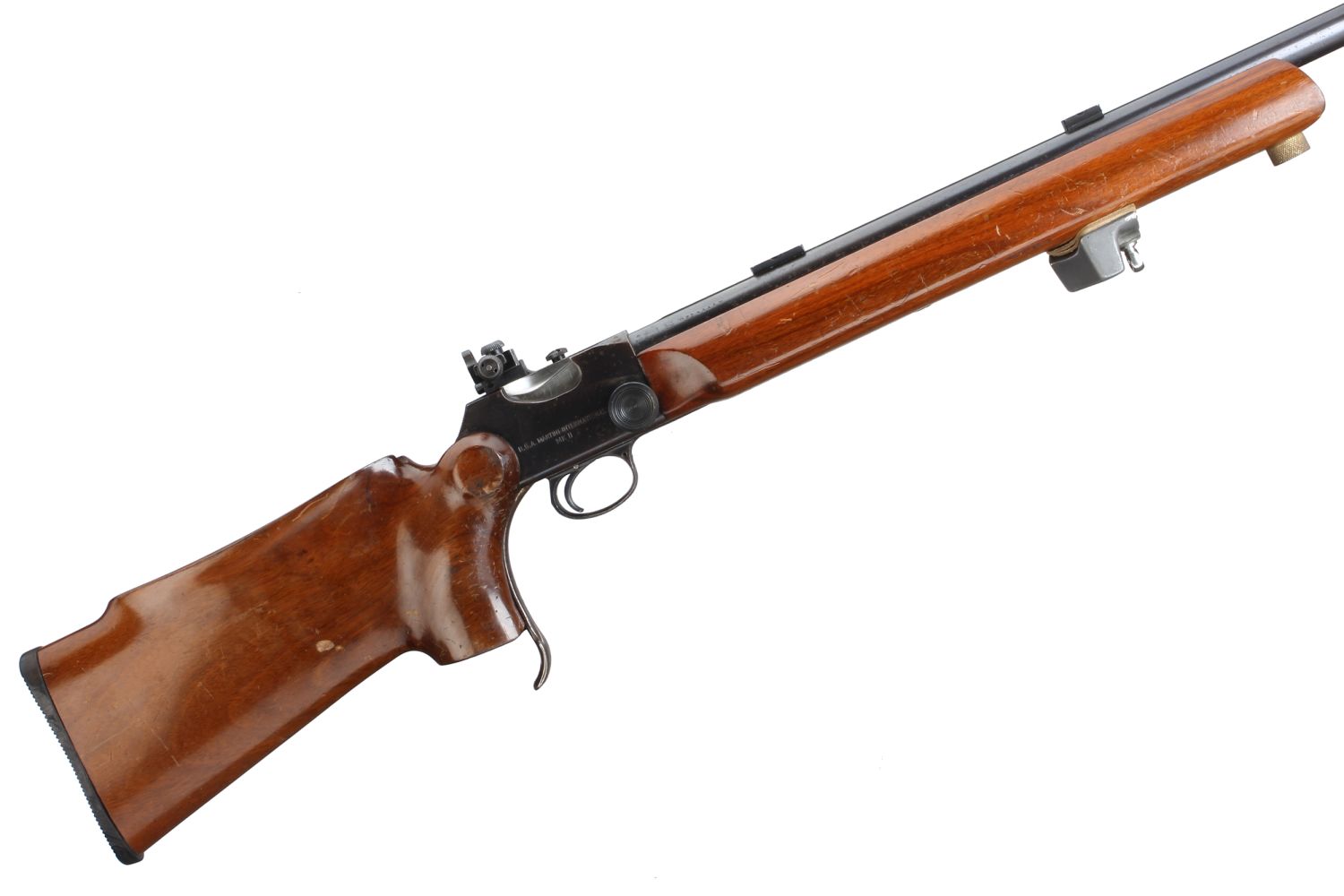 Hard rubber ‘BSA’ butt pad, raised comb, semi-pistol grip. Parker Hale handstop with integral sling mount. Rail mounted dioptre tunnel foresight, scope mount blocks, Parker Hale PH25B rear sight. , action release knob.