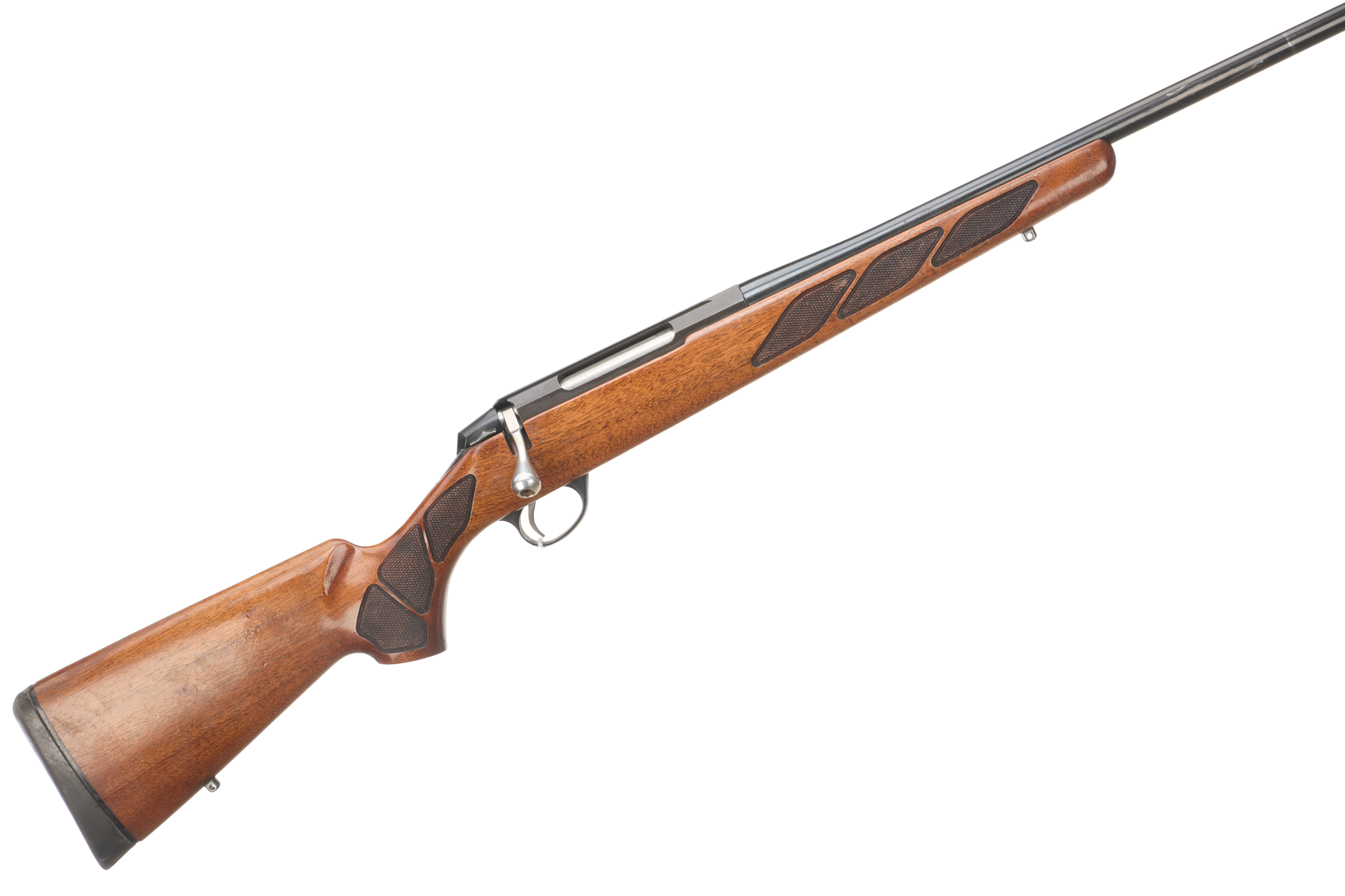 Soft rubber butt pad, chequered stock, front and rear sling studs. Screw cut (thread protector absent). Dovetail scope rail. Magazine absent.