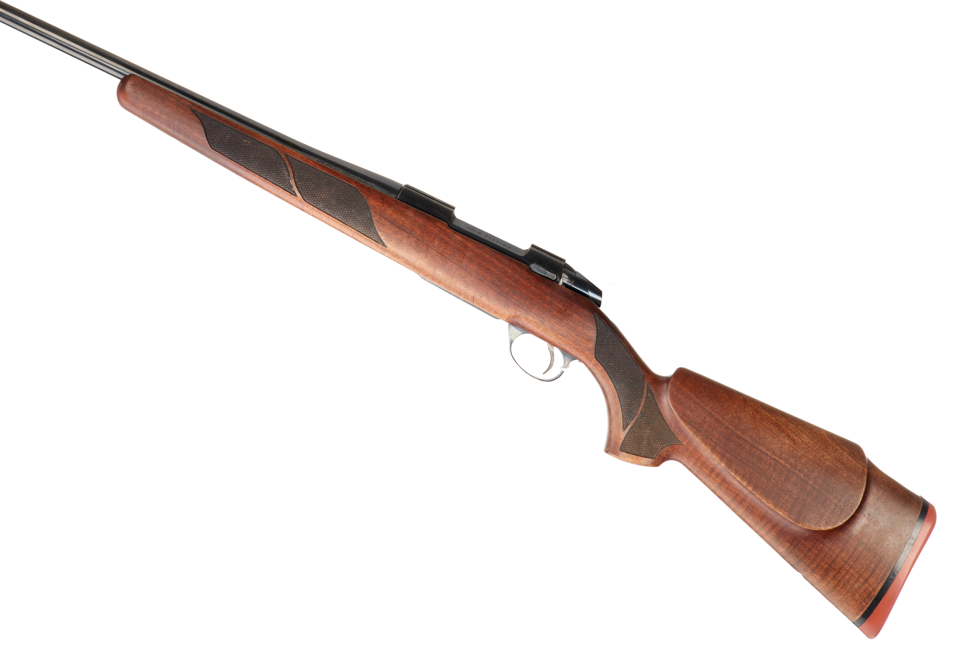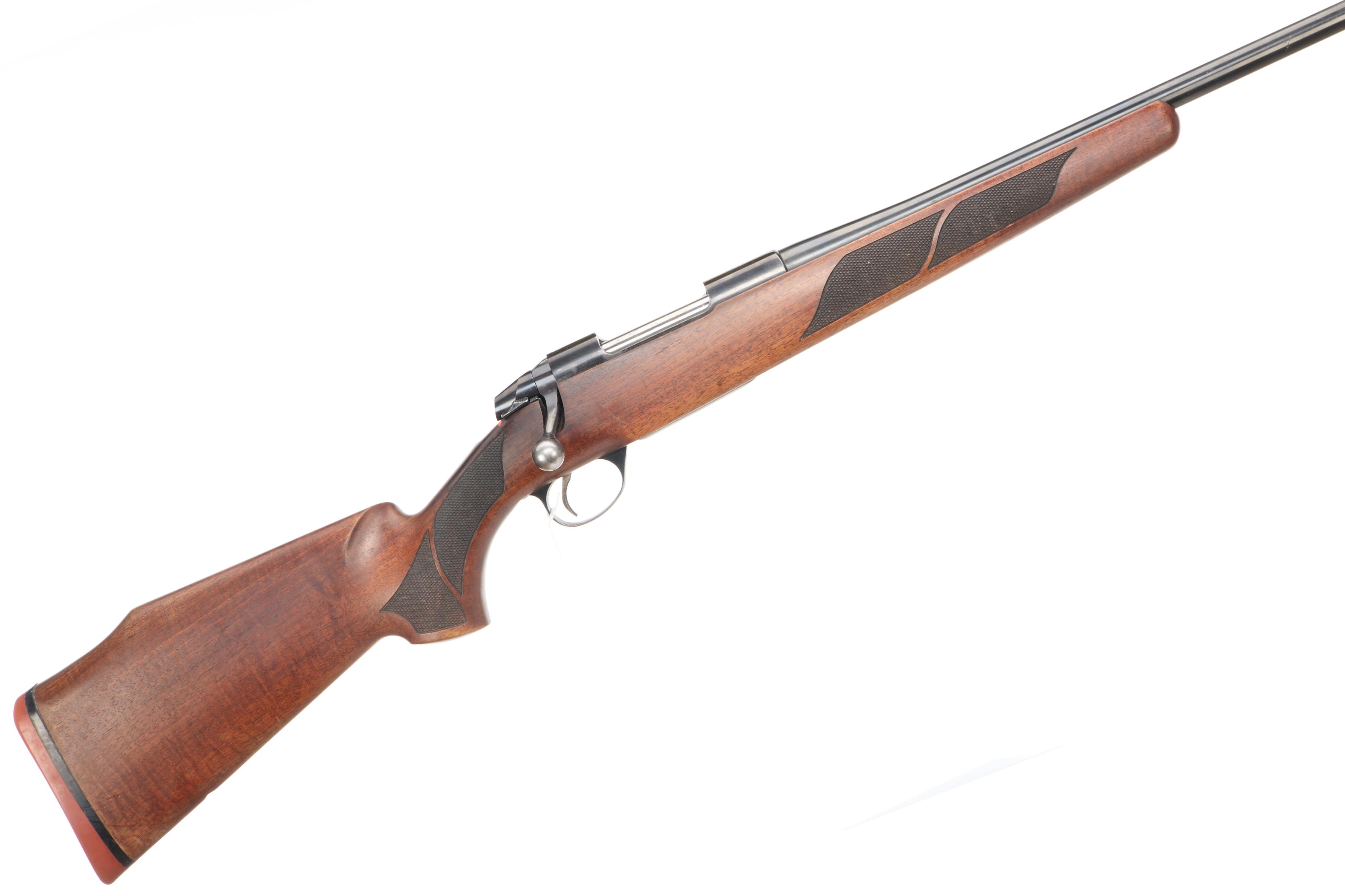 Soft rubber butt pad, chequered walnut stock. Unsighted blued barrel, dovetail scope mounts. Manual safety, CW detachable box magazine.