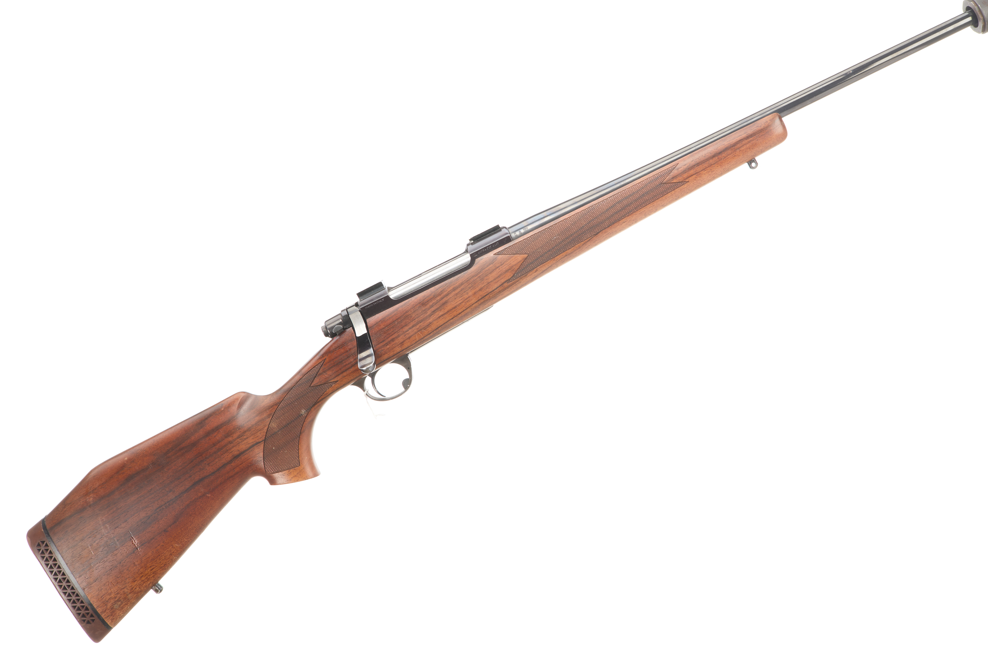 Ventilated rubber butt pad, chequered walnut stock with cheek piece, front and rear sling studs. Unsighted blued barrel, screw cut CW moderator. Receiver fitted with dovetail scope mounts. Internal magazine with hinged floorplate.