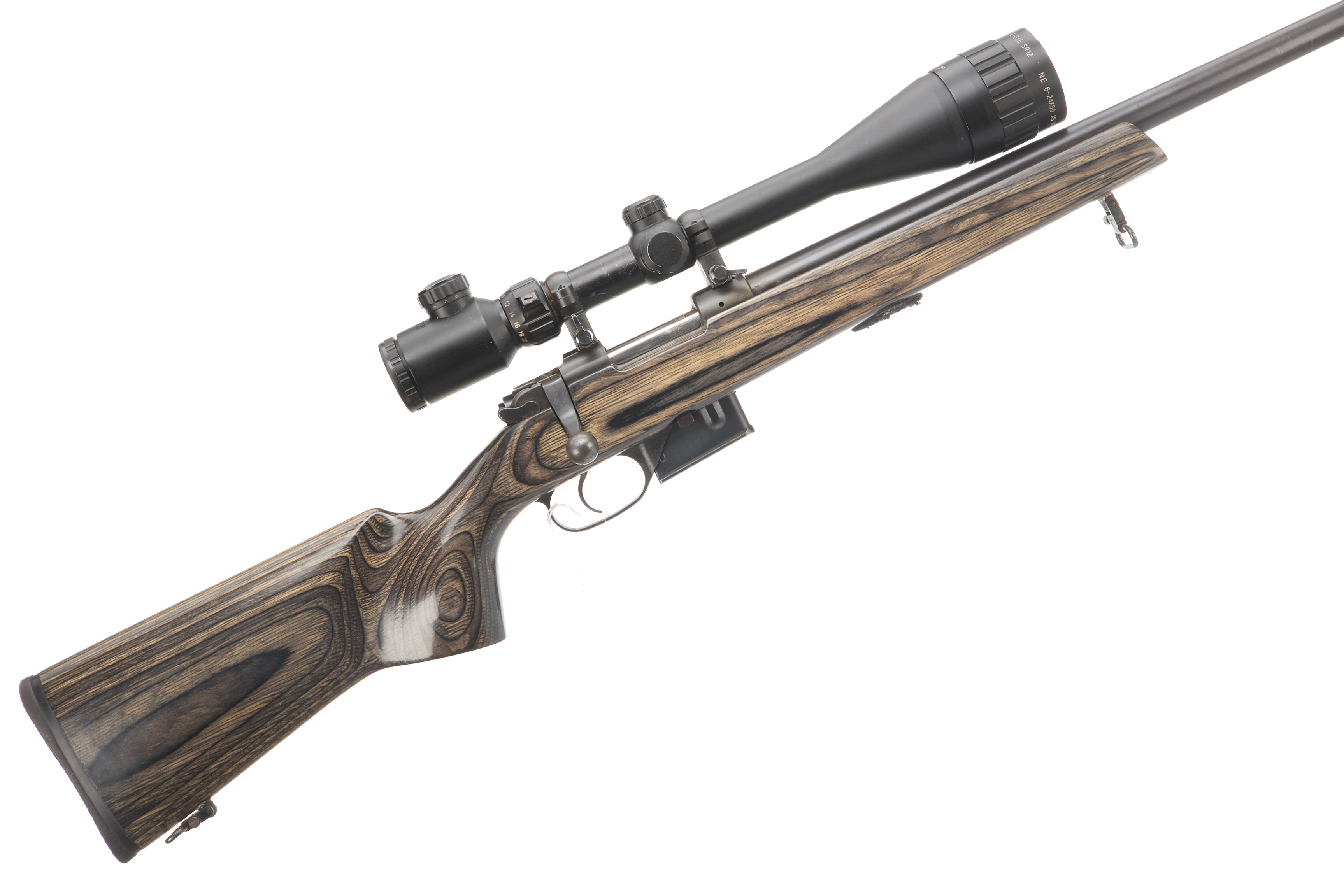 Soft rubber butt pad, laminate stock with front and rear sling swivels. Screwcut barrel (thread protector absent), dovetail scope rail, HAWKE 6-24×50 scope. Detachable 5 round box magazine, manual safety.