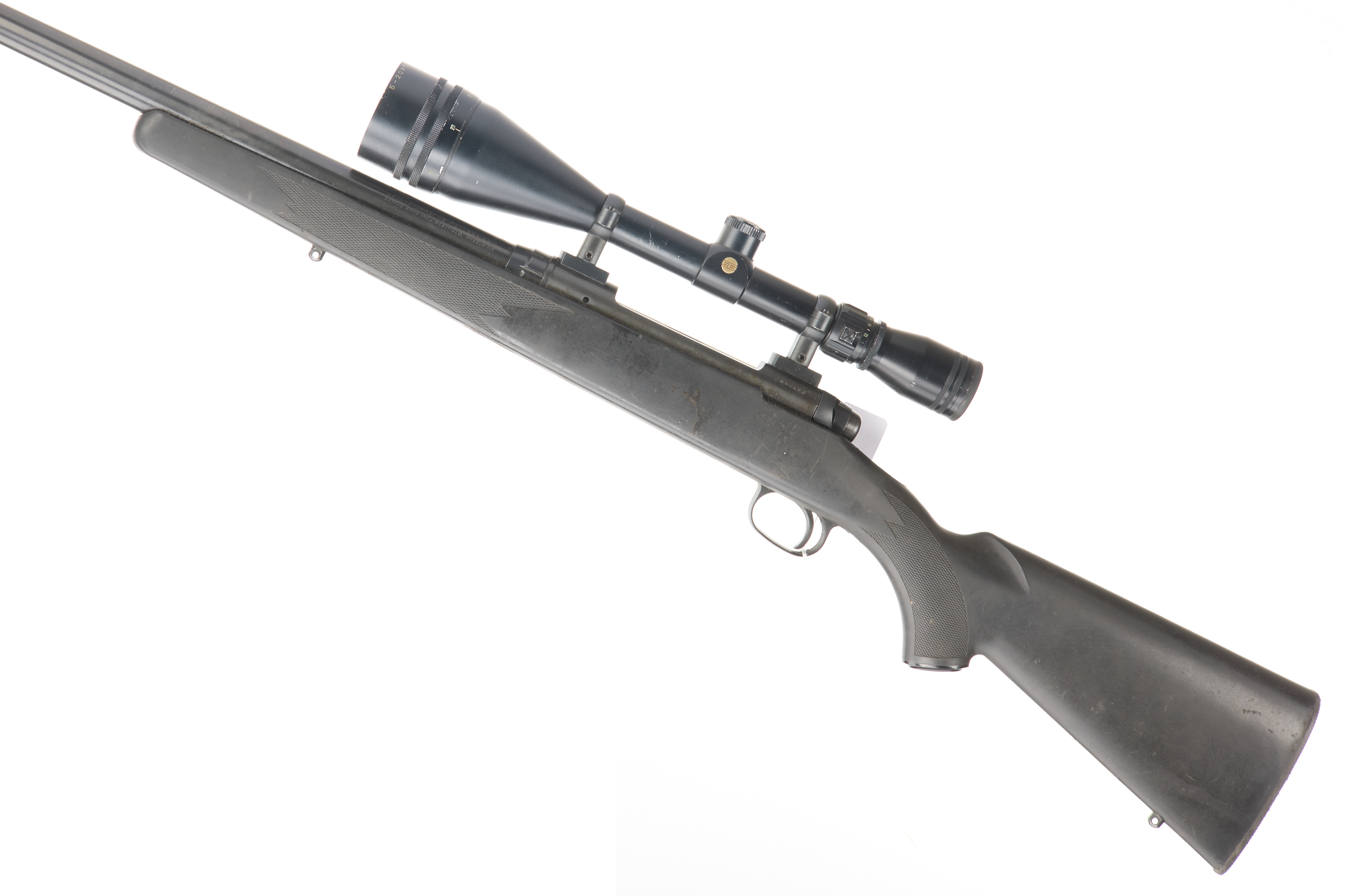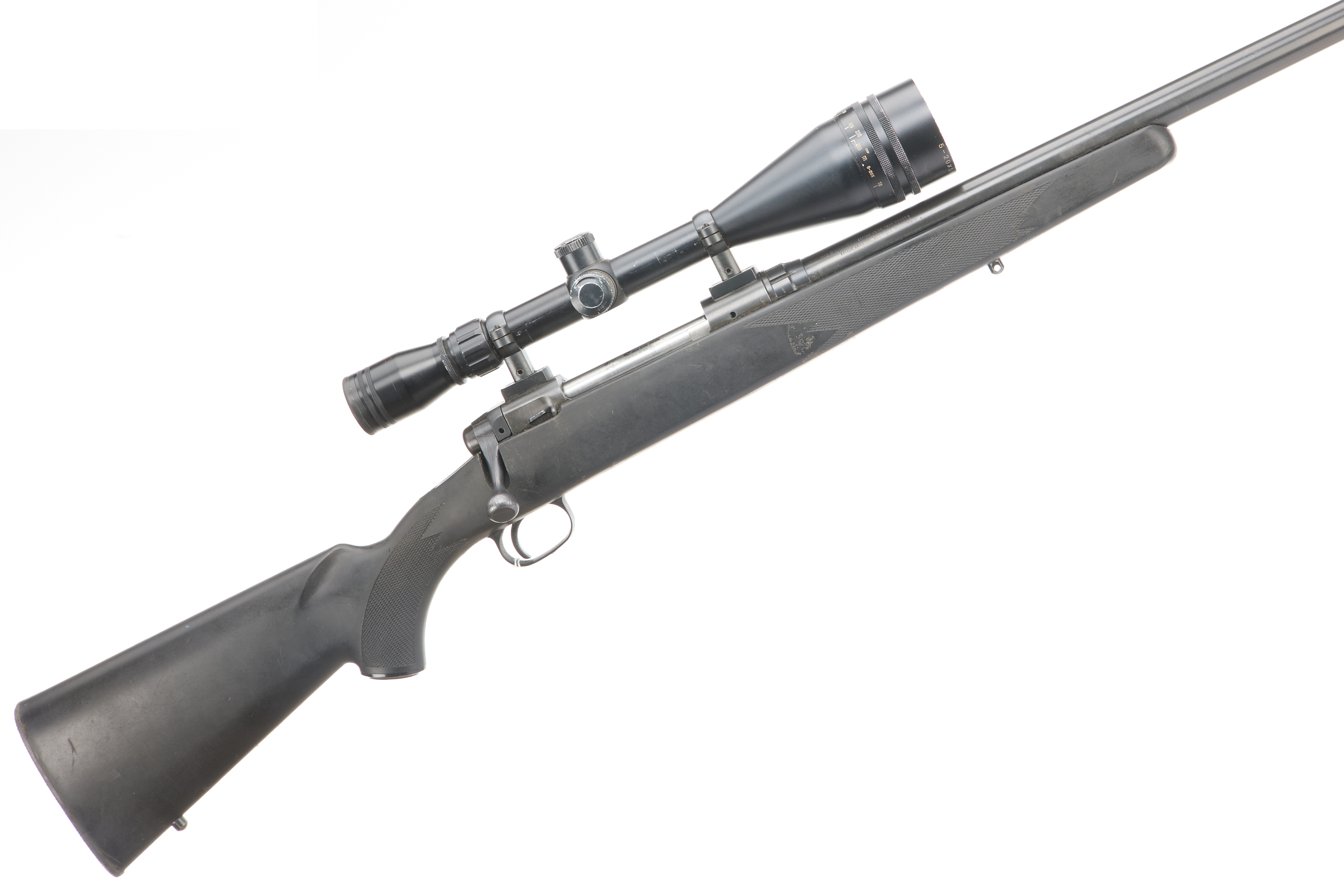 Hard plastic butt pad. Synthetic chequered pistol grip stock with front and rear sling swivels. Blued barrel and action CW Edgar Brothers 5-20×50 scope. Manual safety.