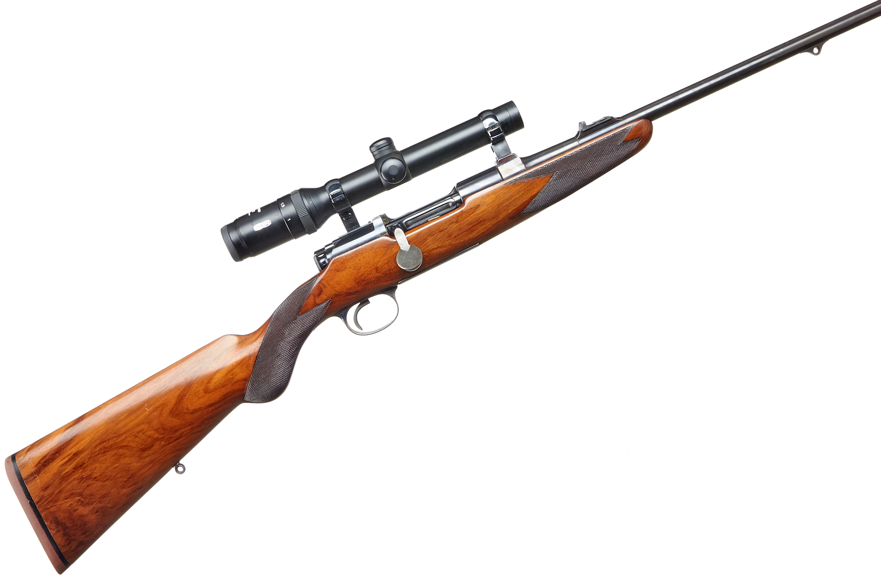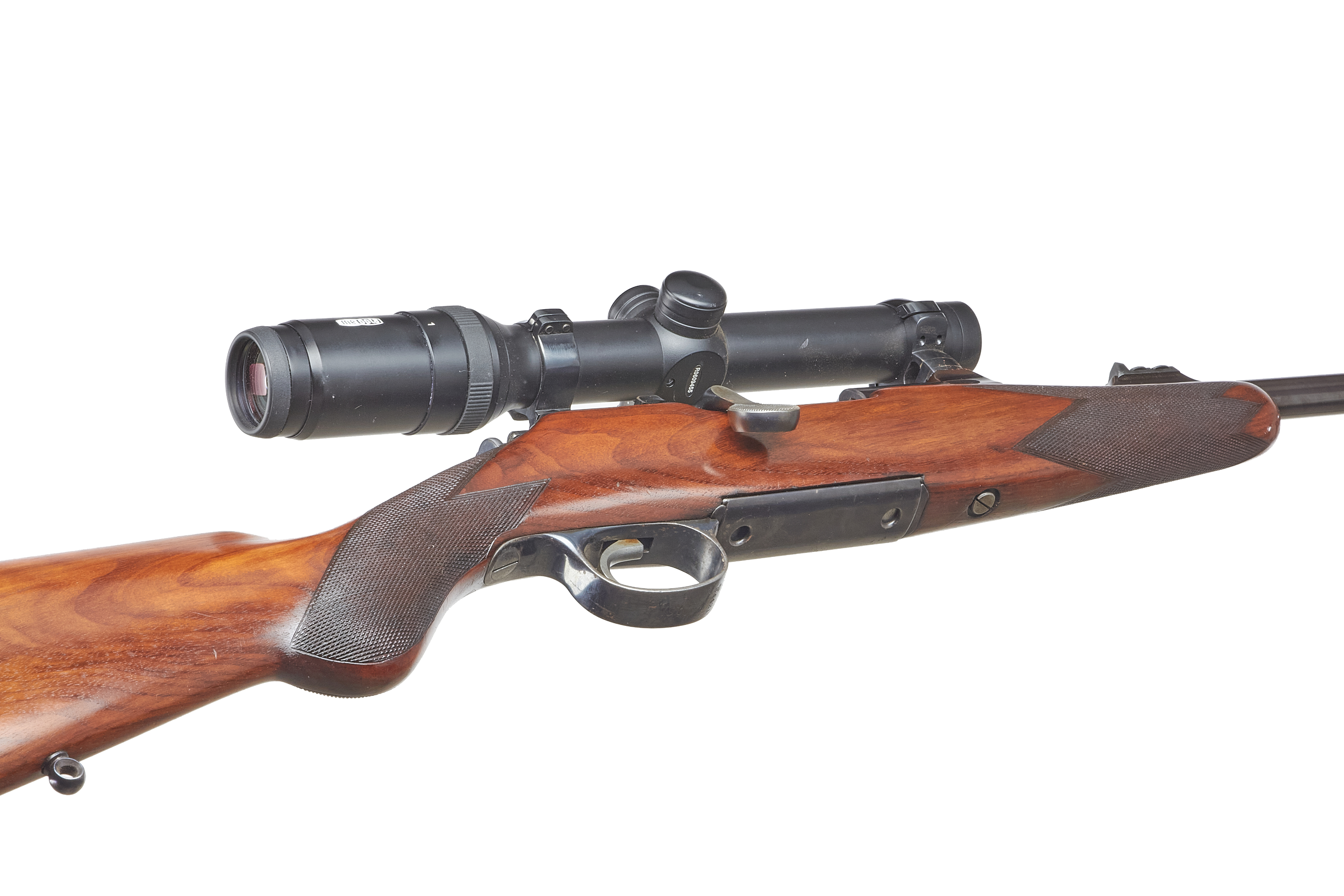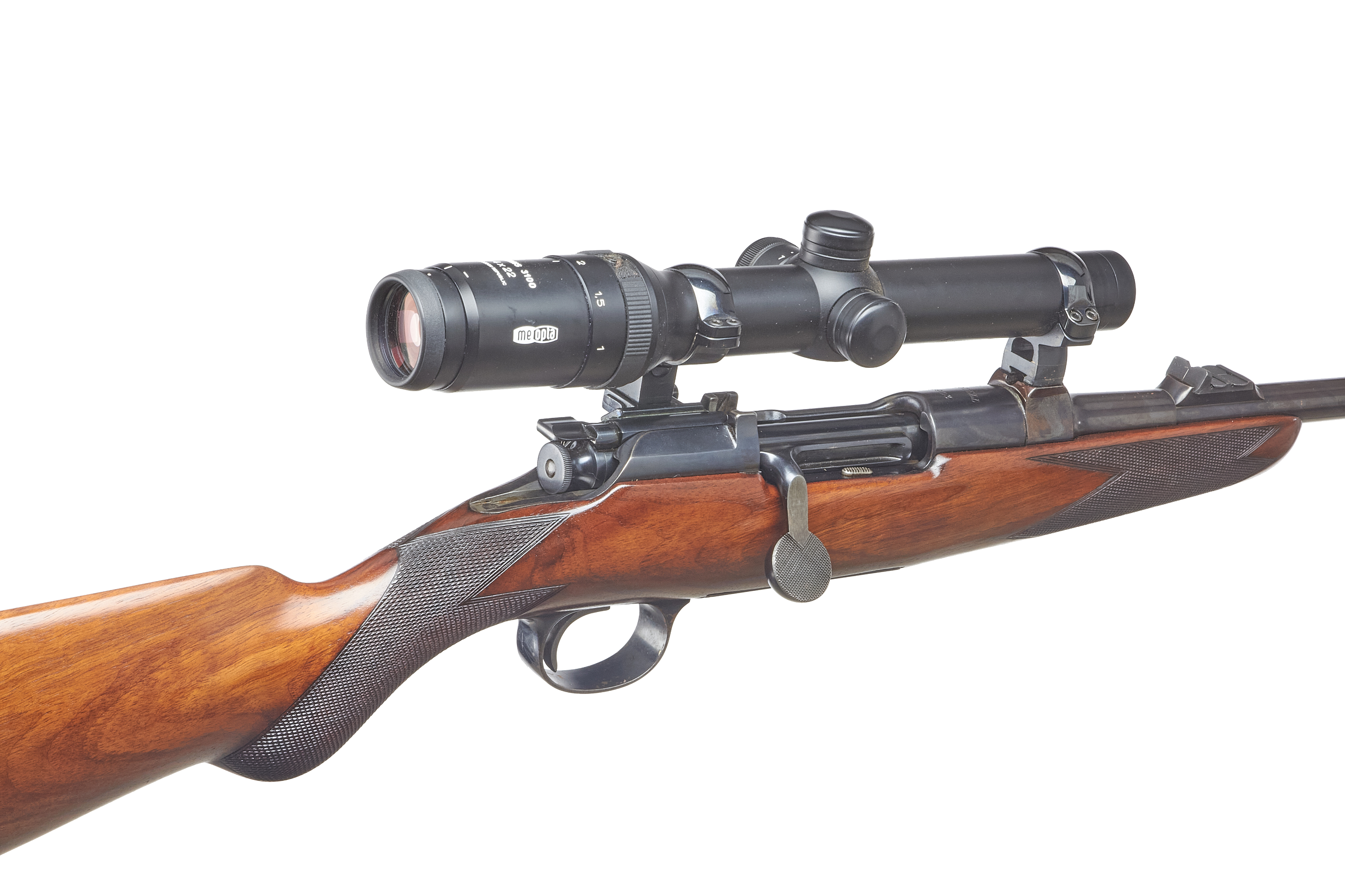 Plain rubber butt pad with ebonite inlay, walnut stock, rounded chequered grip, same to forend. Bead foresight, sling eye, two leaf and notched, fixed rearsight. CW Meopta Artemis 1-4 X 22 3100 scope mounted on quick detachable claw mounts (forward of the breech) and rear, side mounts.