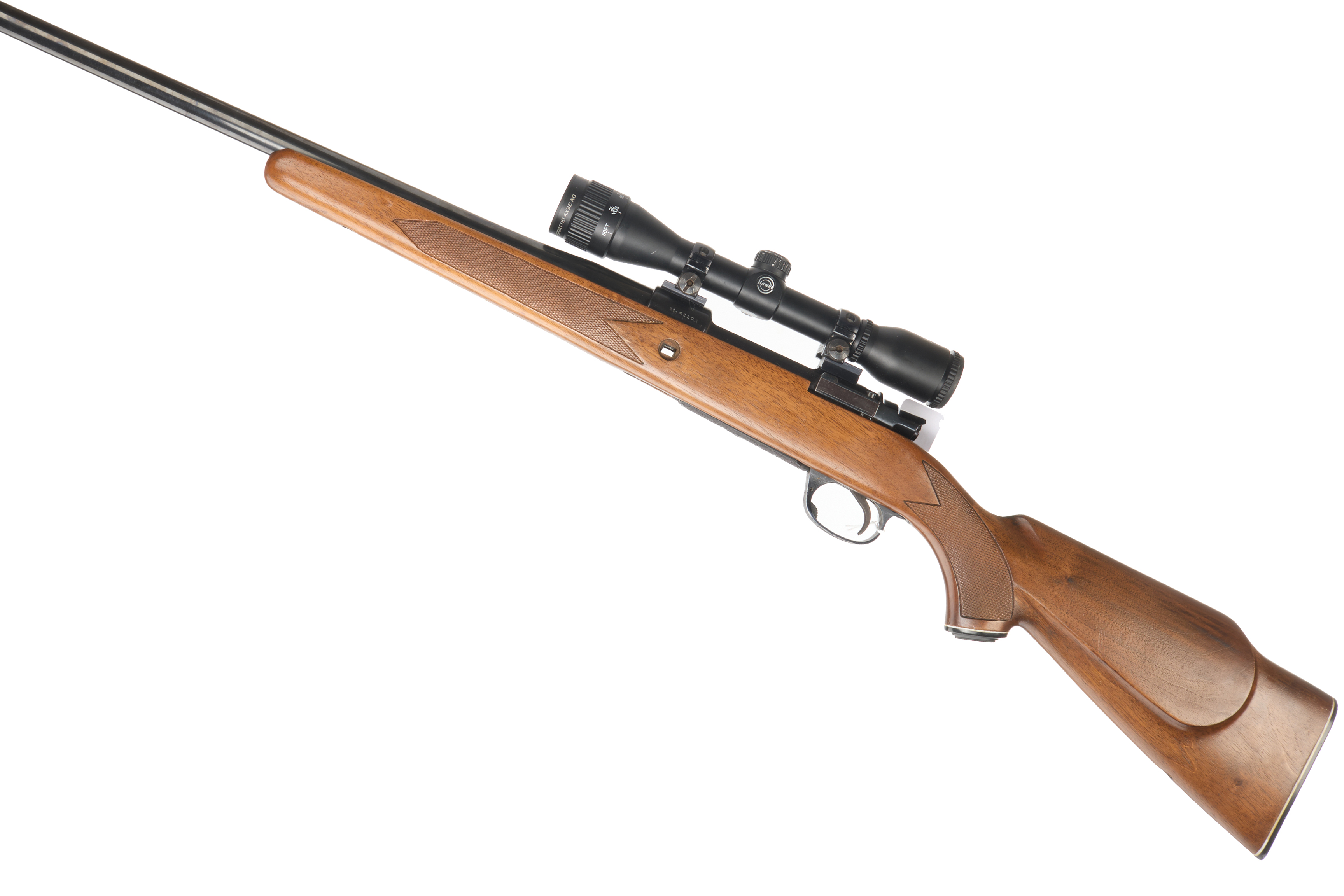 Hard butt, raised cheek comb, chequered semi-pistol grip and forend, the same rounded. Plain muzzle, unsighted barrel. HAWKE HD 4×32 AO scope. Internal magazine with hinged floor plate.