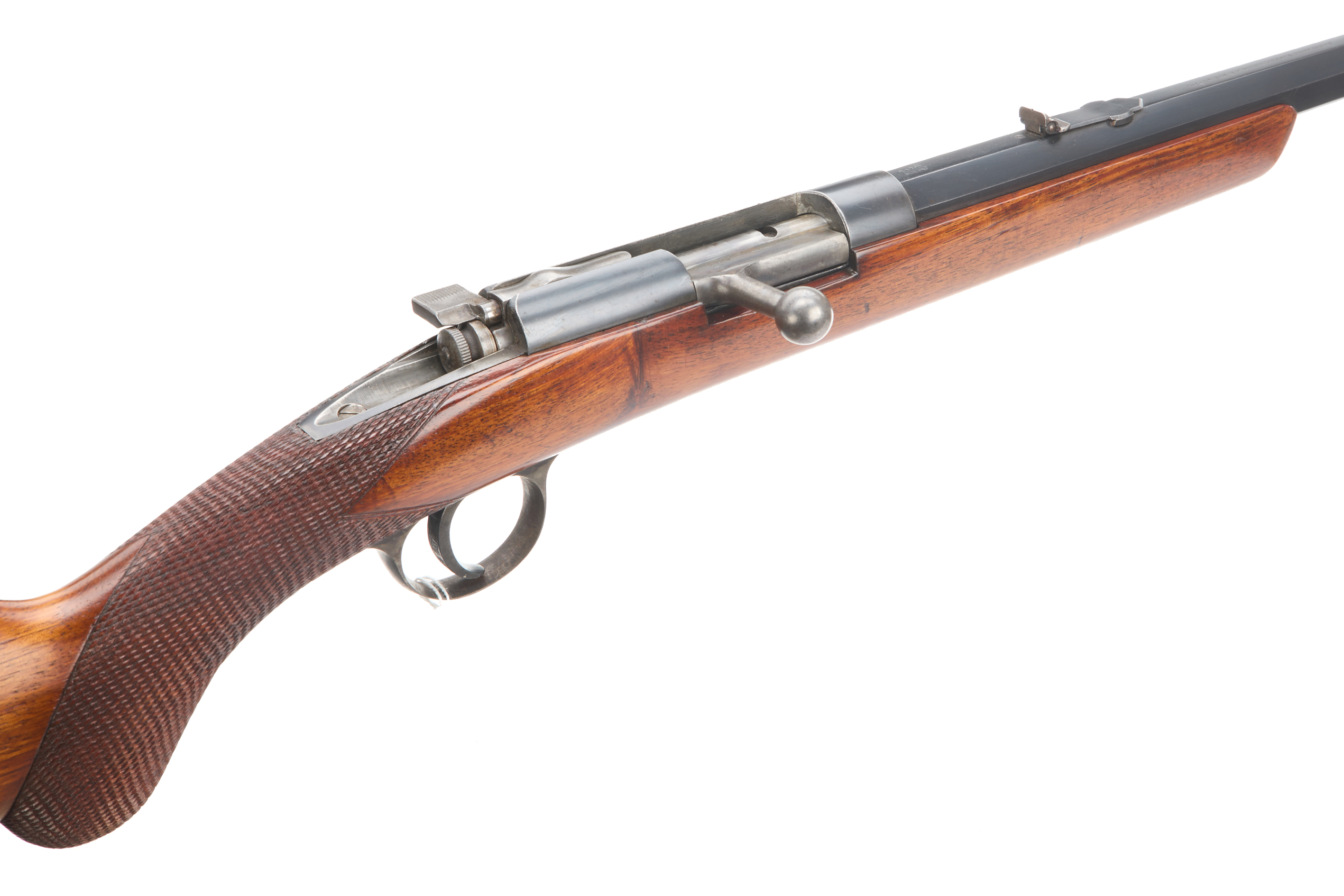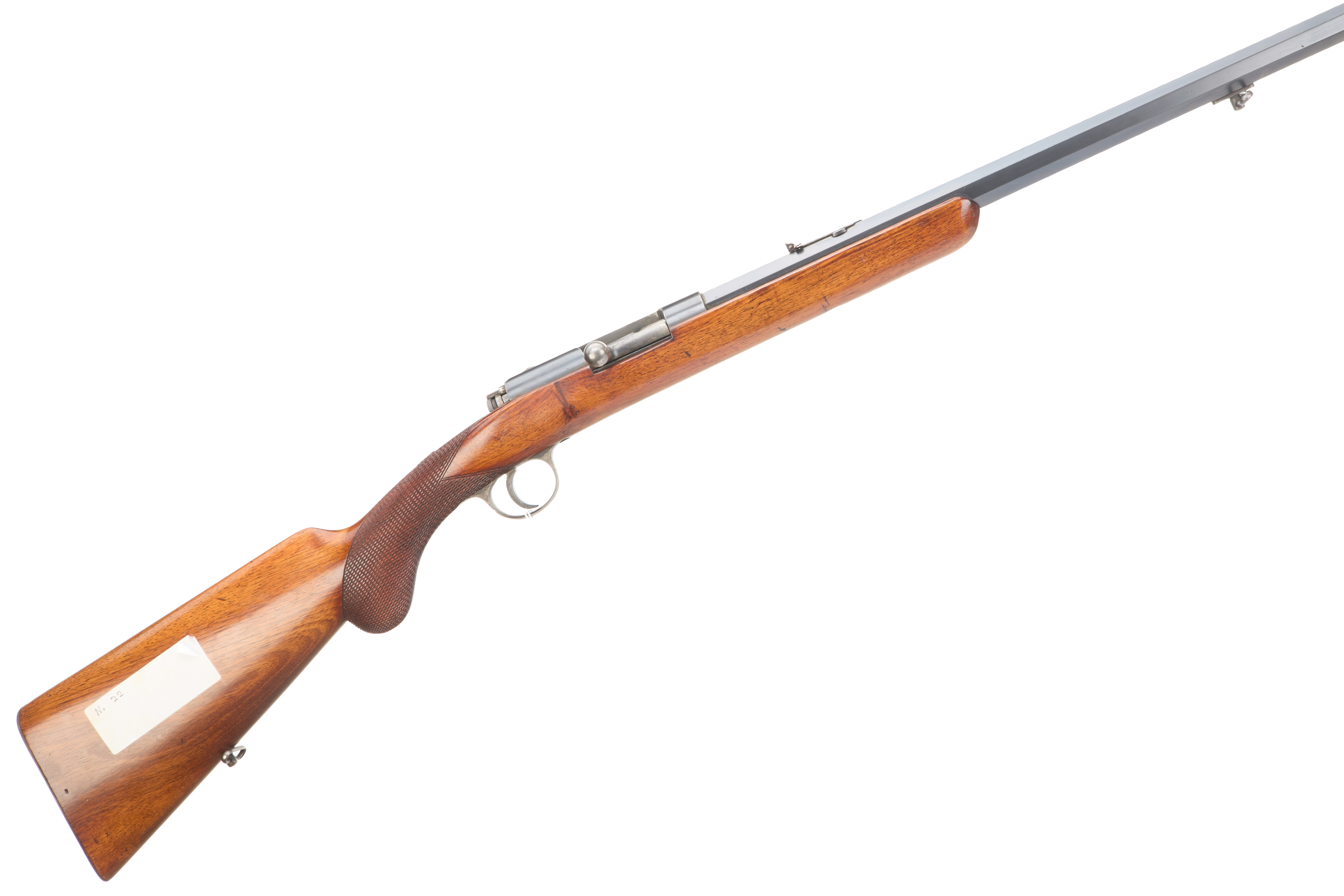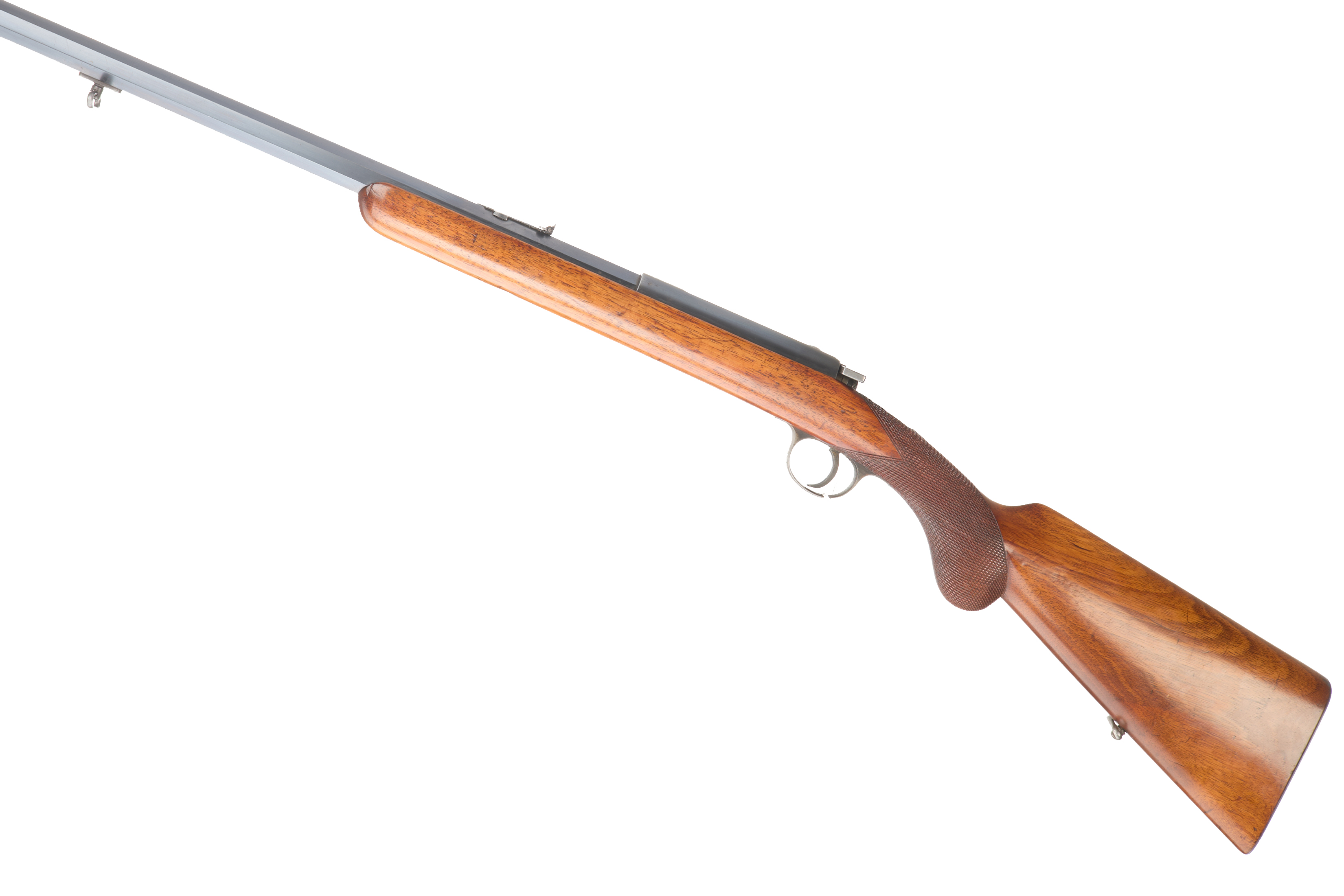 Curved metal butt plate retaining its original finish, plain stock, chequered, rounded pistol grip. Heavy, hexagonal barrel, silvered post foresight, dual notched rearsight. Single-shot, flag safety.