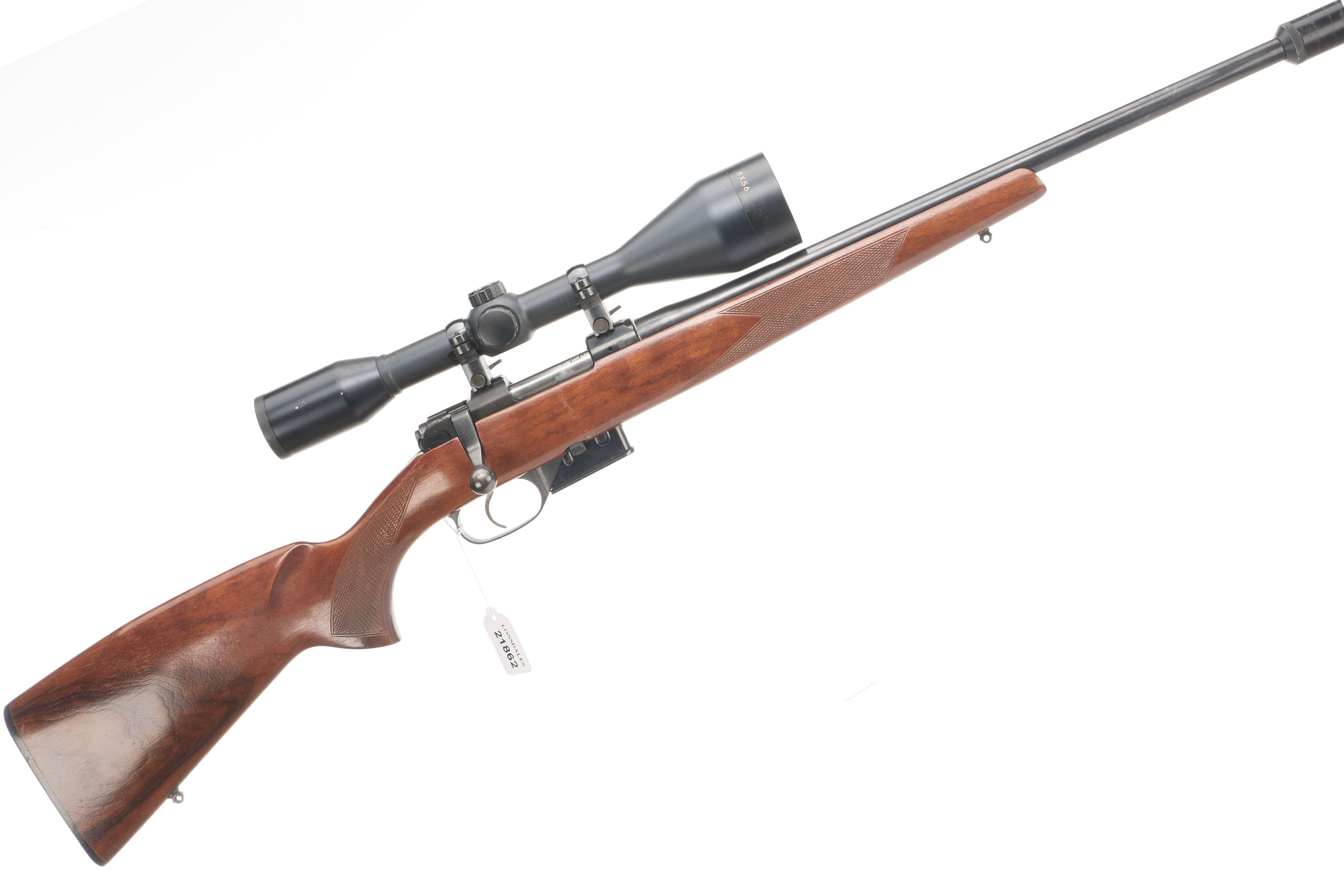 Hard rubber butt pad, raised cheek piece, chequered pistol grip and foreend. Edgar Brothers 8×56 scope. Moderator attached. CW detachable magazine. Thumb safety.