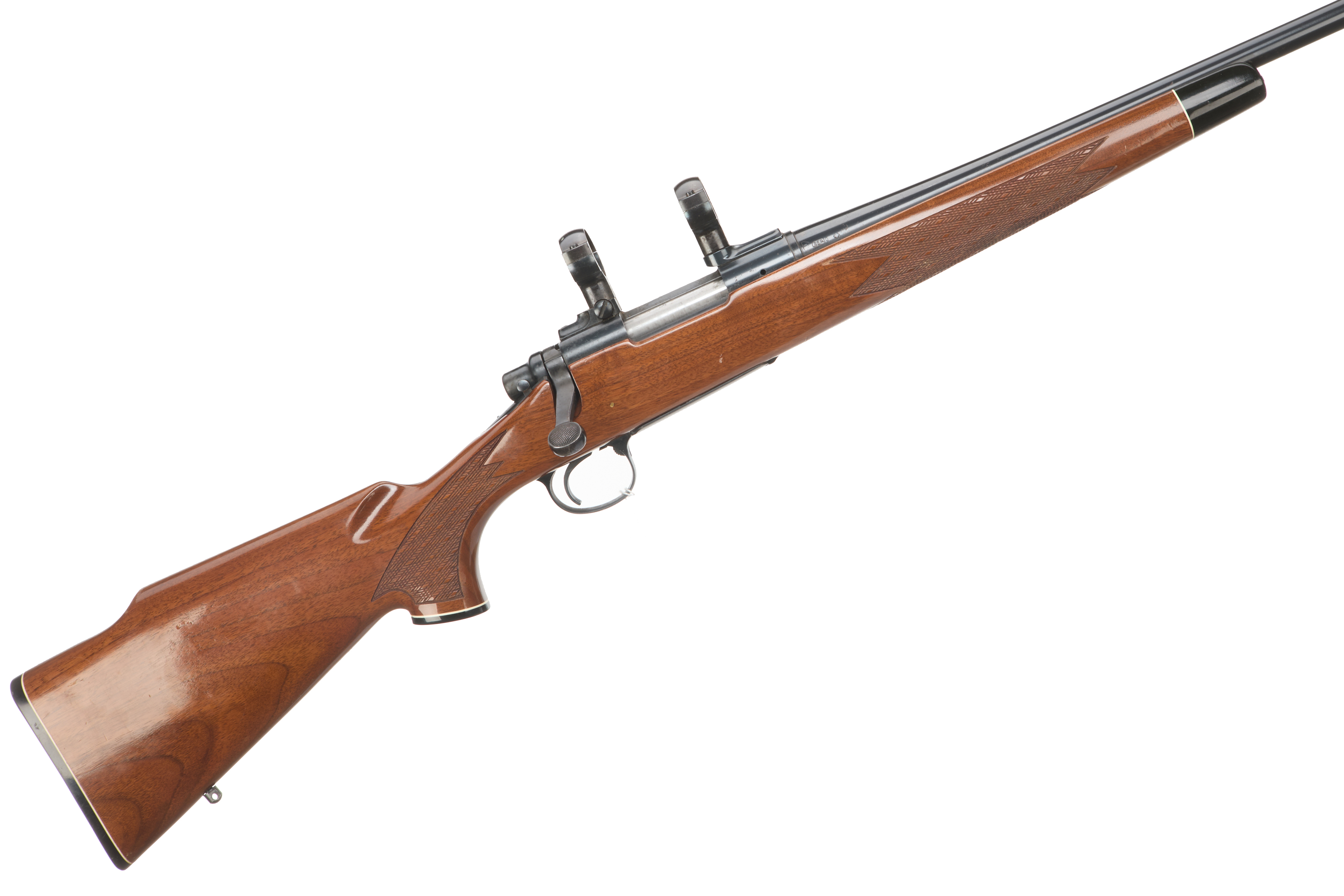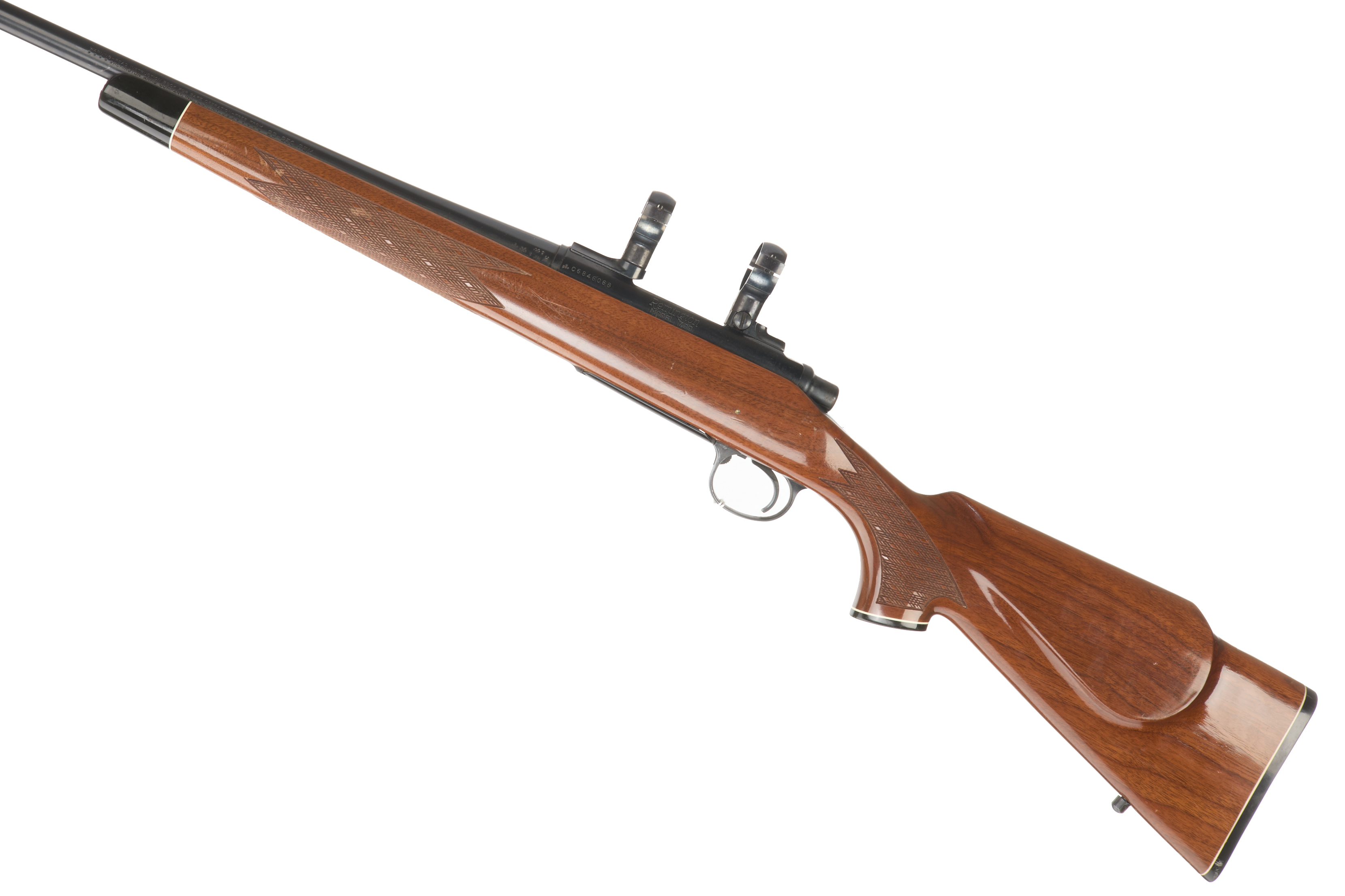 Hard butt, chequered semi-pistol grip, rounded forend both with ebonite end caps. Screwcut muzzle, unsighted barrel, 30mm scope rings, internal magazine with hinged floor plate.