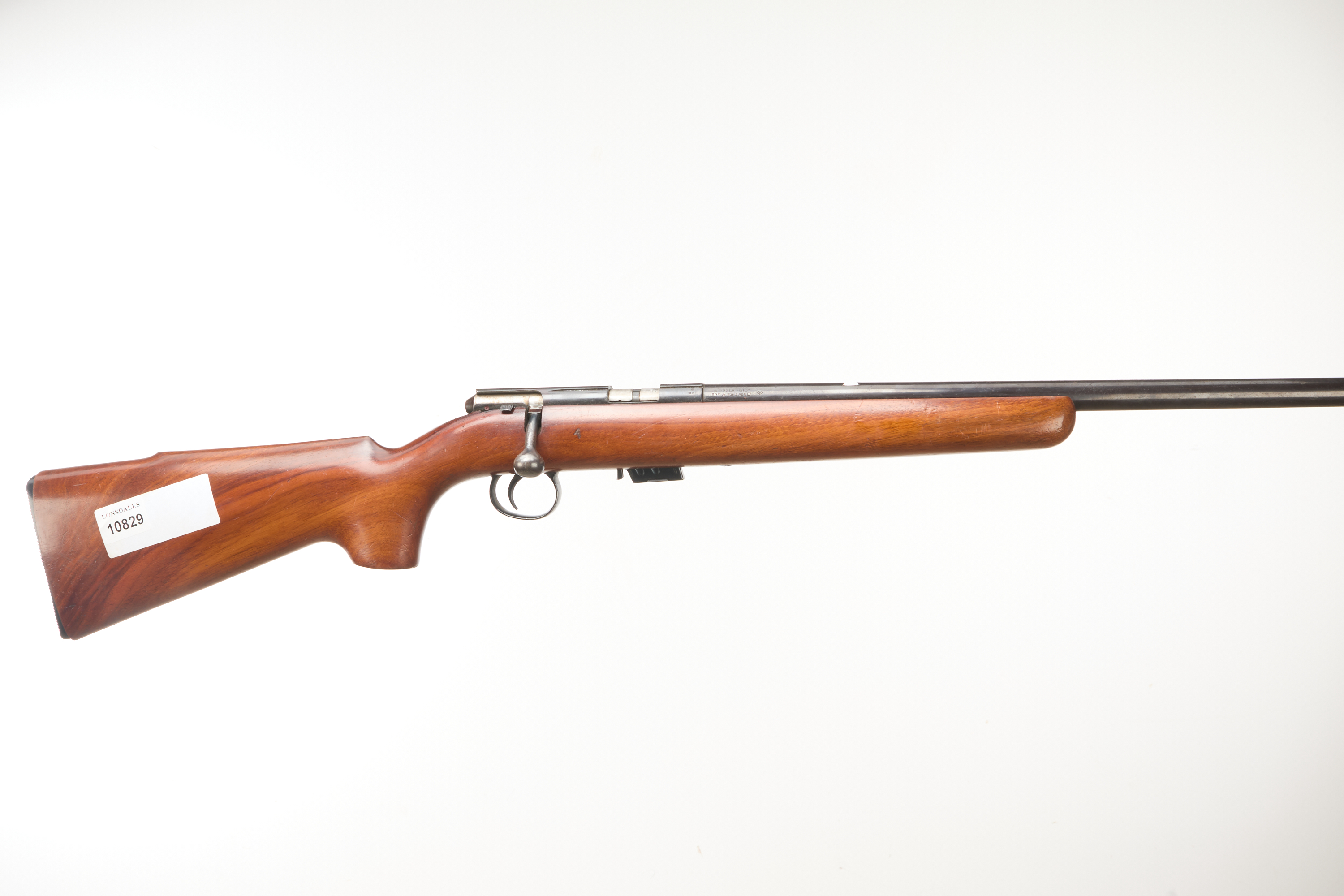 Hard plastic butt pad, raised cheek piece, fore sight, screw top. Detachable magazine. Thumb safety.