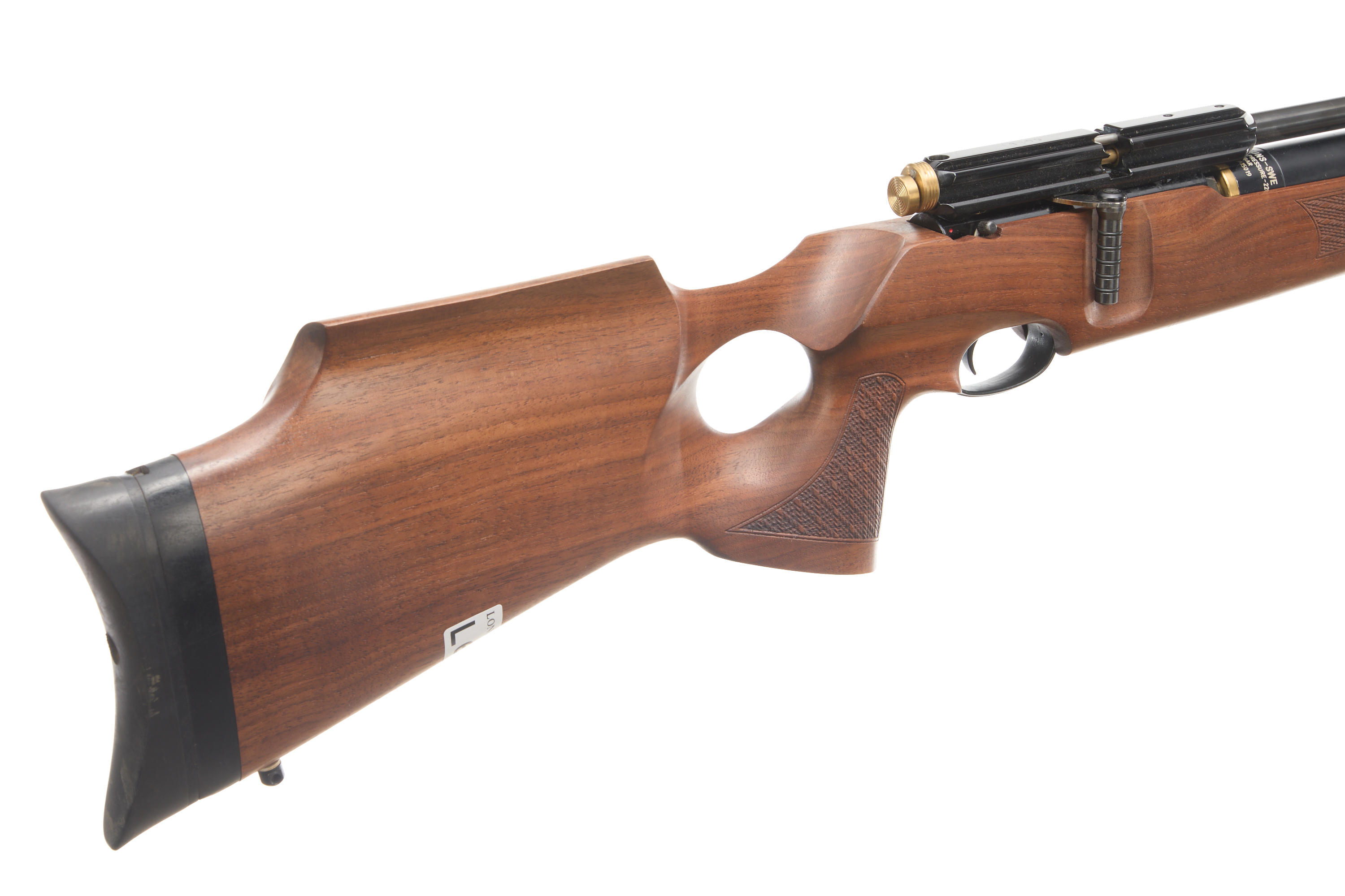 Rubber butt pad. Chequered thumbhole grip stock with raised cheek piece. Screw cut barrel (thread protector absent). Dovetail scope rail. Front and rear sling swivels.