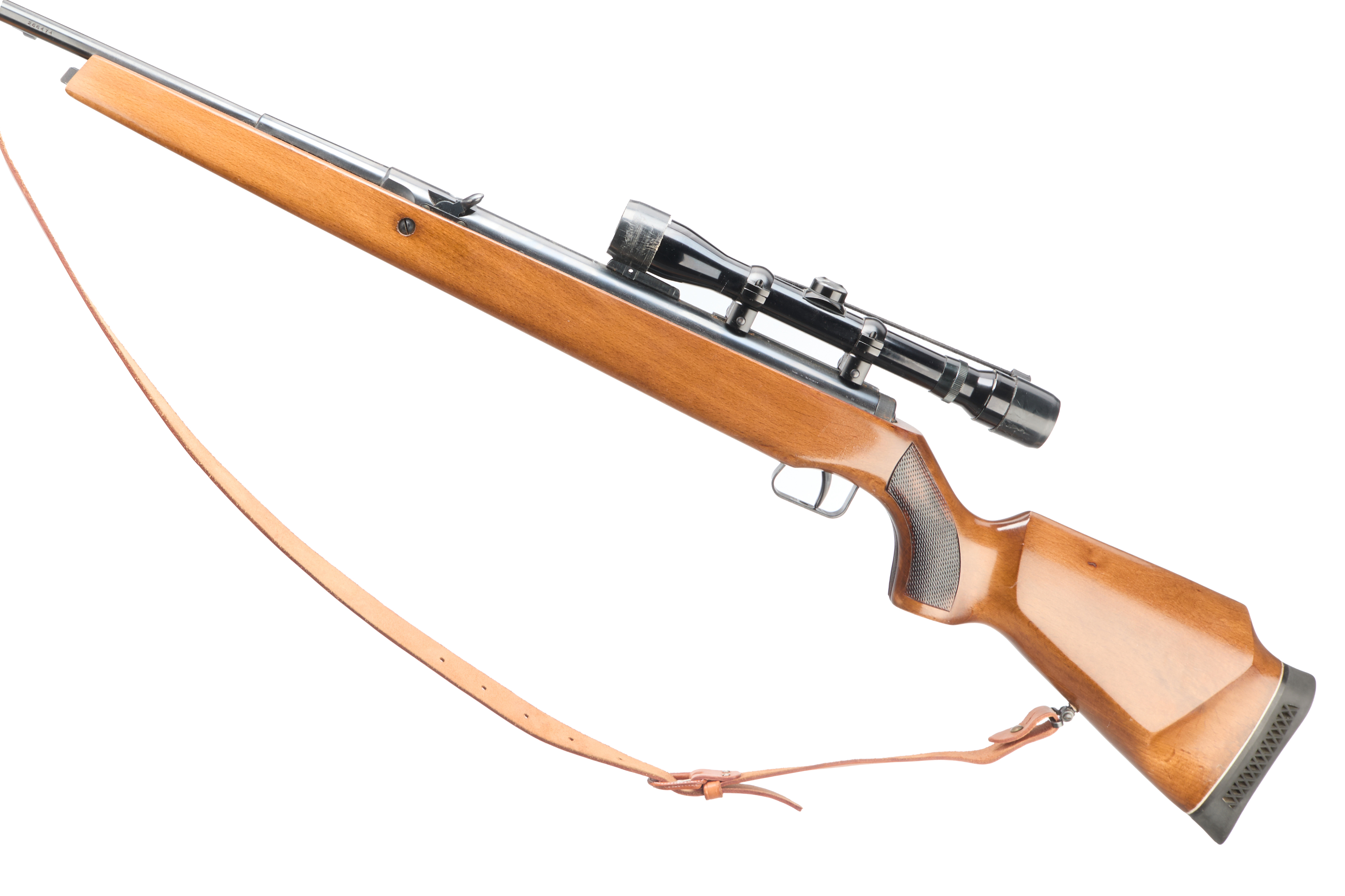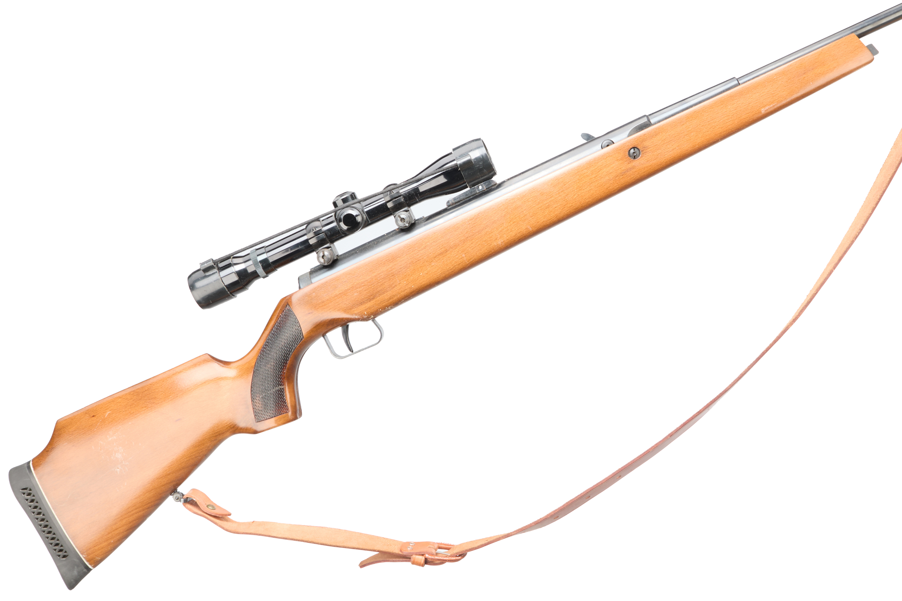 Raised cheek piece, chequered pistol grip. Tunnel foresight, rear sight absent. Swing loading gate, CW rhino 4 x 32 scope. CW leather sling.