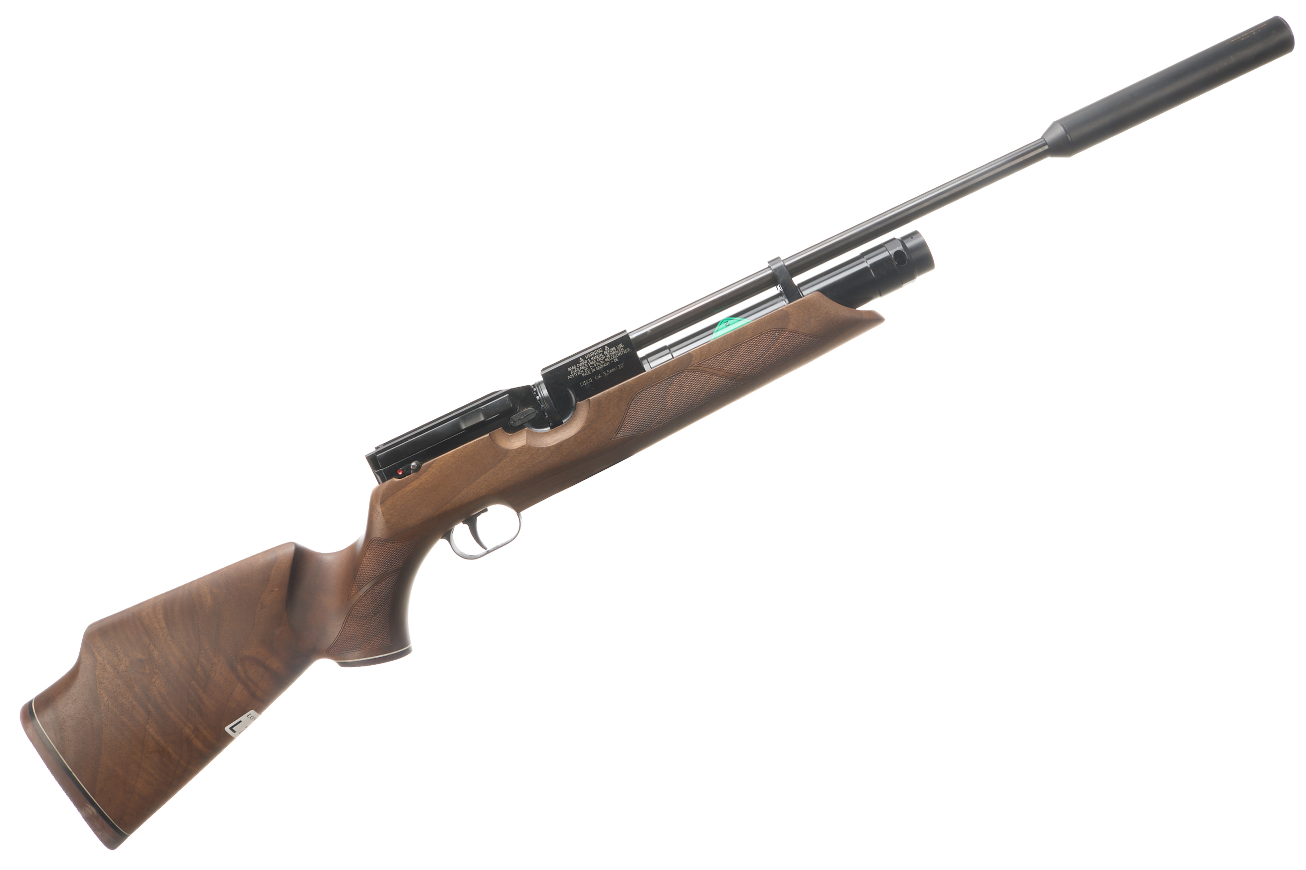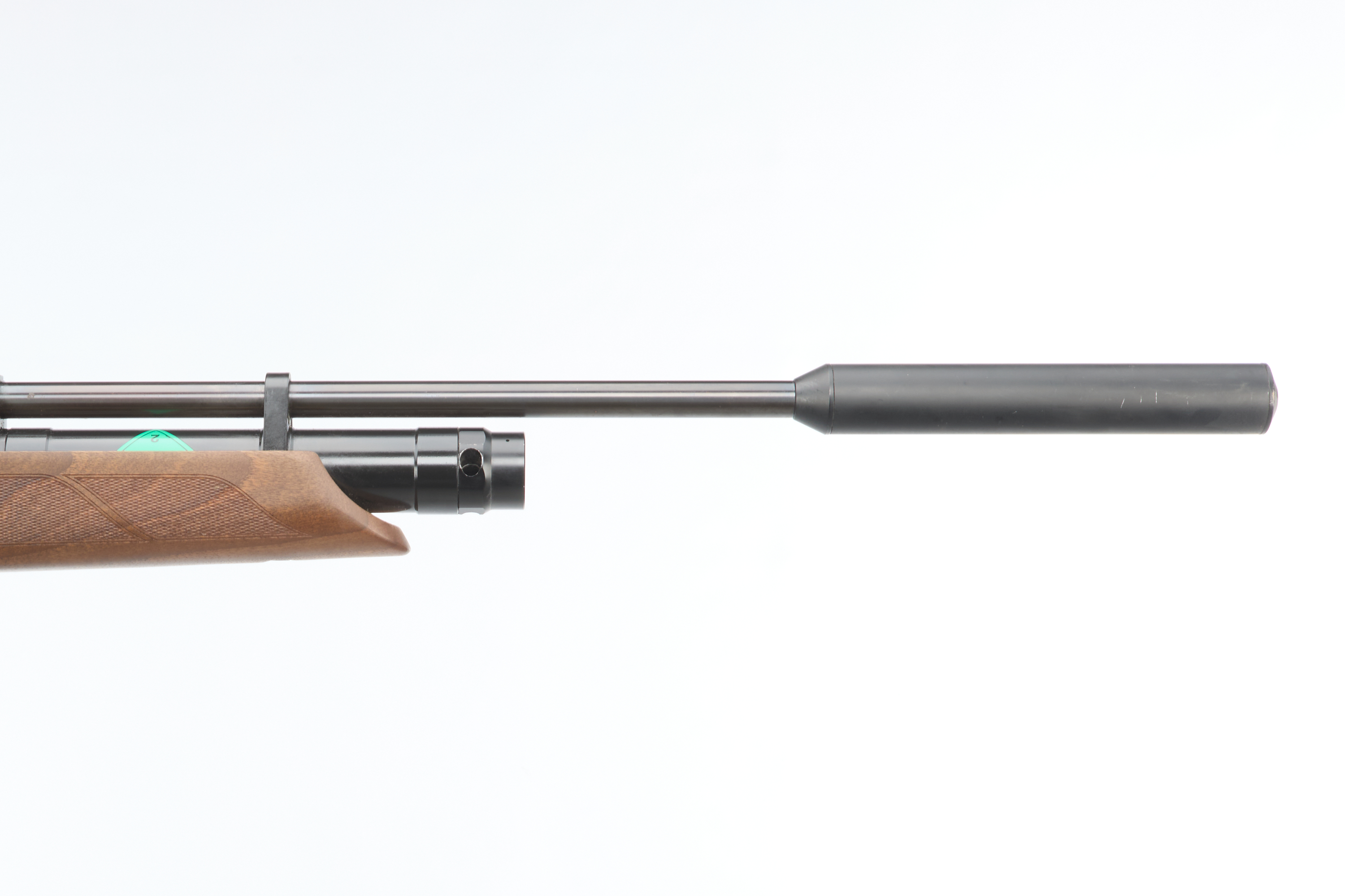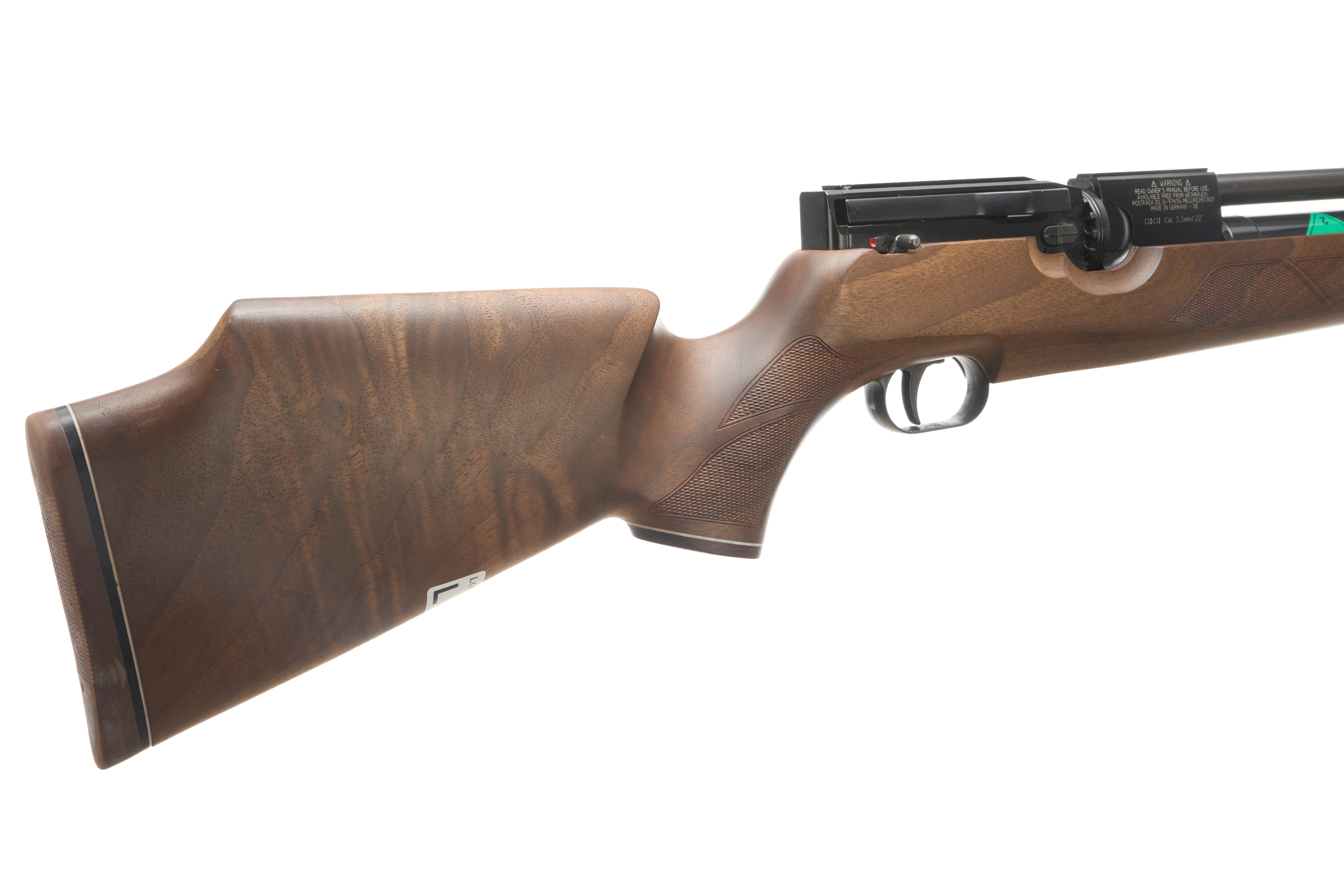 Soft rubber butt pad, raised cheek piece. Chequered grip and forend, dovetail scope rail. CW 2 magazines. CW moderator.