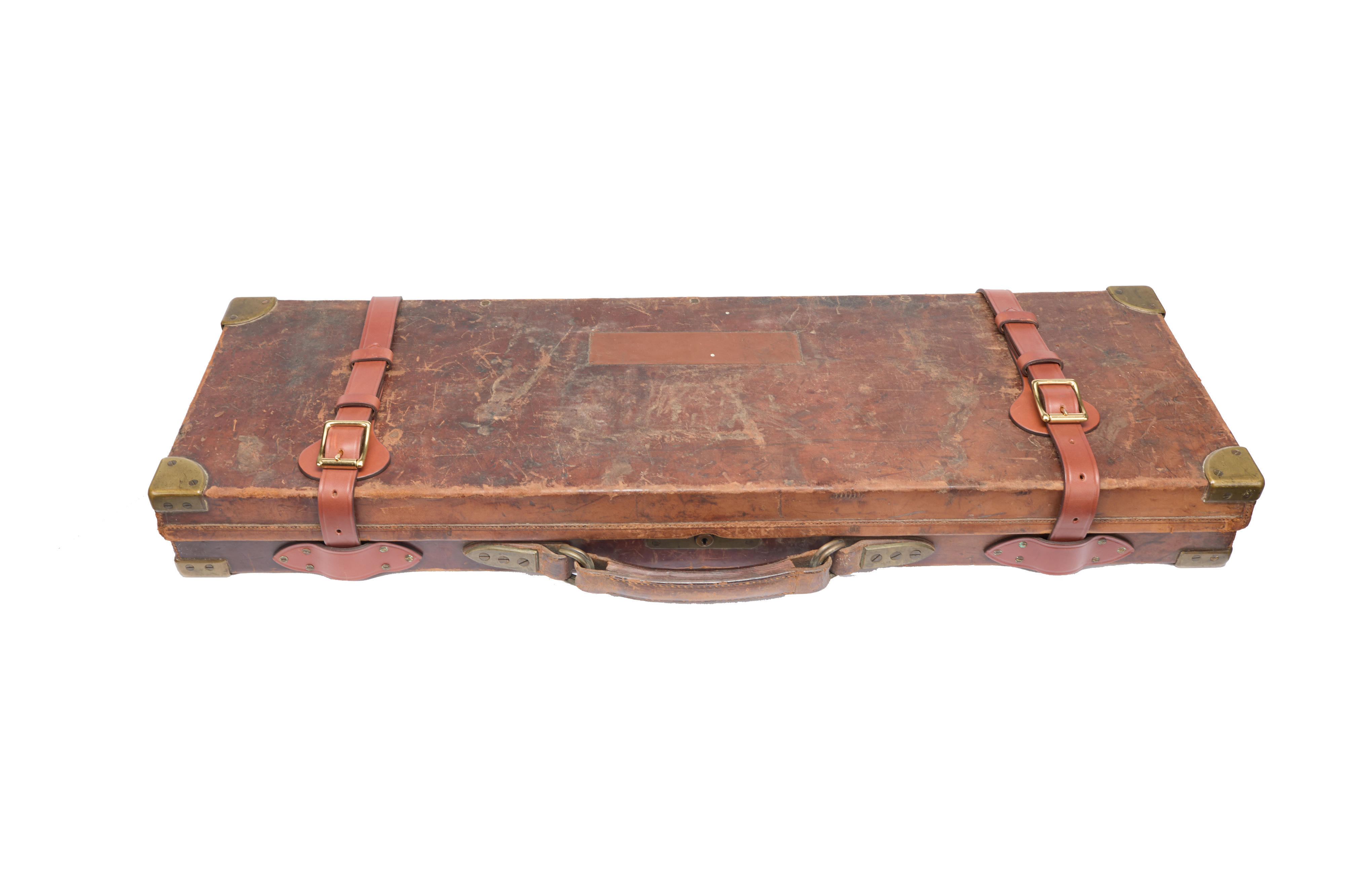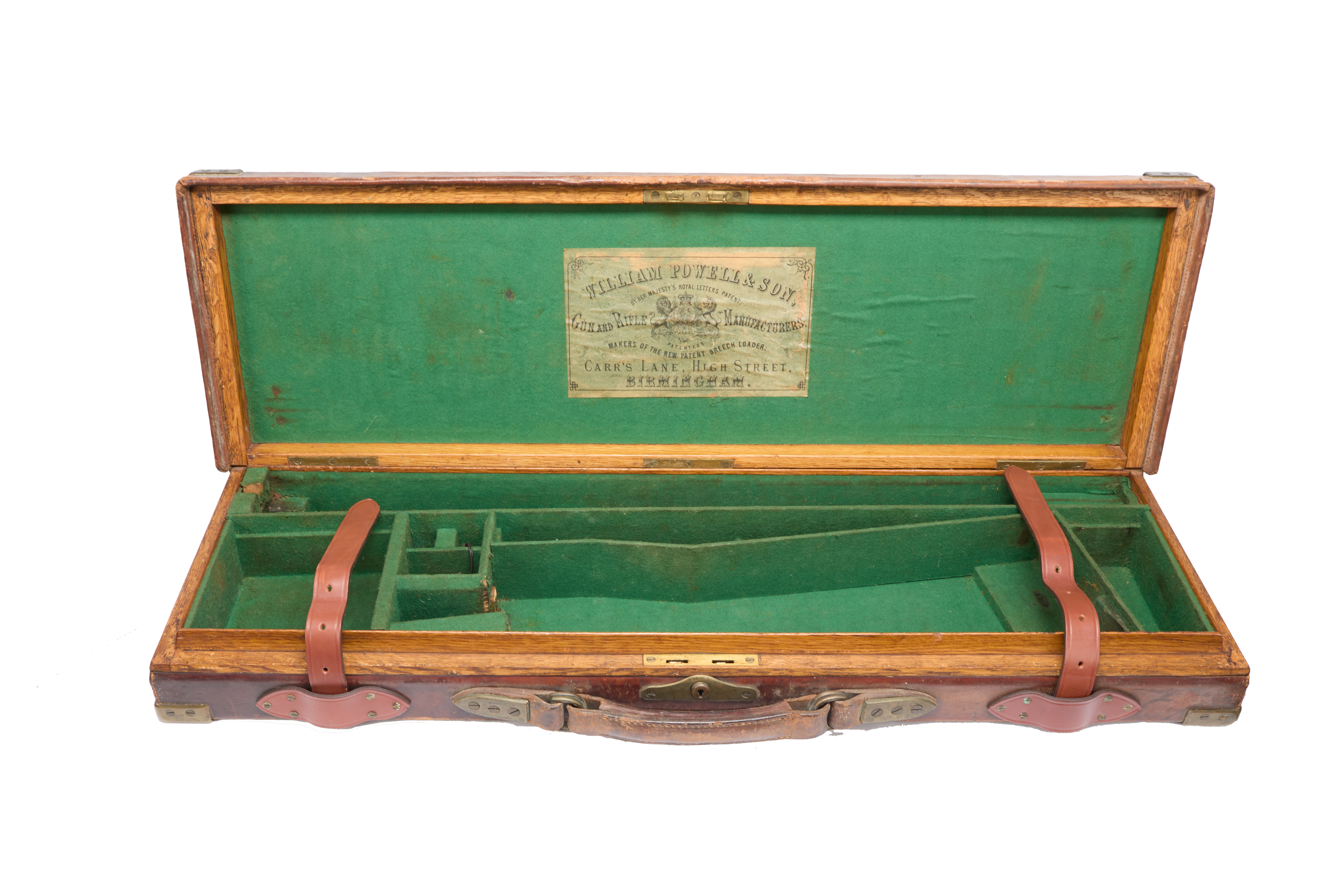 WILLIAM POWELL A LEATHER AND OAK CASE WITH BRASS CORNERS.