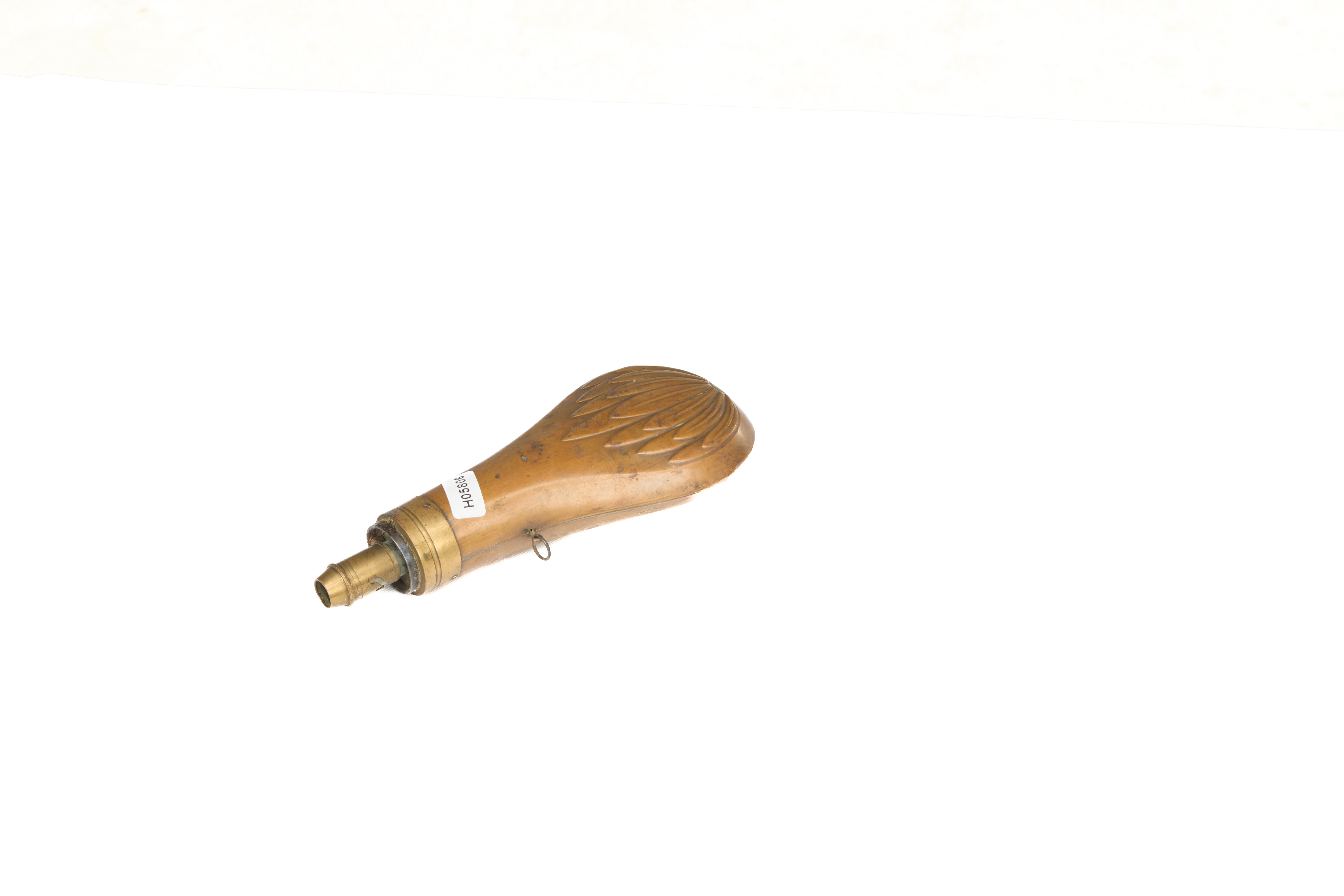 Lot 1280: A COMMON TOP COPPER AND BRASS POWDER FLASK. EMBOSSED BODY WITH HANGERS. GRADE 2.