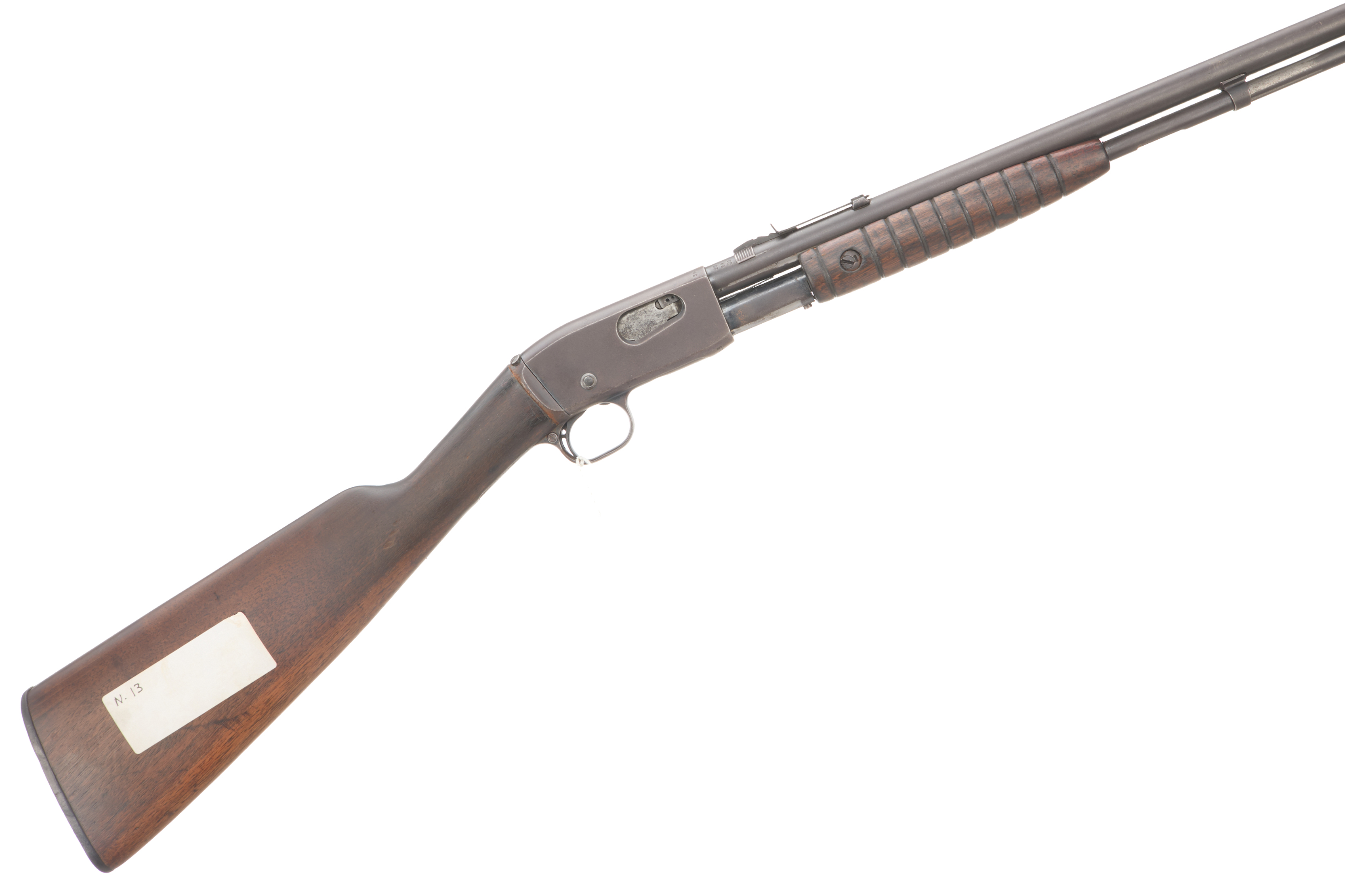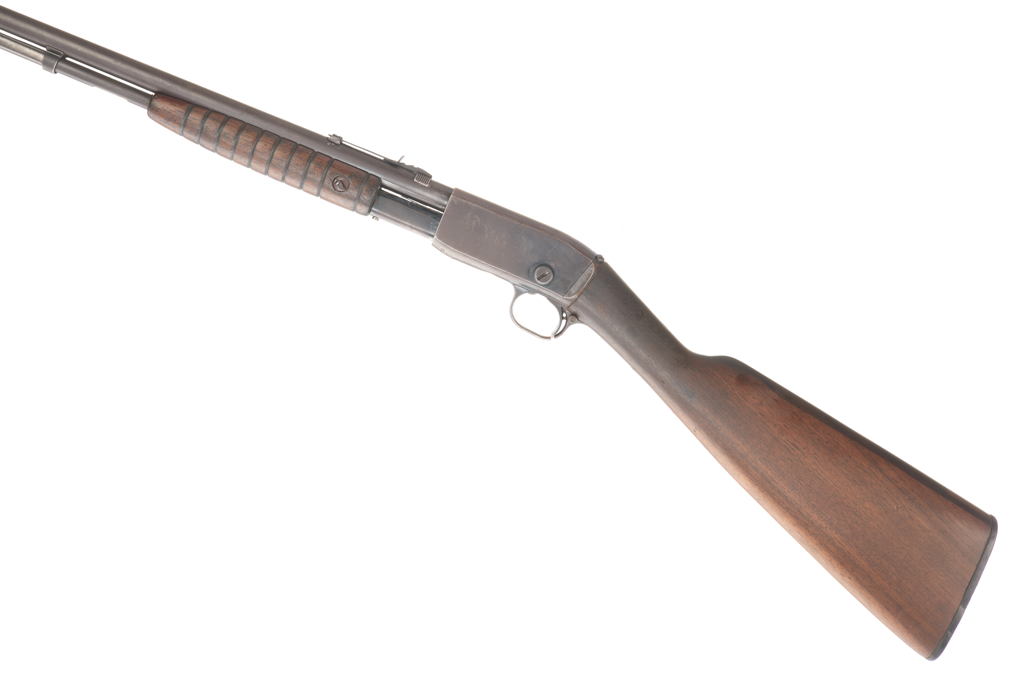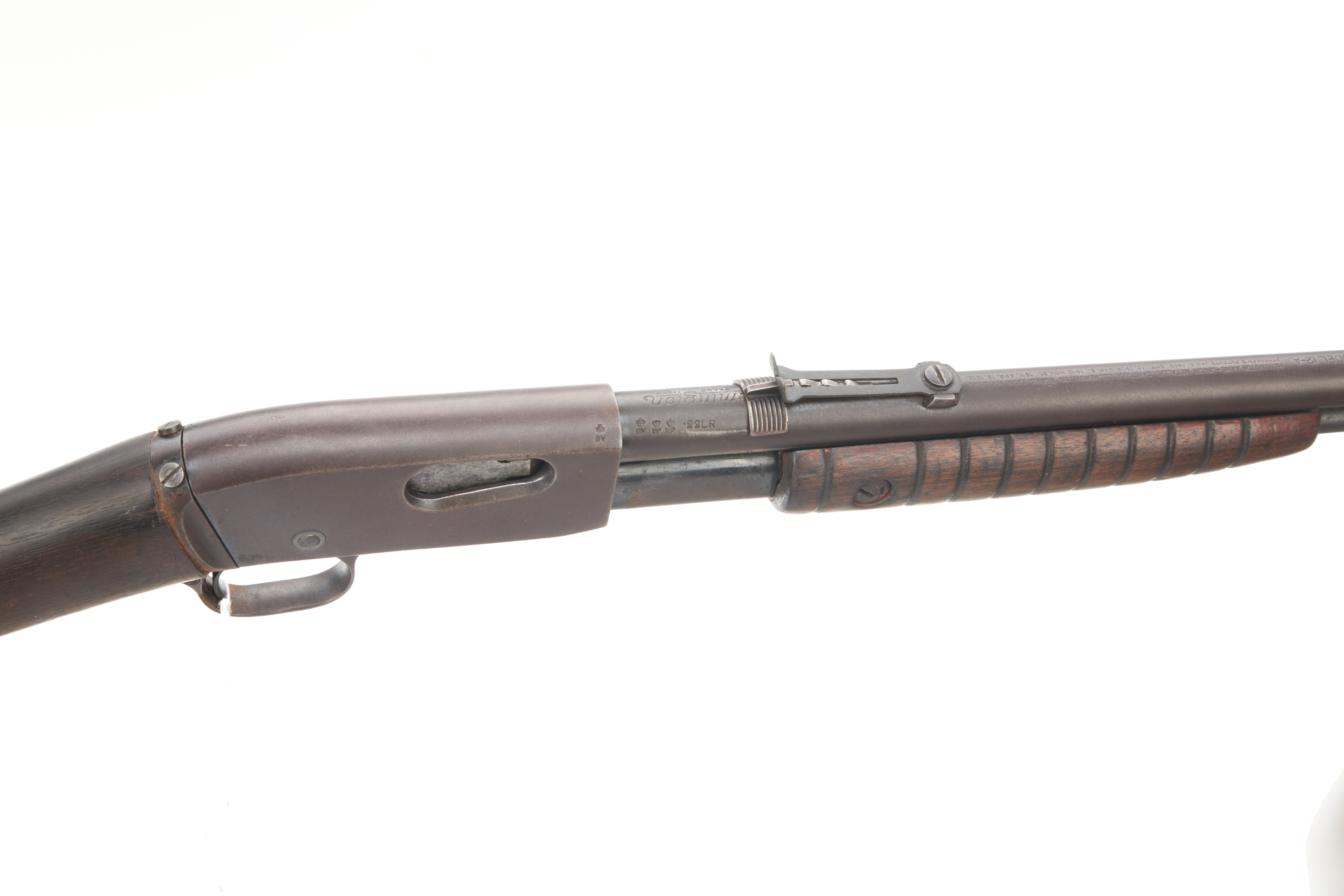 Plain stock, tubular magazine, post foresight, leaf spring rearsight.