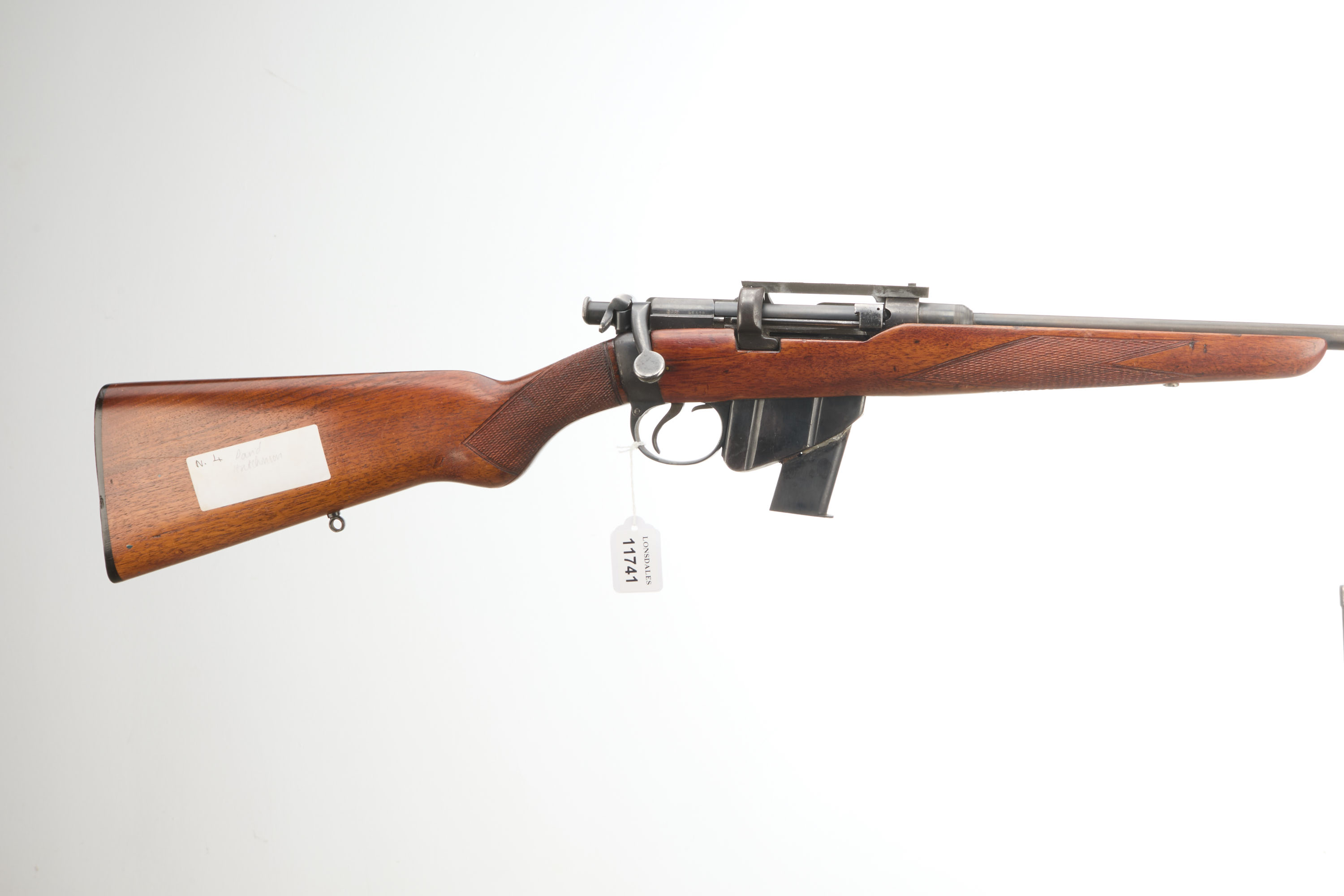 Chequered semi-pistol grip and forend, unsighted barrel, Parker Hale scope mount rail, Long Lee action. .45 ACP magazine welded into original magazine and bolt mounted safety.