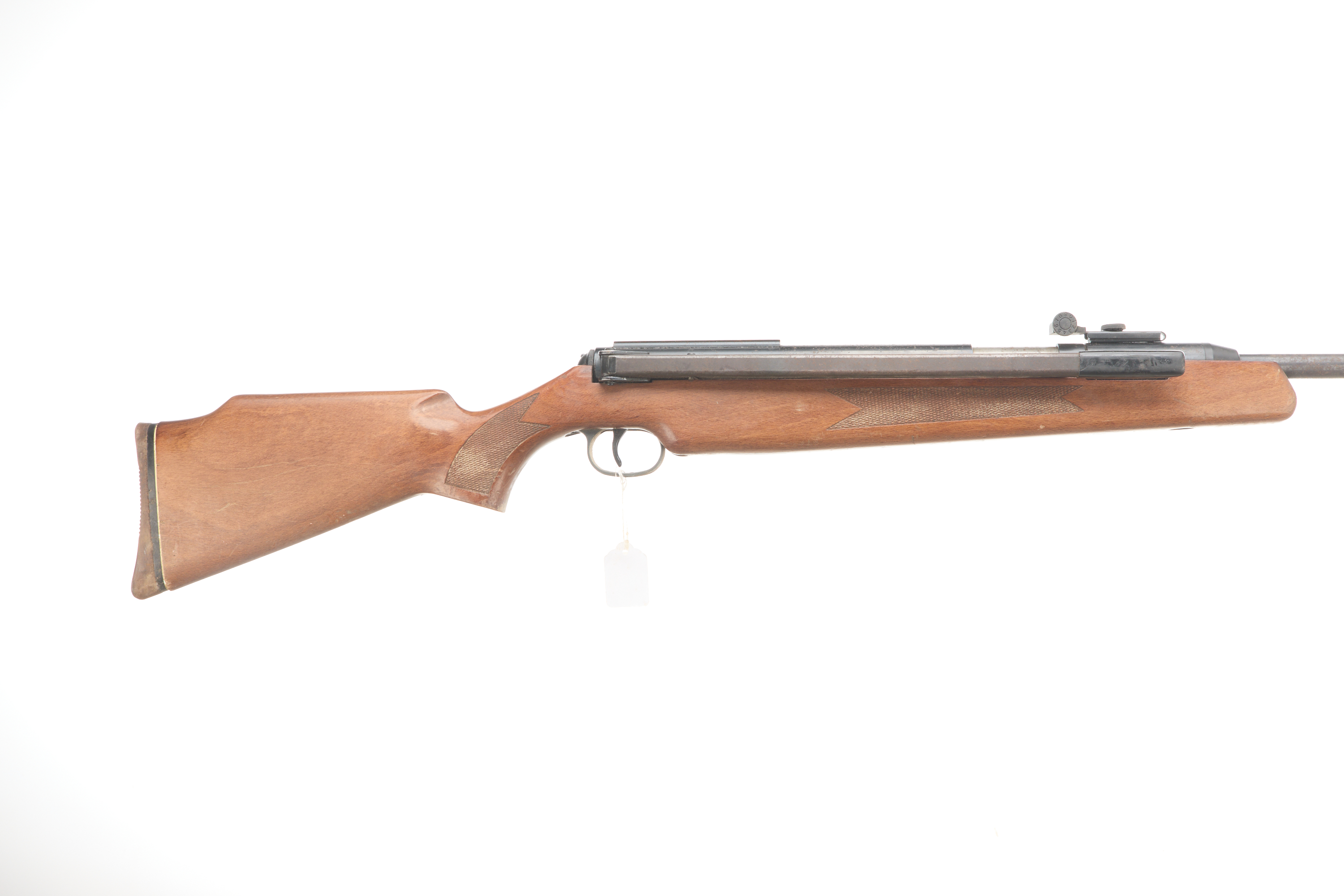 Fully-formed stock, chequered pistol grip and forend, post foresight, adjustable rearsight. Side cocking lever, side mounted loading hold-back catch, rear safety.