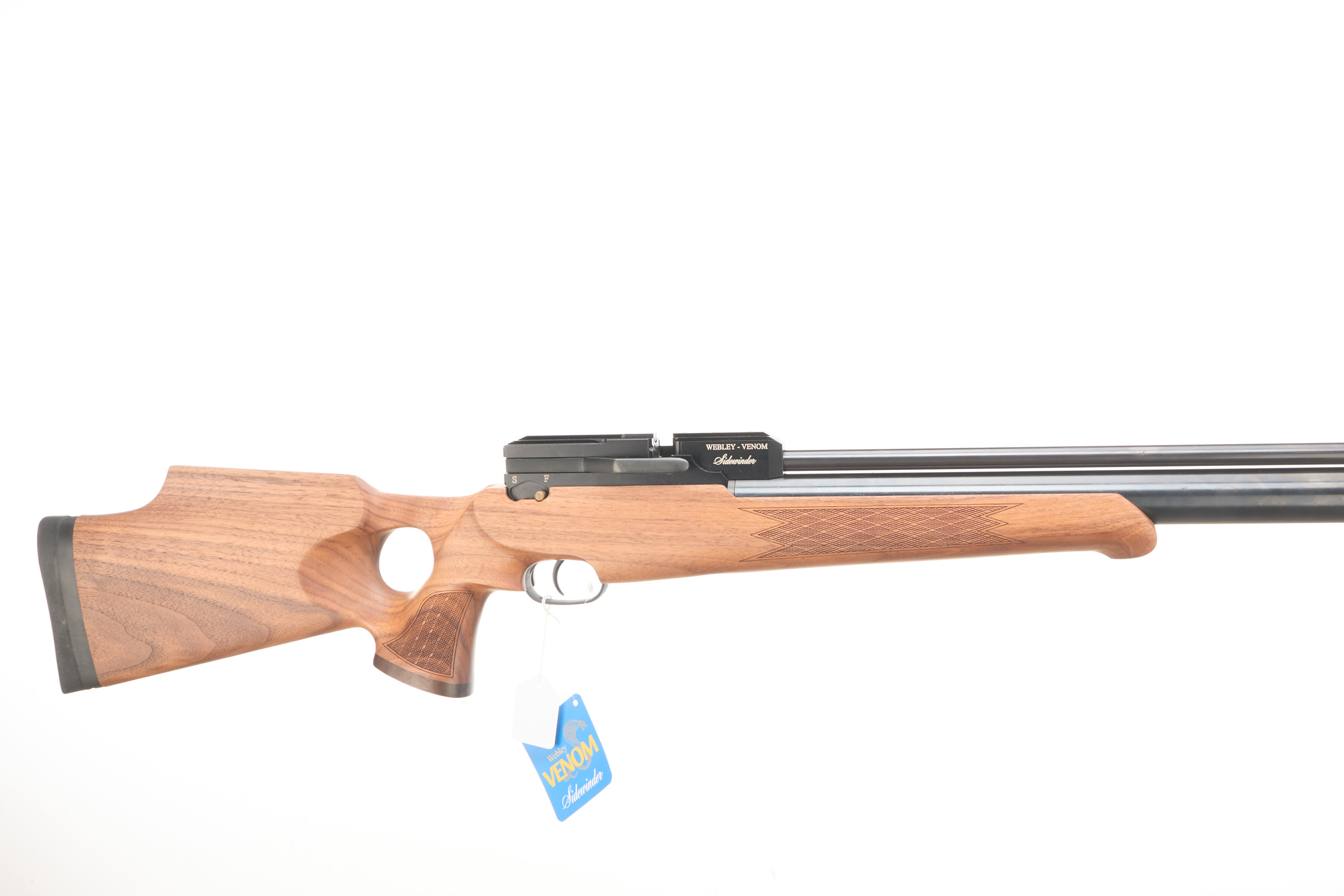 Cushioned butt pad, fully figured, thumbhole stock. Unsighted barrel, scope rail, side safety, cocking handle, magazine absent.