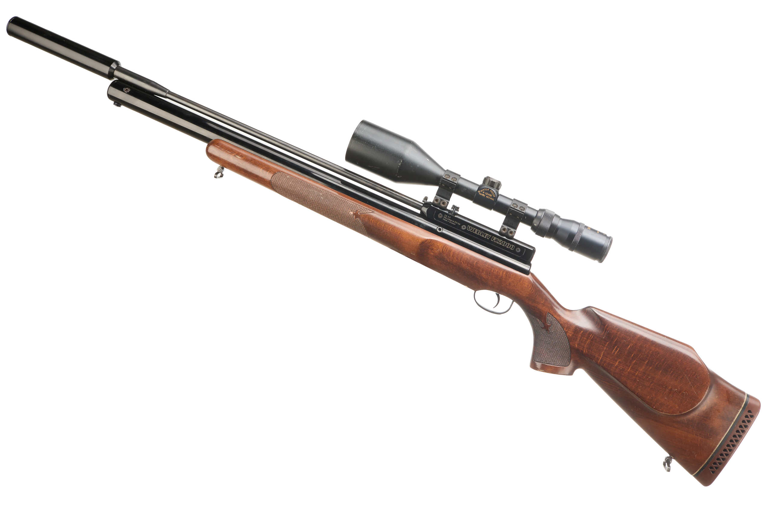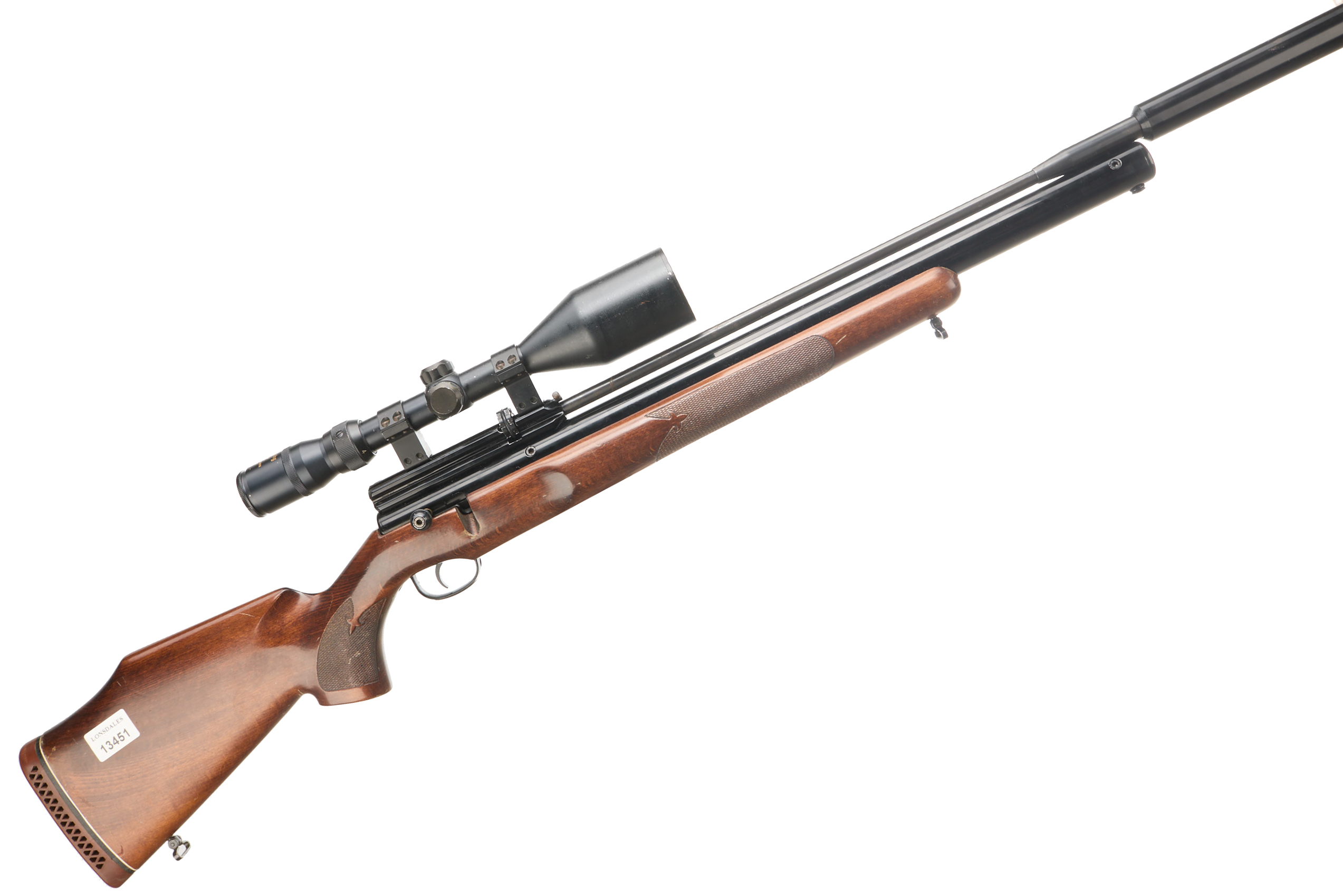 Fully figured stock, chequered pistol grip and forend. Moderator, magazine, Nikko Sterling Gold Crown 4-12 x 56.