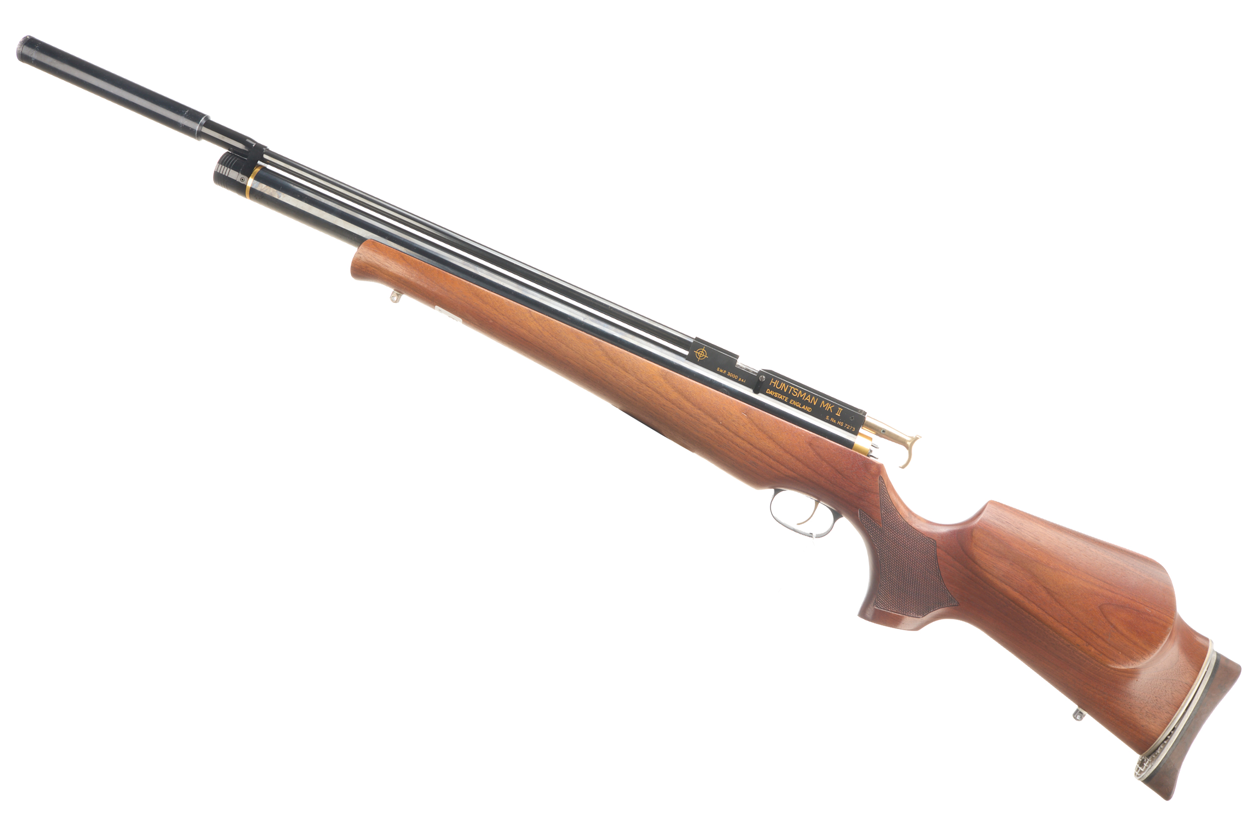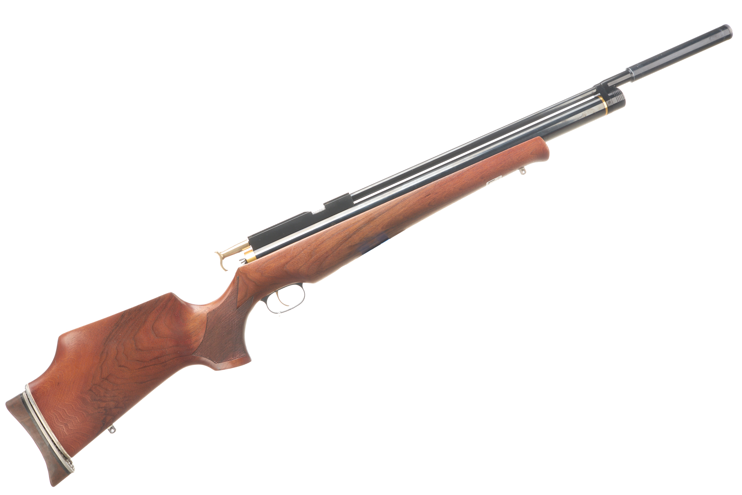 Adjustable butt pad, fully figured stock, chequered pistol grip and forend. Moderator, gold wash trigger, bolt action, single shot, thumb safety.