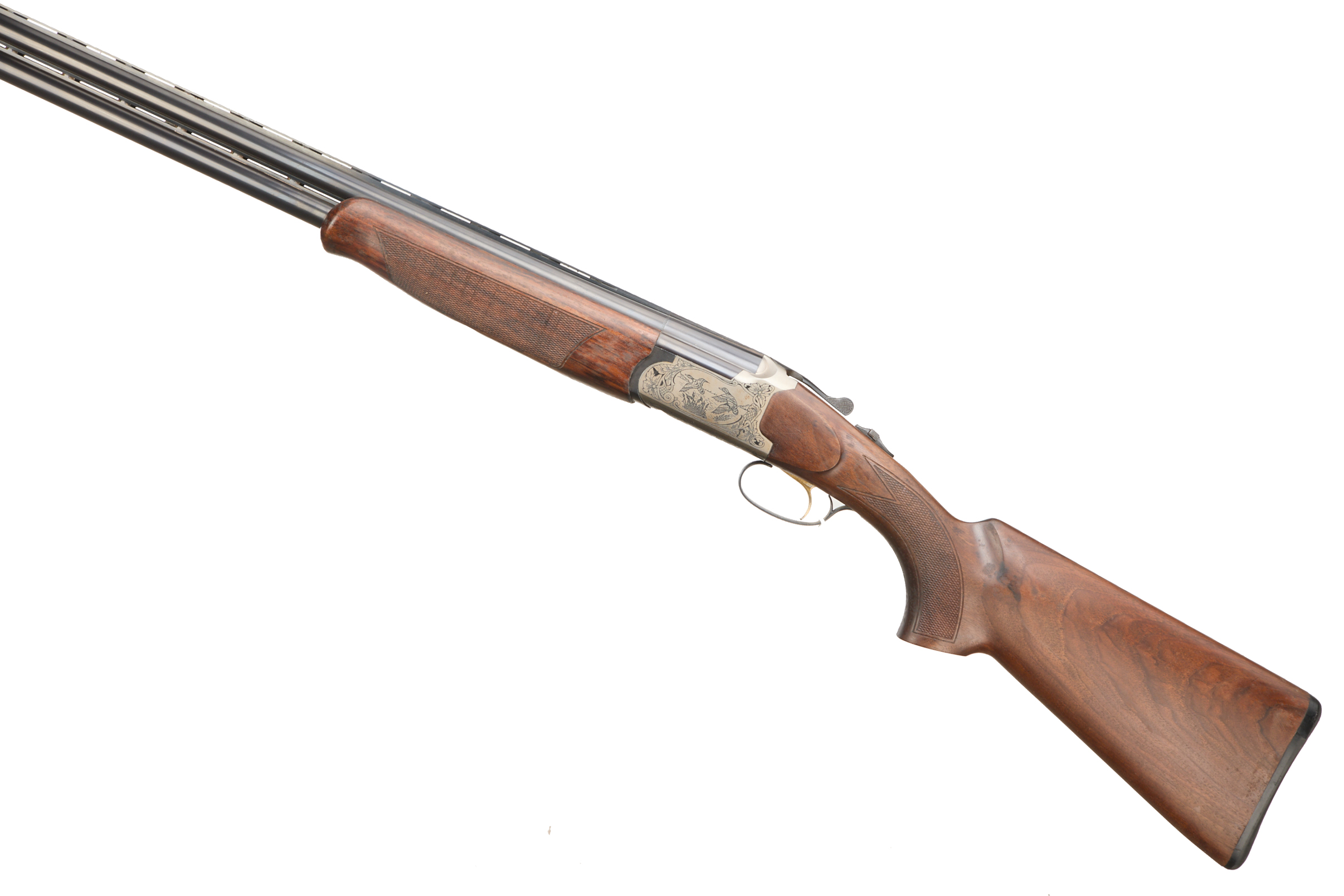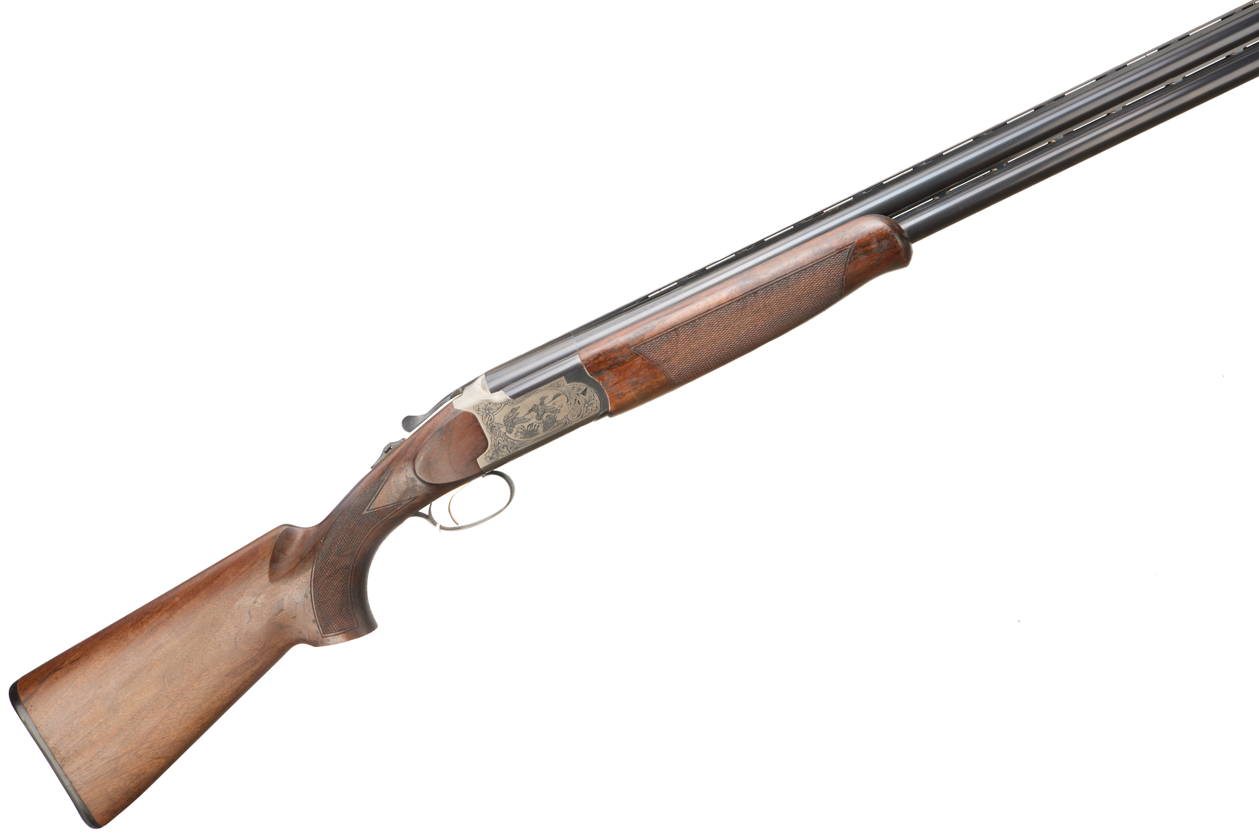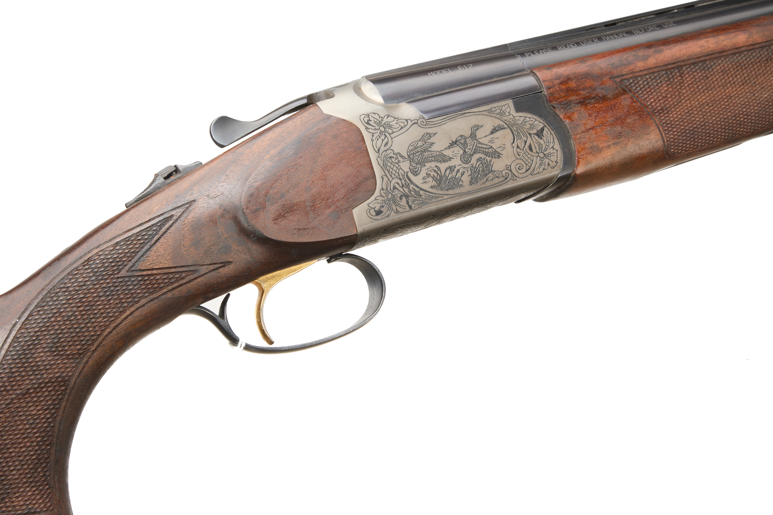 Rubber butt pad, chequered semi-pistol grip and forend, ventilated top and mid rib. Aquatic sporting scene surrounded by floral motifs to action. Gold wash trigger, integrated barrel selector (selective single trigger) and safety.
