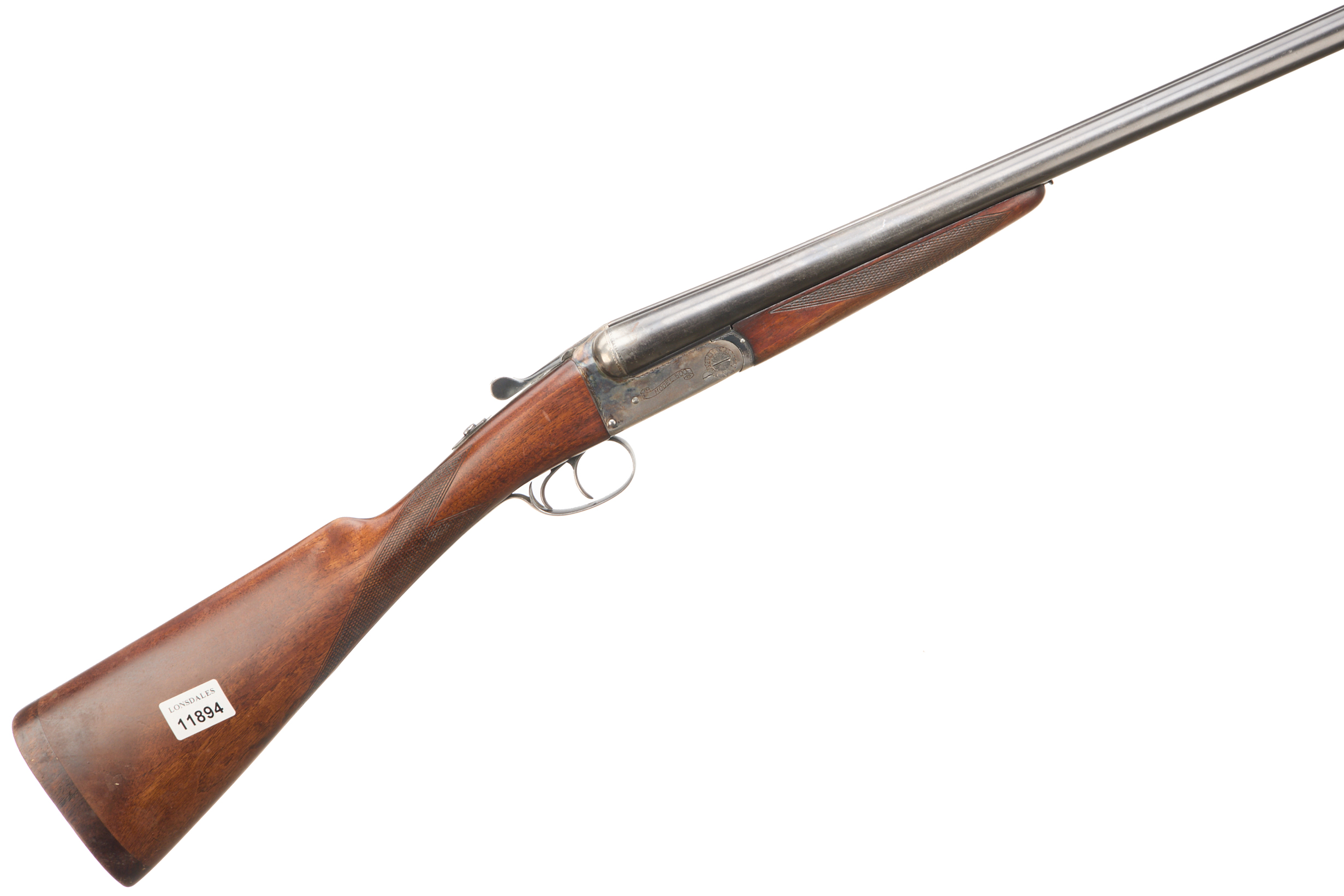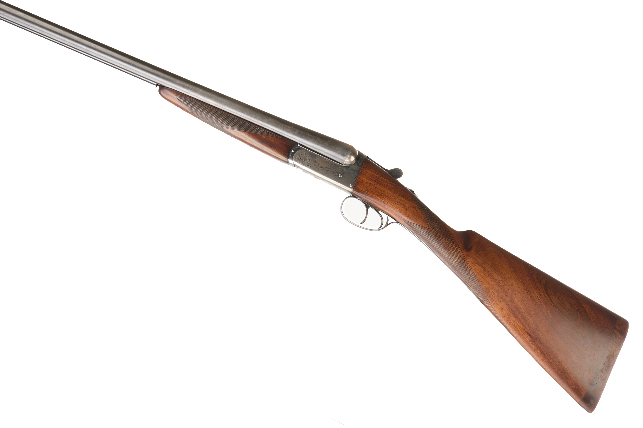 Chequered wooden butt, chequered straight grip and forend. Tapered rib engraved ‘B.C .MIROKU FIREARMS MFG.CO KOCHI, JAPAN’. Top lever, automatic safety. The action engraved ‘MODEL 500’.