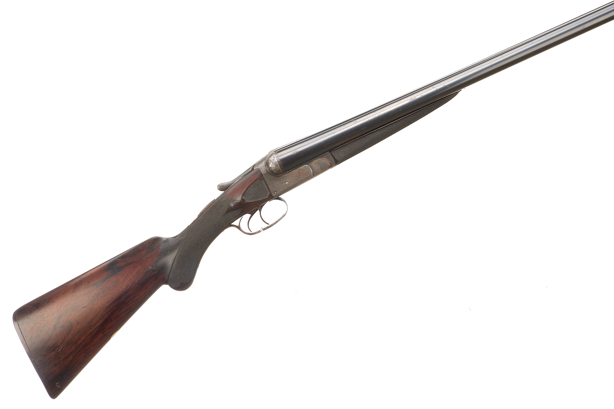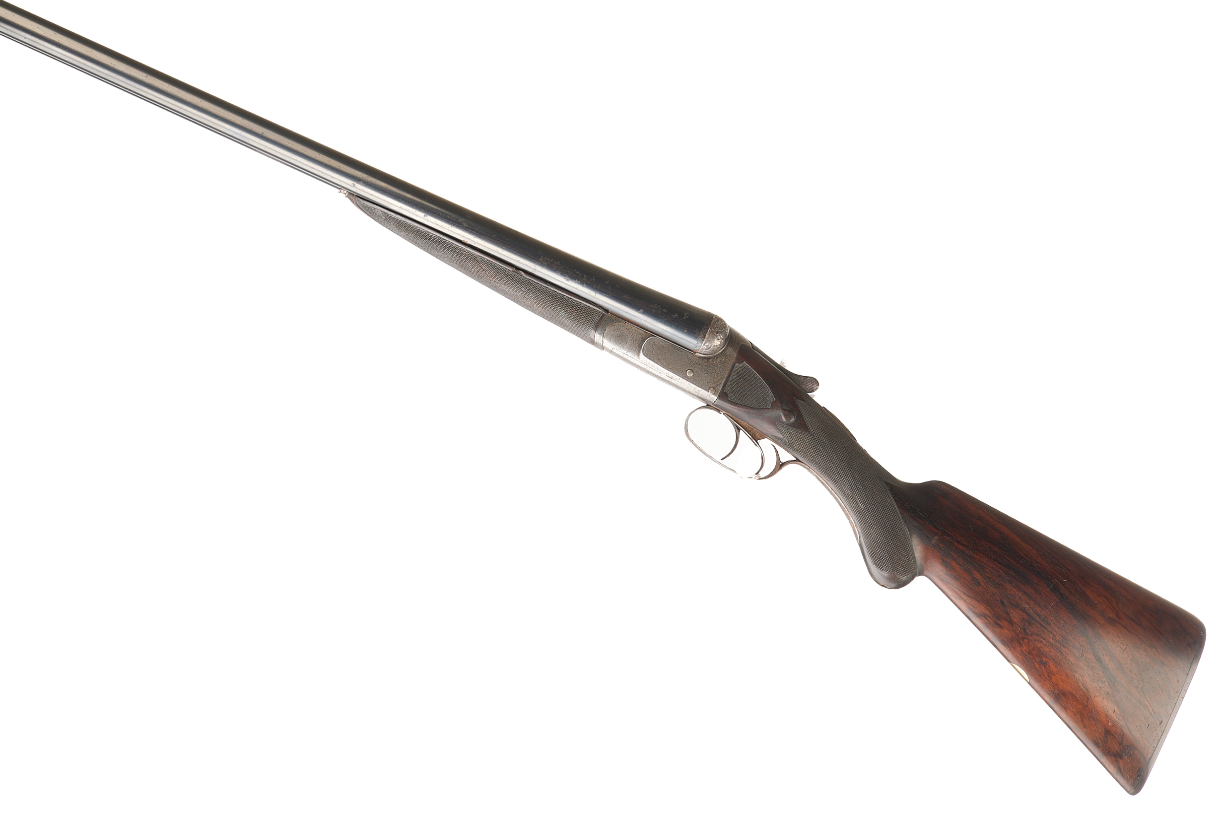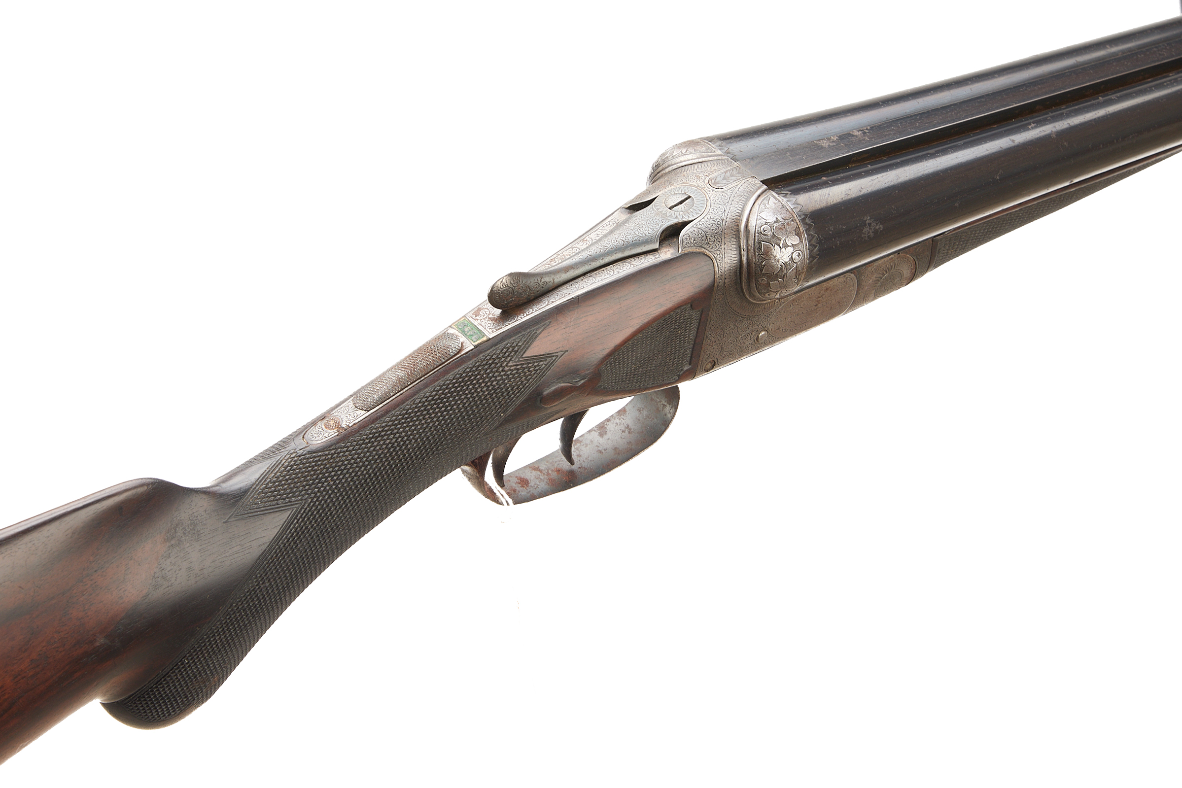 Ribbed, horn butt with worn trademark, chequered rounded, semi-pistol grip and forend. Tapered rib, treble grip action, rib extension with cross-bolt, top lever, automatic safety with ‘SAFE’ inlaid in brass. The action engraved with fine scroll surrounding a cartouche engraved "BELMONT INTERCHANGEABLE HAMMERLESS", the fences adorned with foliolate engraving.