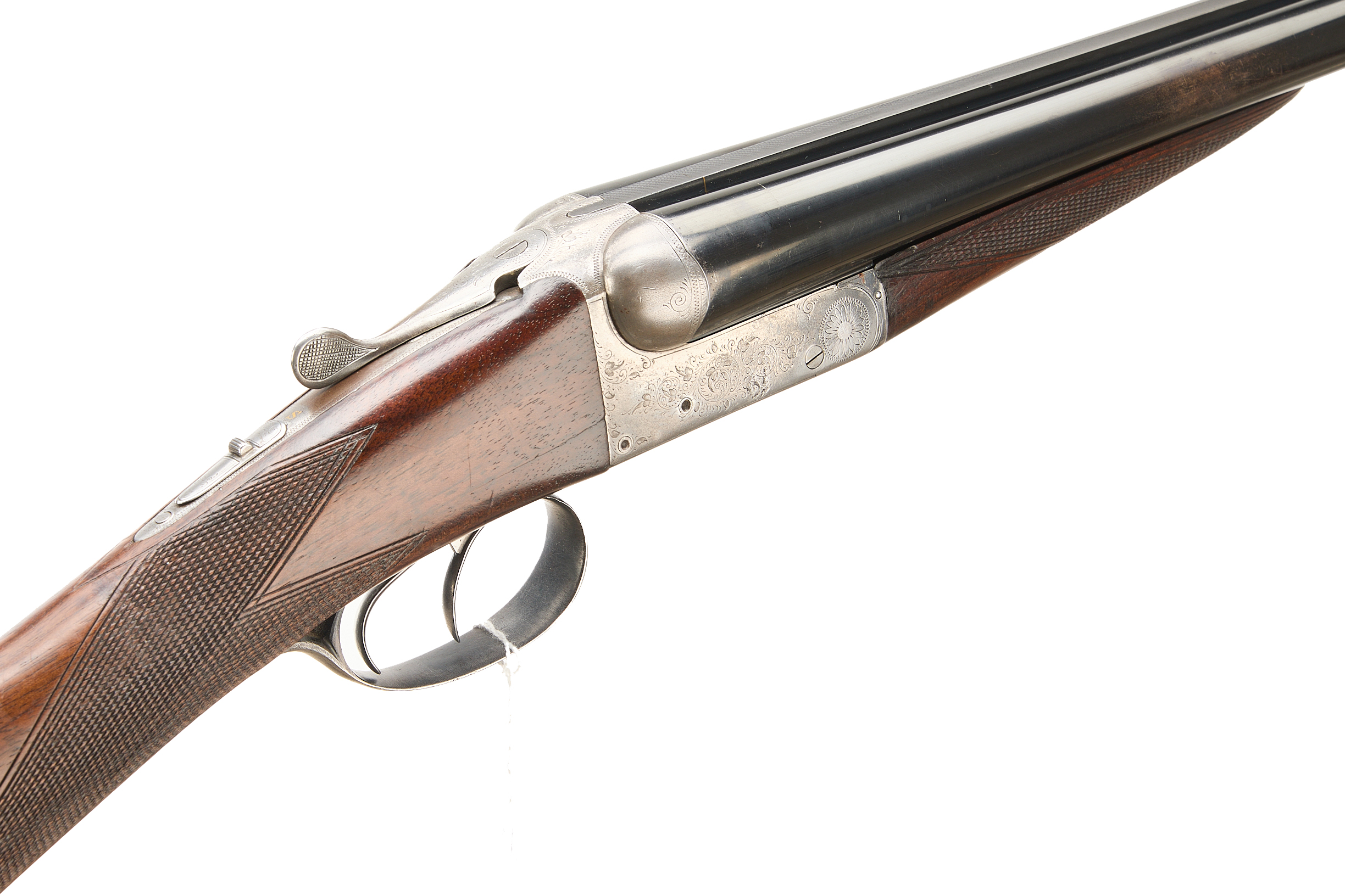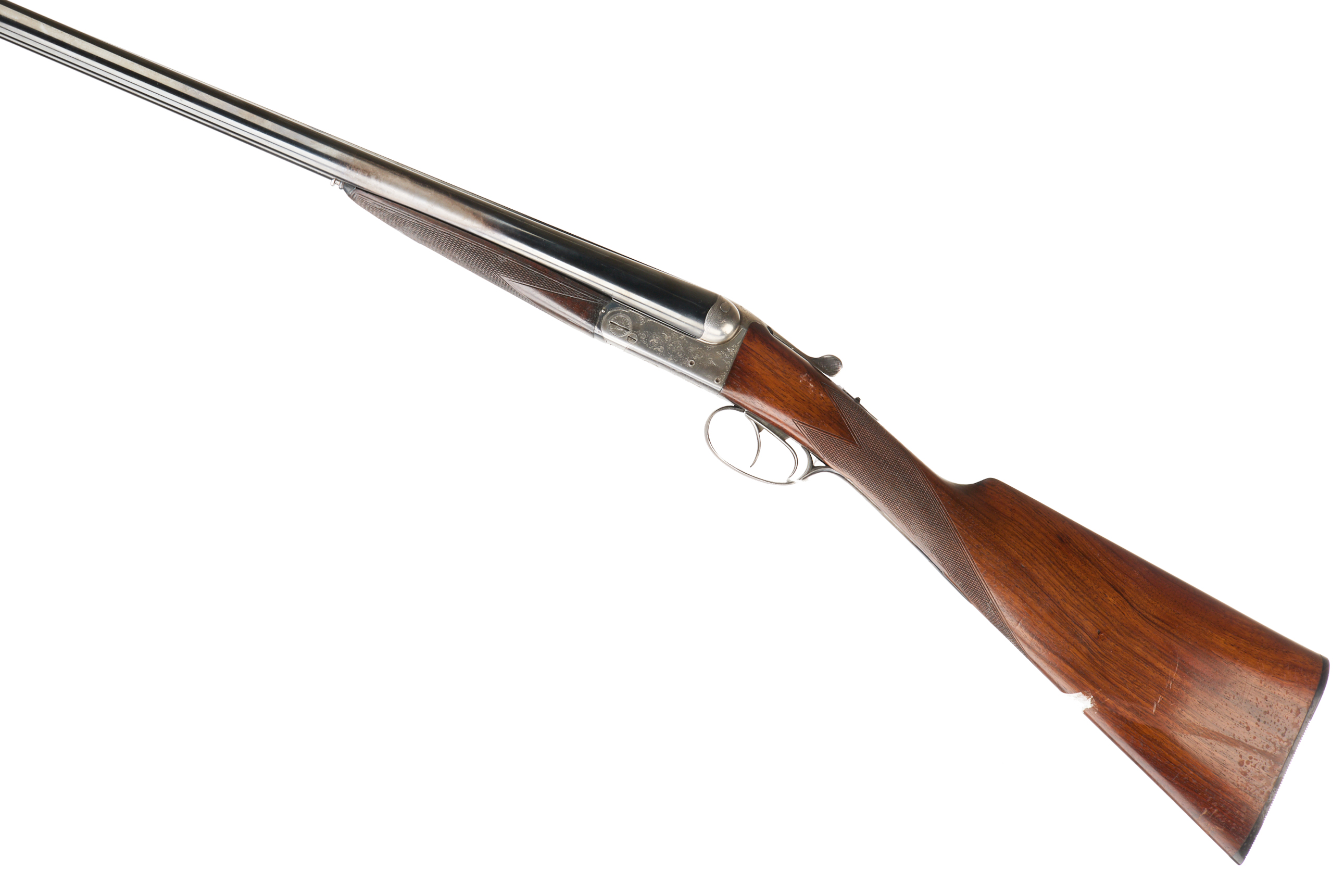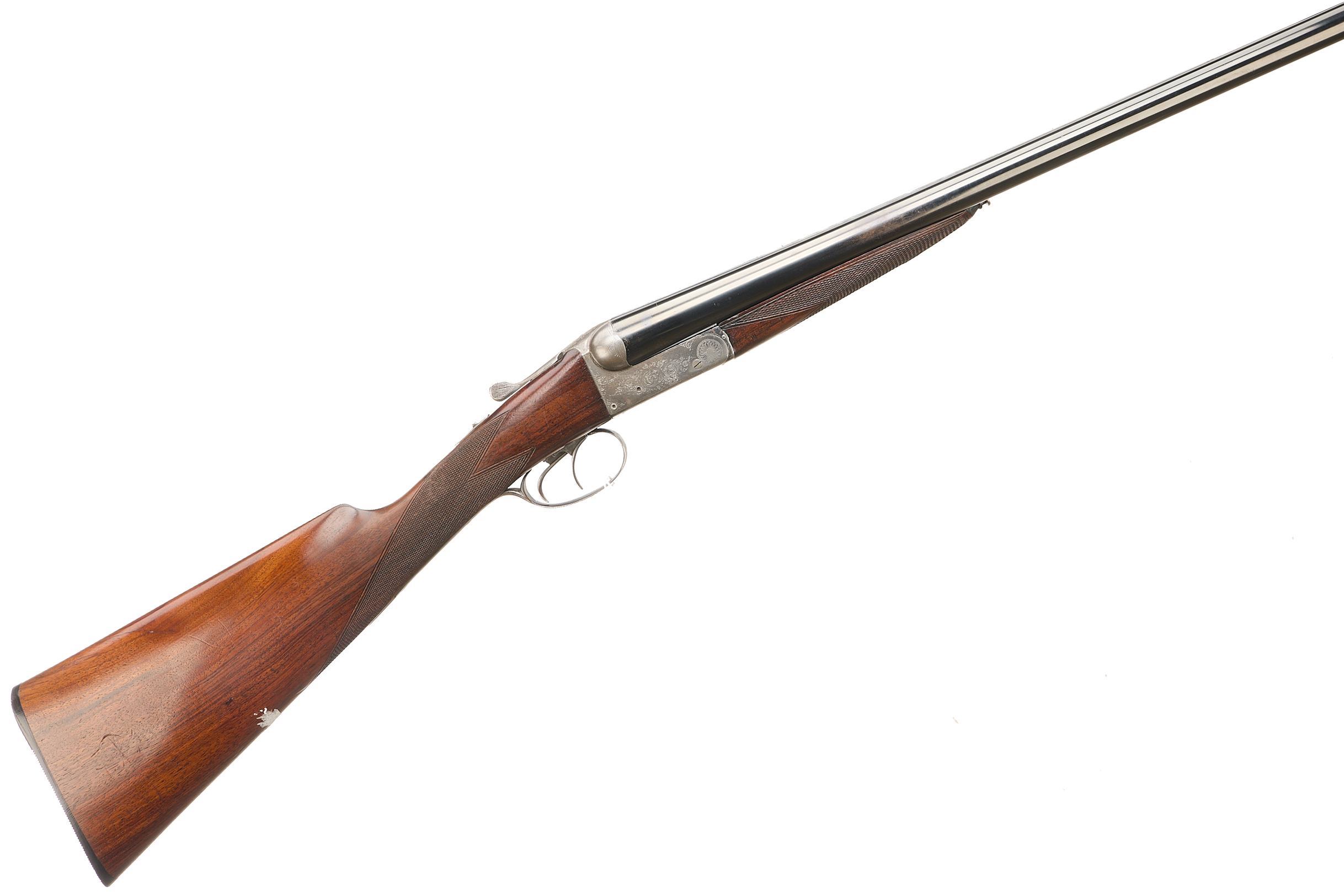 Horn butt, chequered straight grip and forend. Tapered rib engraved ‘CHATONEAU ARQU PARTHENAY’. Sideclips, treble grip action, cross-bolt extension, top lever, safety with ‘S’ inlaid in gold. The action engraved with bouquets and extensive acanthus scrolling. Reproofed Birmingham 2001.