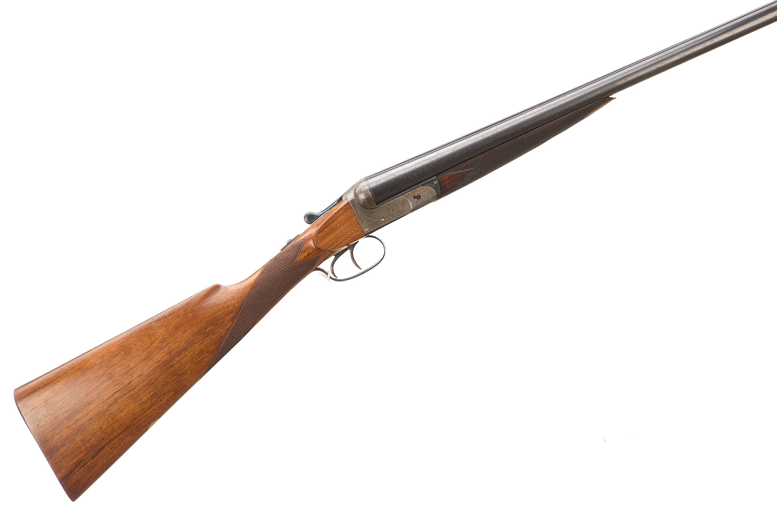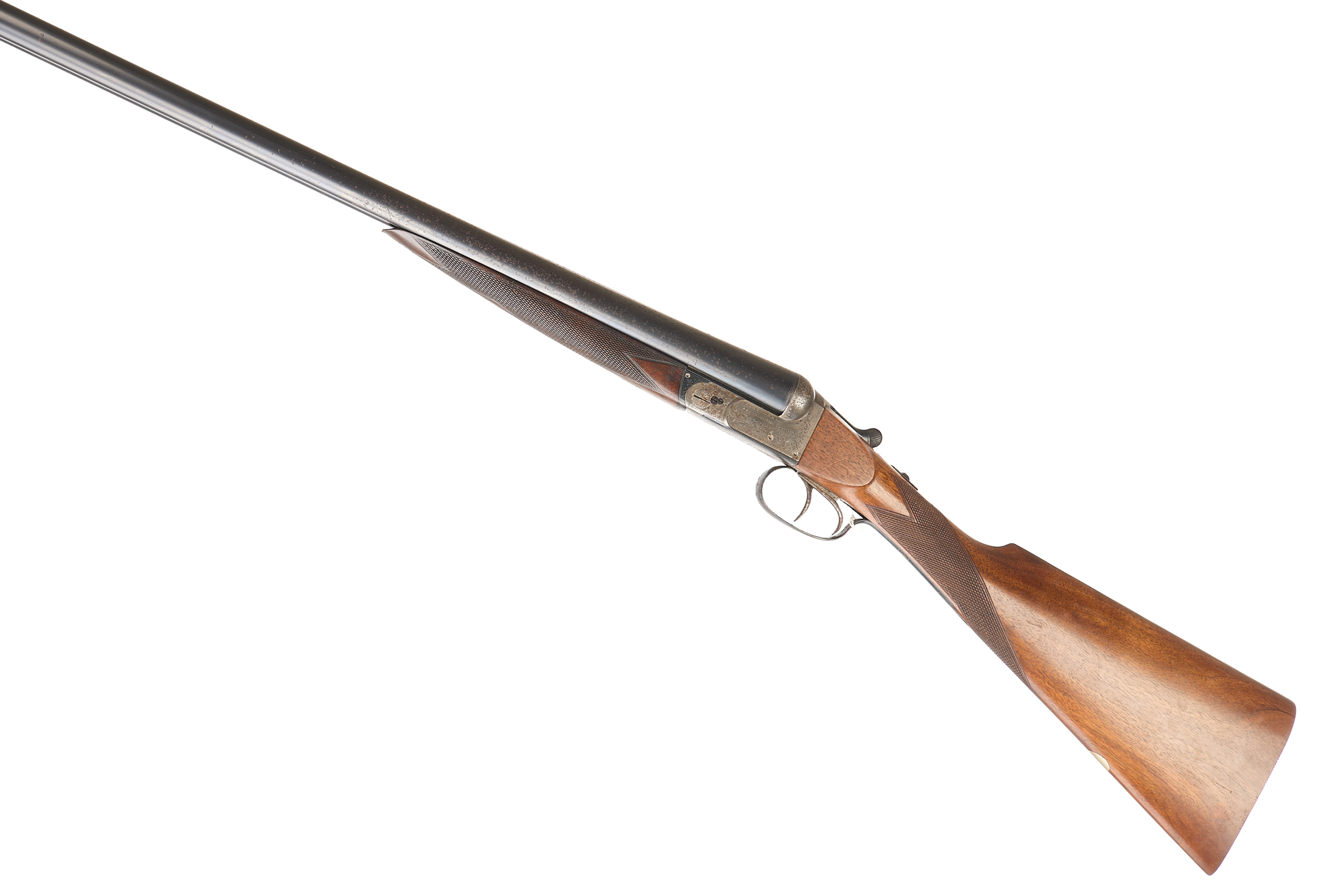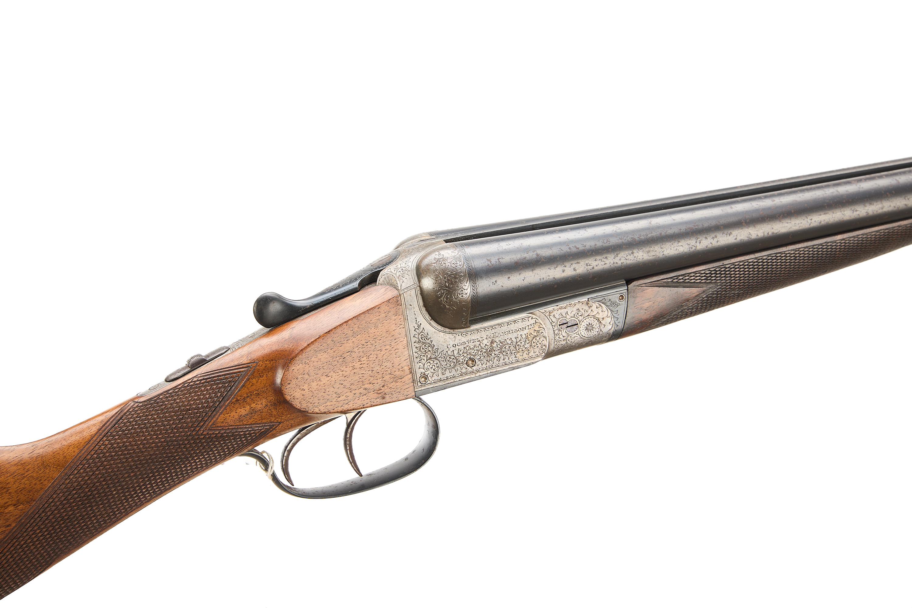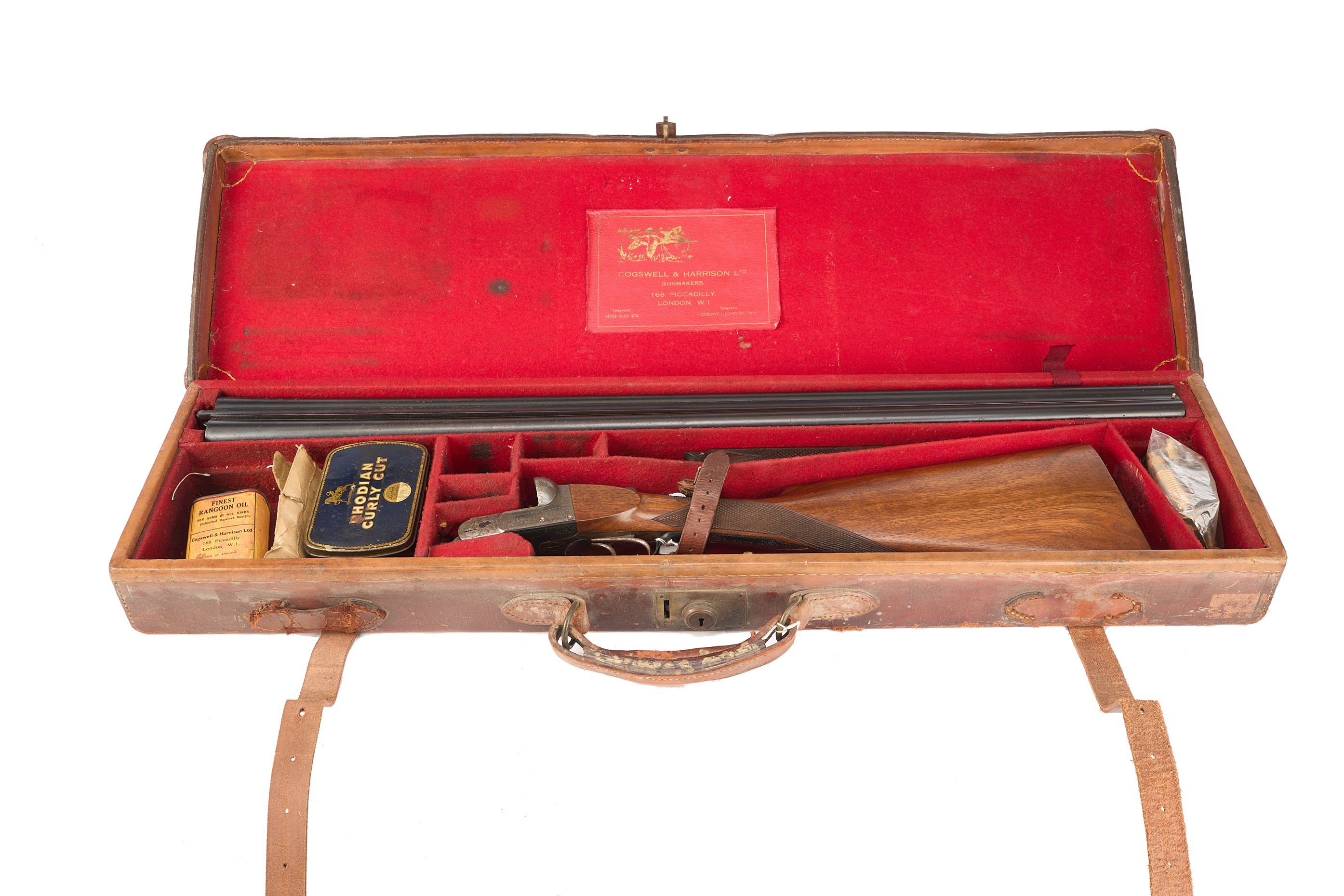 Ribbed butt, replaced stock, chequered straight grip and forend. Rib engraved ‘COGSWELL & HARRISON LTD ‘THE AVANT TOUT’ etc’. Treble grip action, hold open top lever, automatic safety with ‘SAFE’ inlaid in gold. The action engraved with acanthus scrolling framing ‘COGSWELL & HARRISON’. In a leather case.