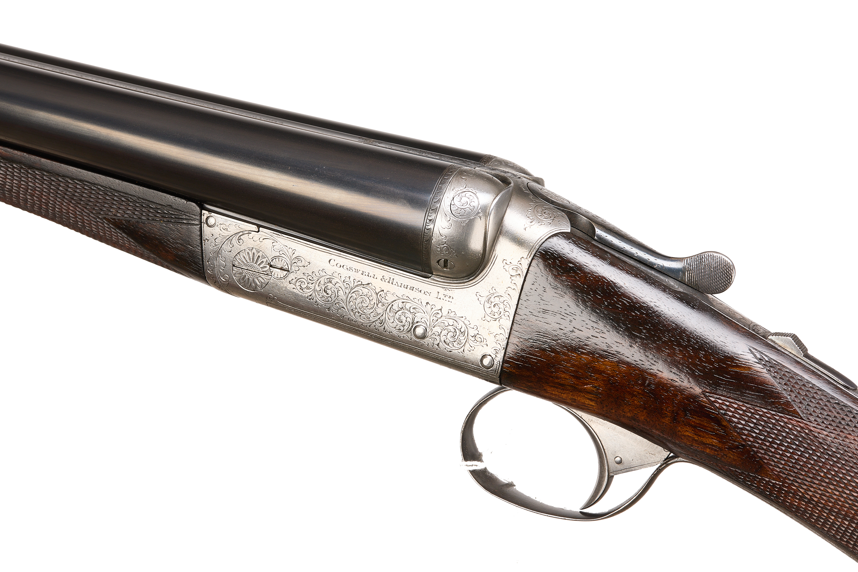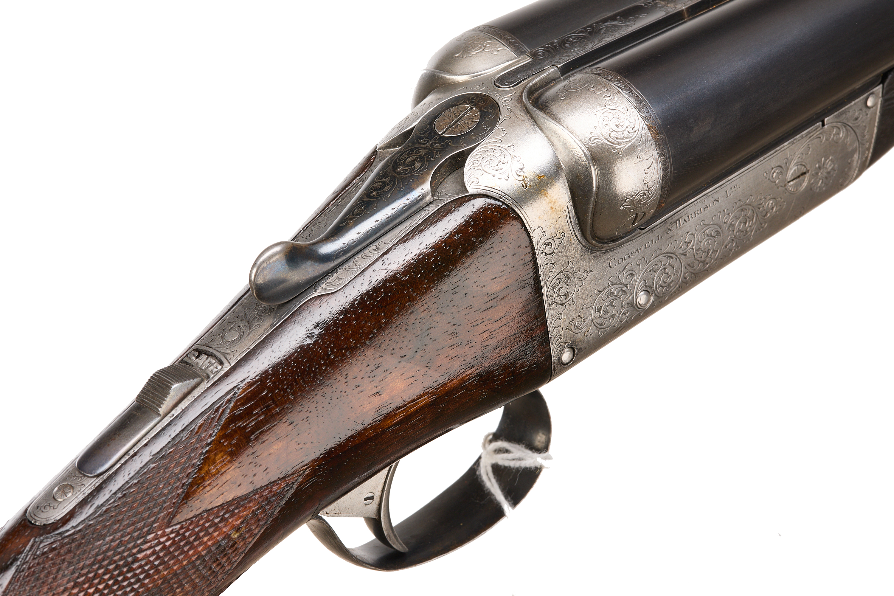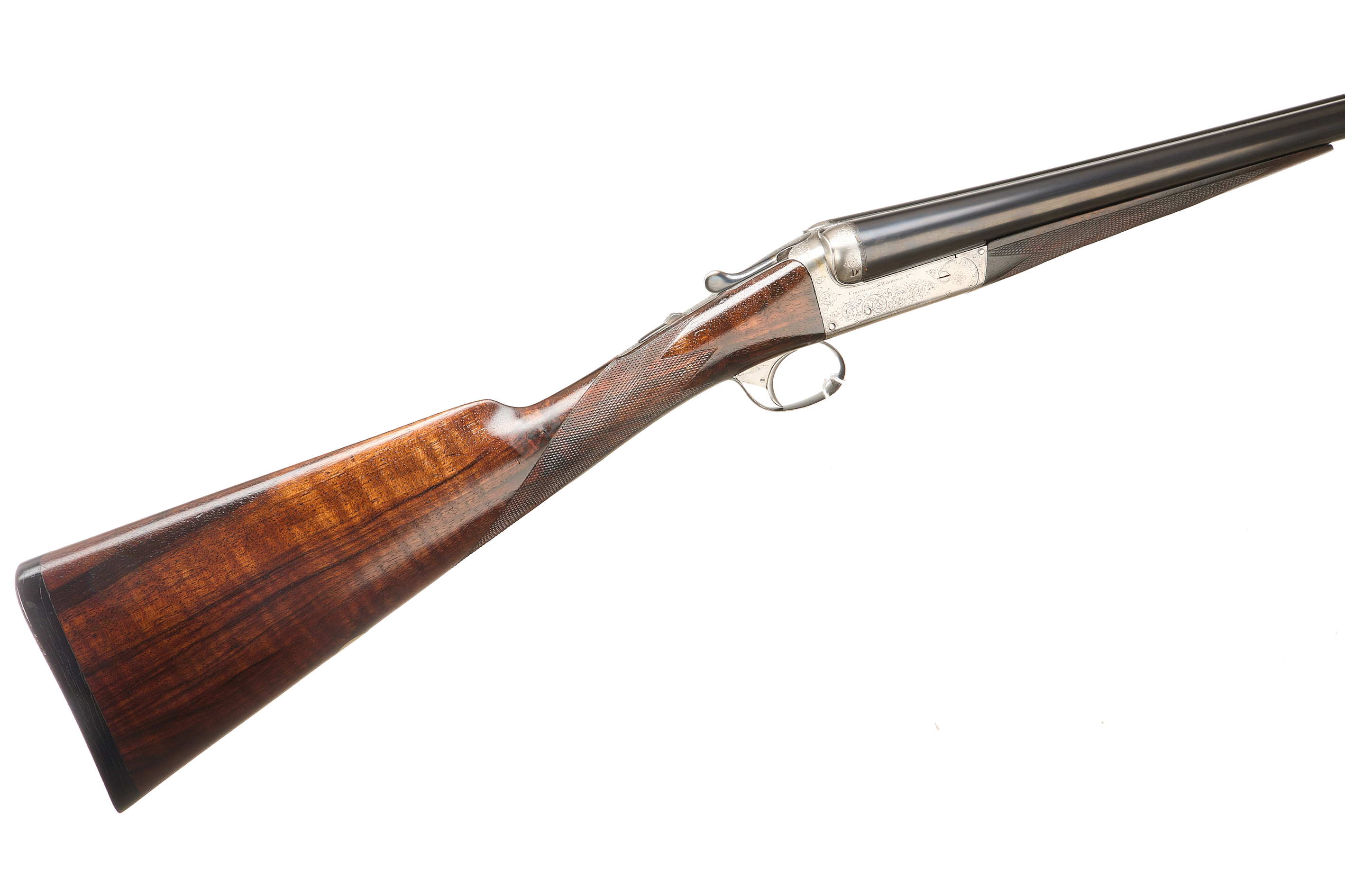 Ebonite extension, chequered butt pad, highly figured stock with chequered straight grip and forend. The tapered rib engraved ‘COGSWELL & HARRISON, THE AVANT TOUT 141 NEW BOND ST & 226 STRAND, LONDON’, automatic safety, lightly carved fences, the action bright, decorated with acanthus bouquets and ‘COGSWELL & HARRISON’ to the sides. Cast off for the right shoulder. For 1896