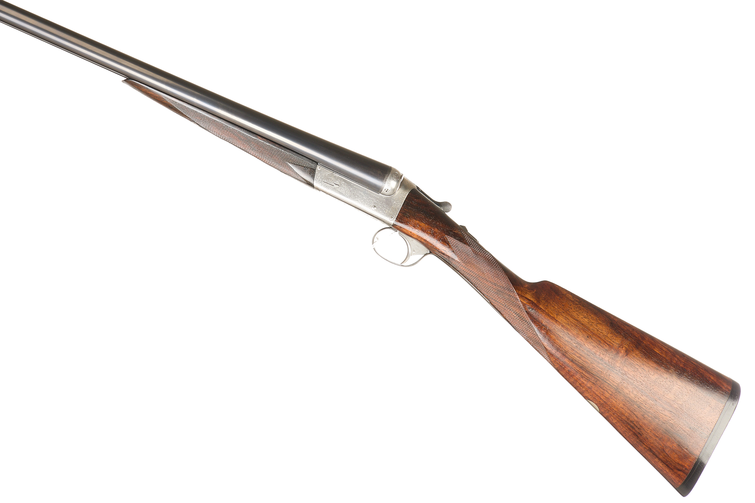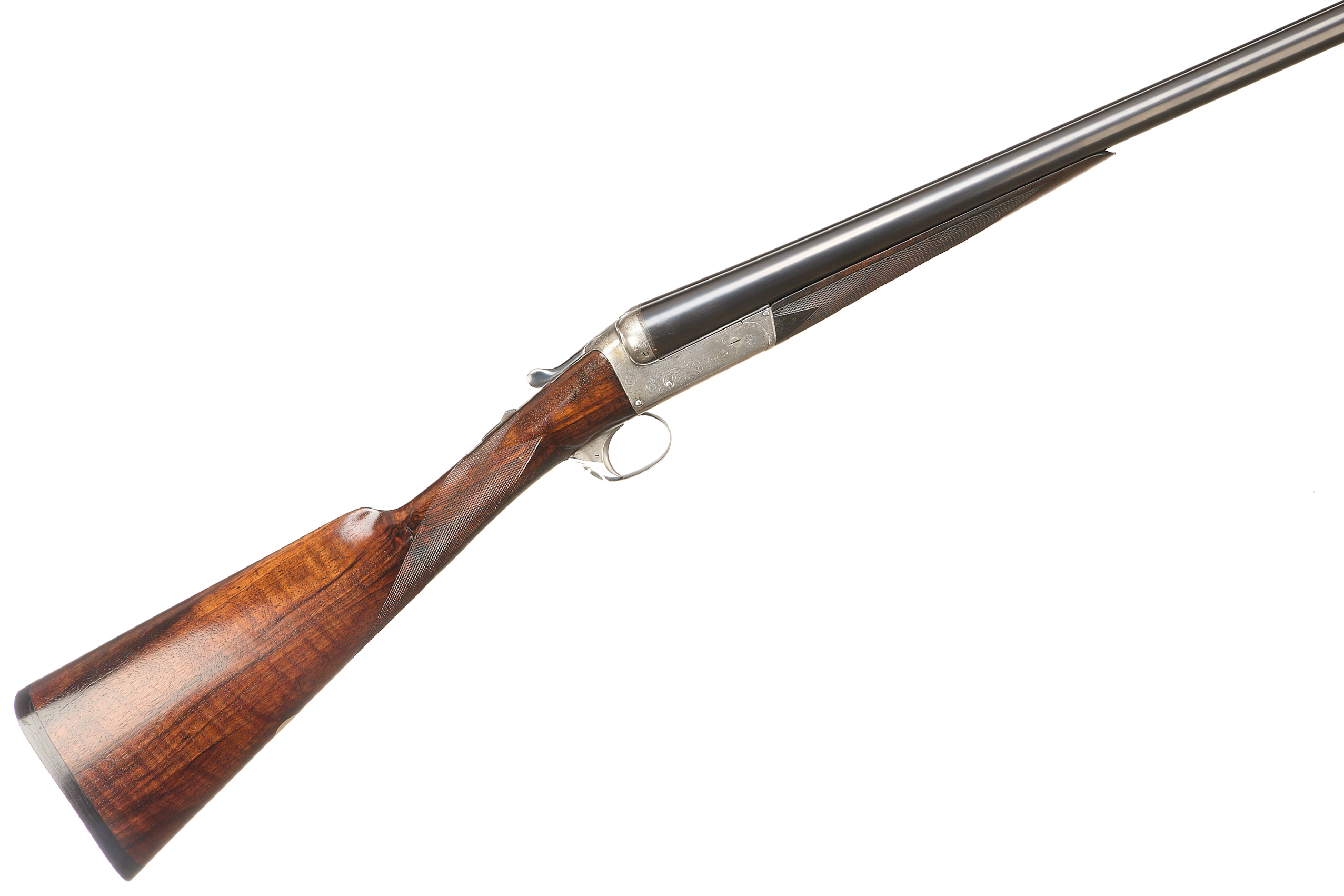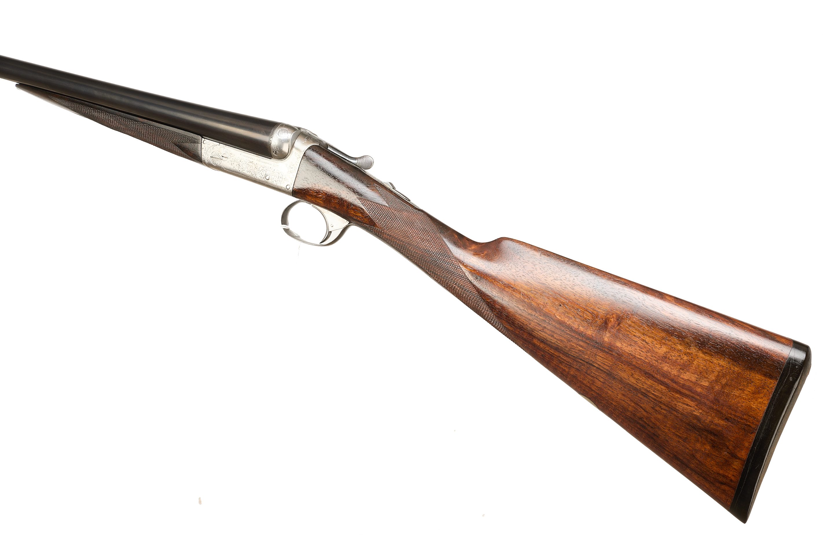Ebonite extension, chequered butt pad, highly figured stock with chequered straight grip and forend. The tapered rib engraved ‘COGSWELL & HARRISON, THE AVANT TOUT 141 NEW BOND ST & 226 STRAND, LONDON’, automatic safety, lightly carved fences, the action bright, decorated with acanthus bouquets and ‘COGSWELL & HARRISON’ to the sides. Cast off for the right shoulder. For 1896