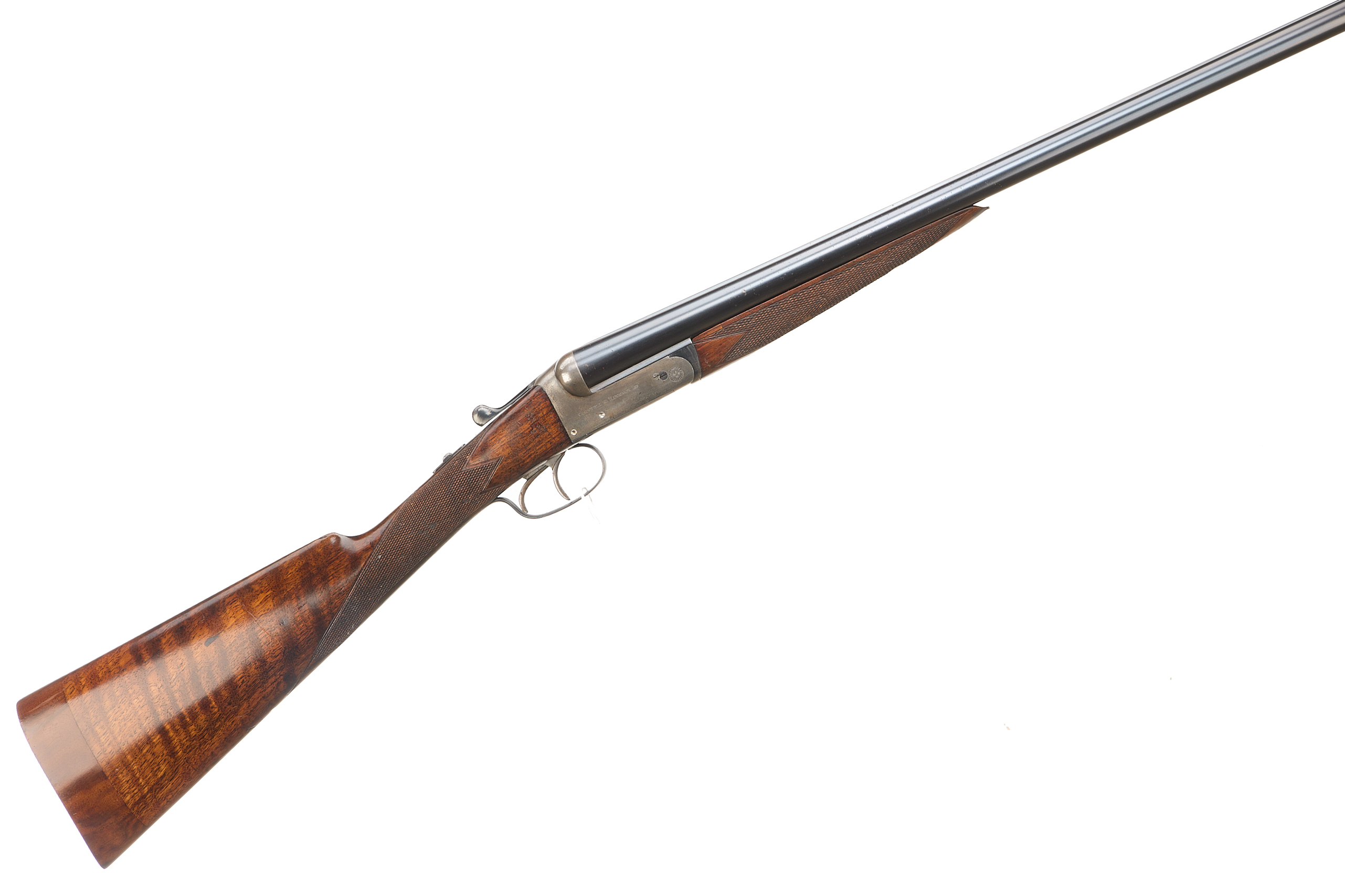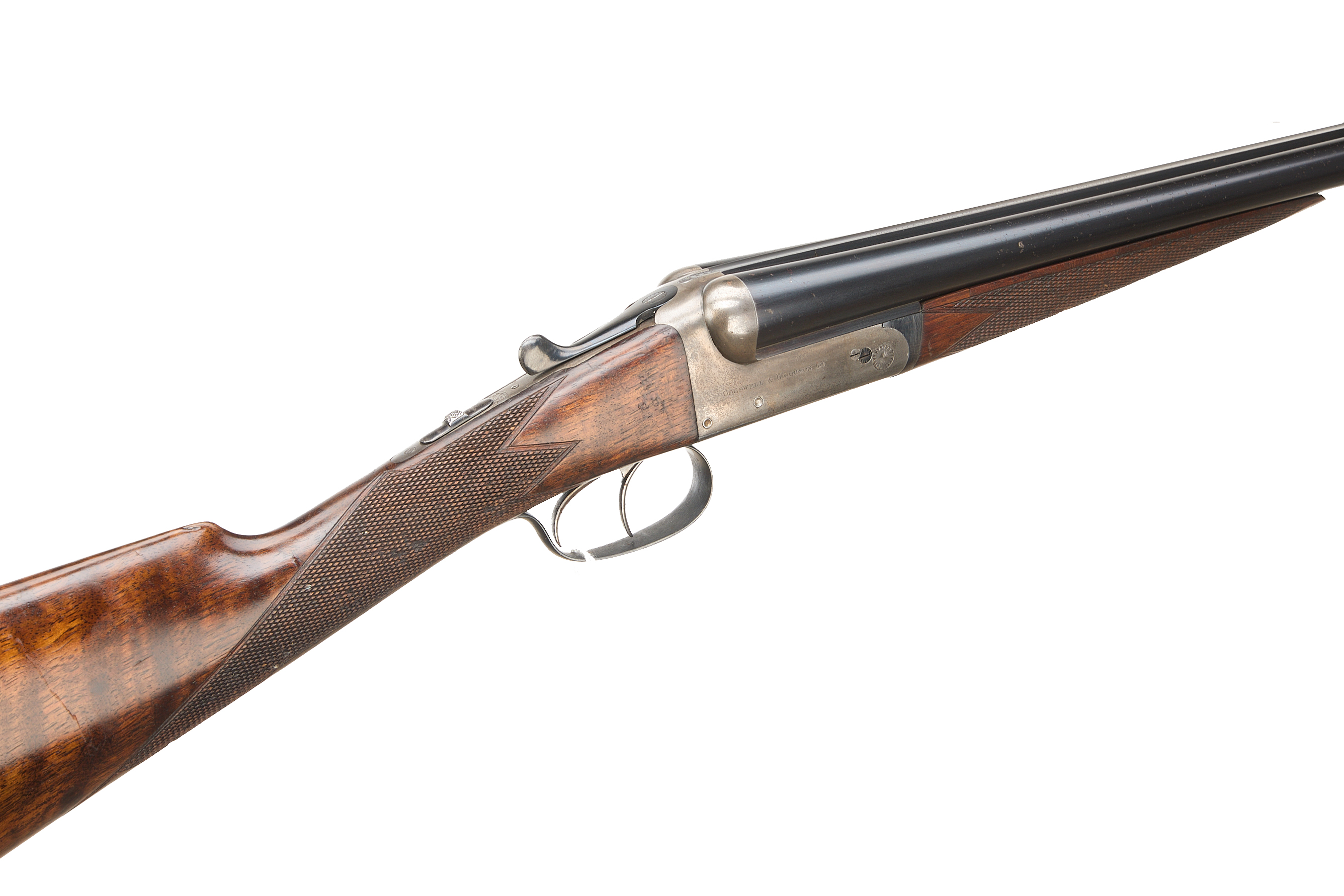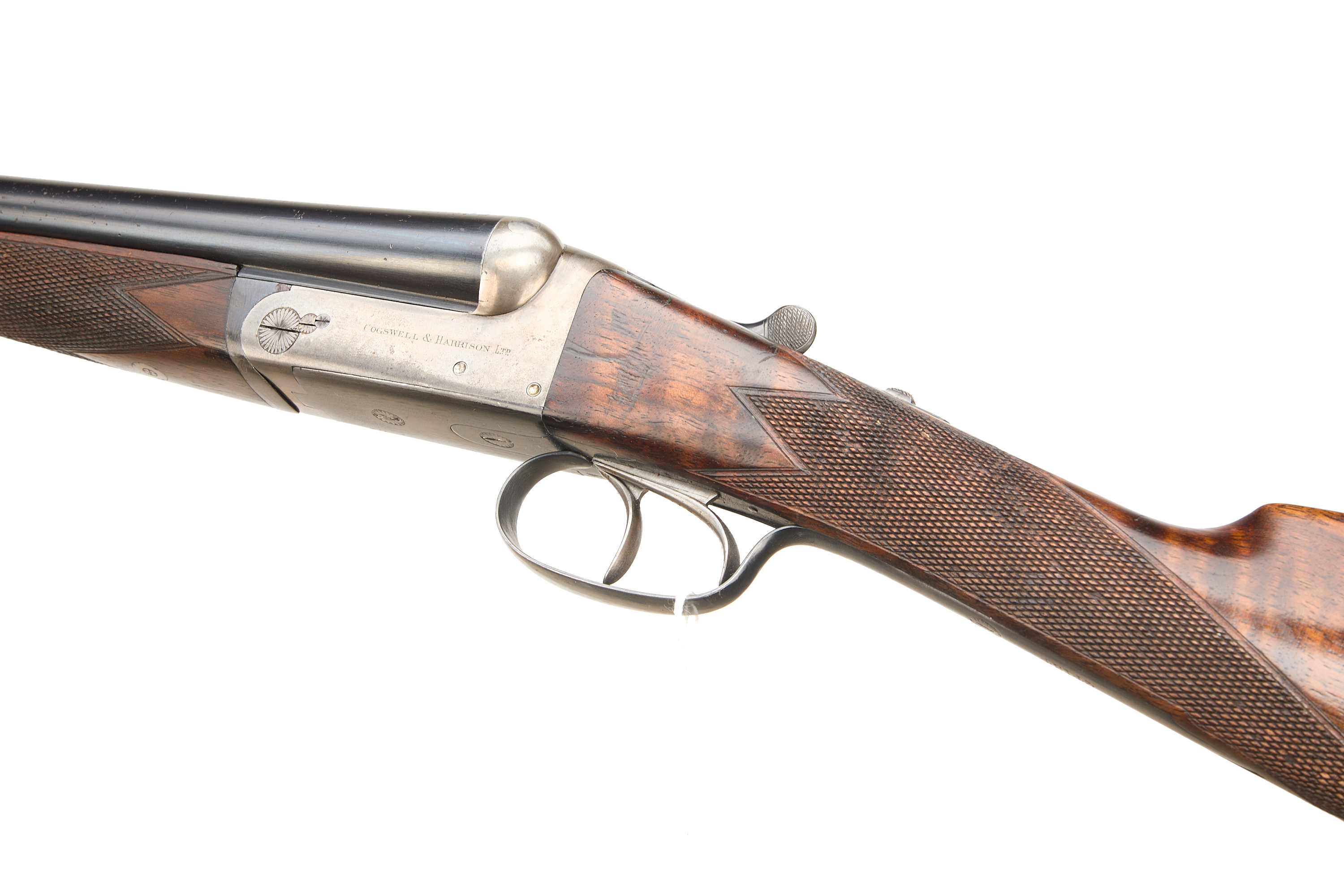 Chequered wooden butt, chequered straight grip and forend. Tapered rib engraved ‘COGSWELL & HARRISON Ltd 141 NEW BOND ST & 226 STRAND LONDON’. Treble grip action, top lever, automatic safety with ‘SAFE’ engraved. The action simply adorned with ‘COGSWELL & HARRISON Ltd’ and circular floral engravings to disguise pins.