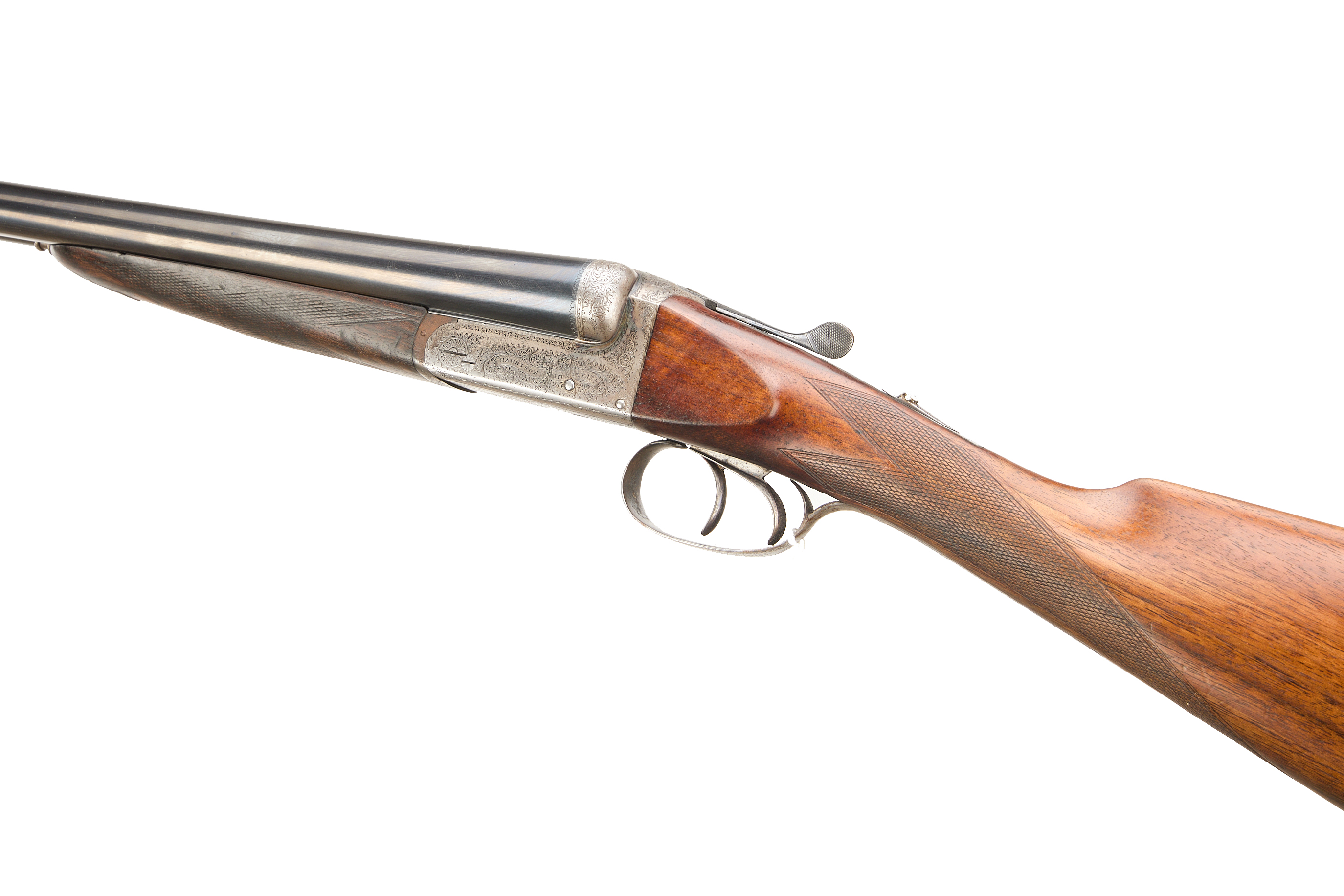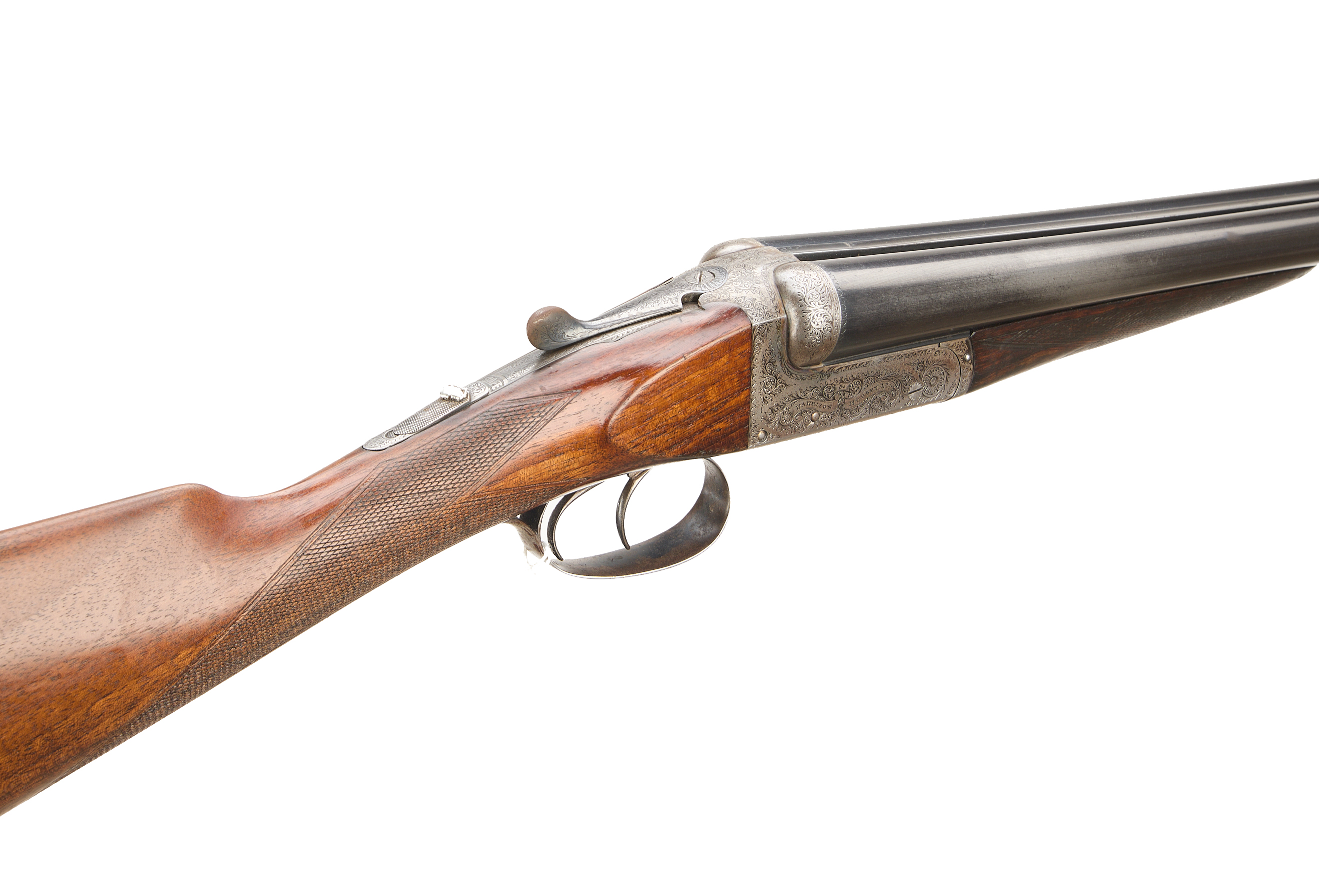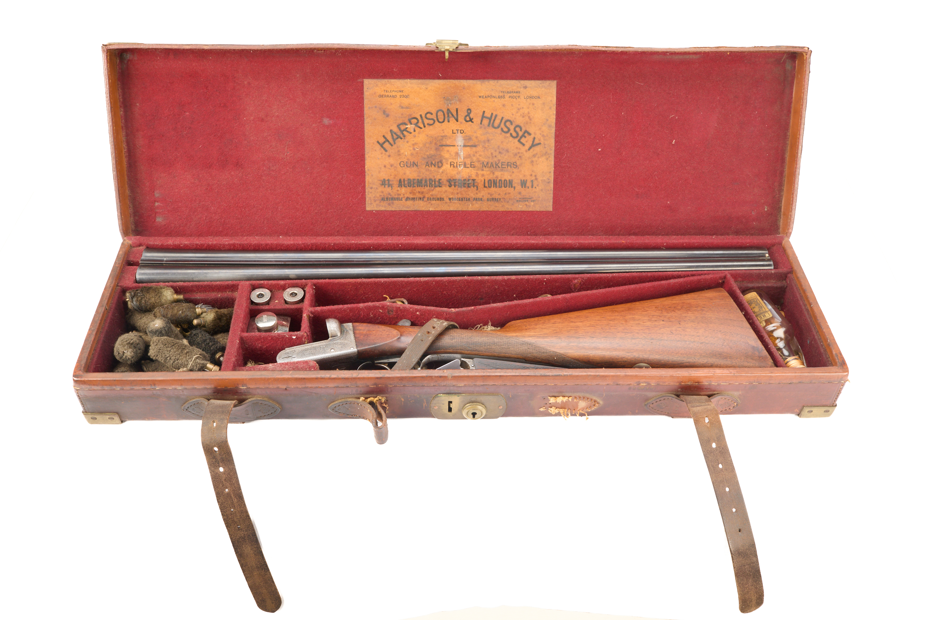 Ribbed, butt, chequered straight grip and forend. Tapered rib engraved ‘HARRISON & HUSSEY LTD 41. ALBEMARLE STREET. LONDON.’. Treble grip action, hold open top lever, automatic safety with ‘SAFE’ engraved. The action engraved with extensive acanthus scrolling and ‘HARRISON & HUSSEY LTD’ engraved on scrolls to the sides. In the manufacturer’s brass-cornered, oak and leather case. Circa 1926
