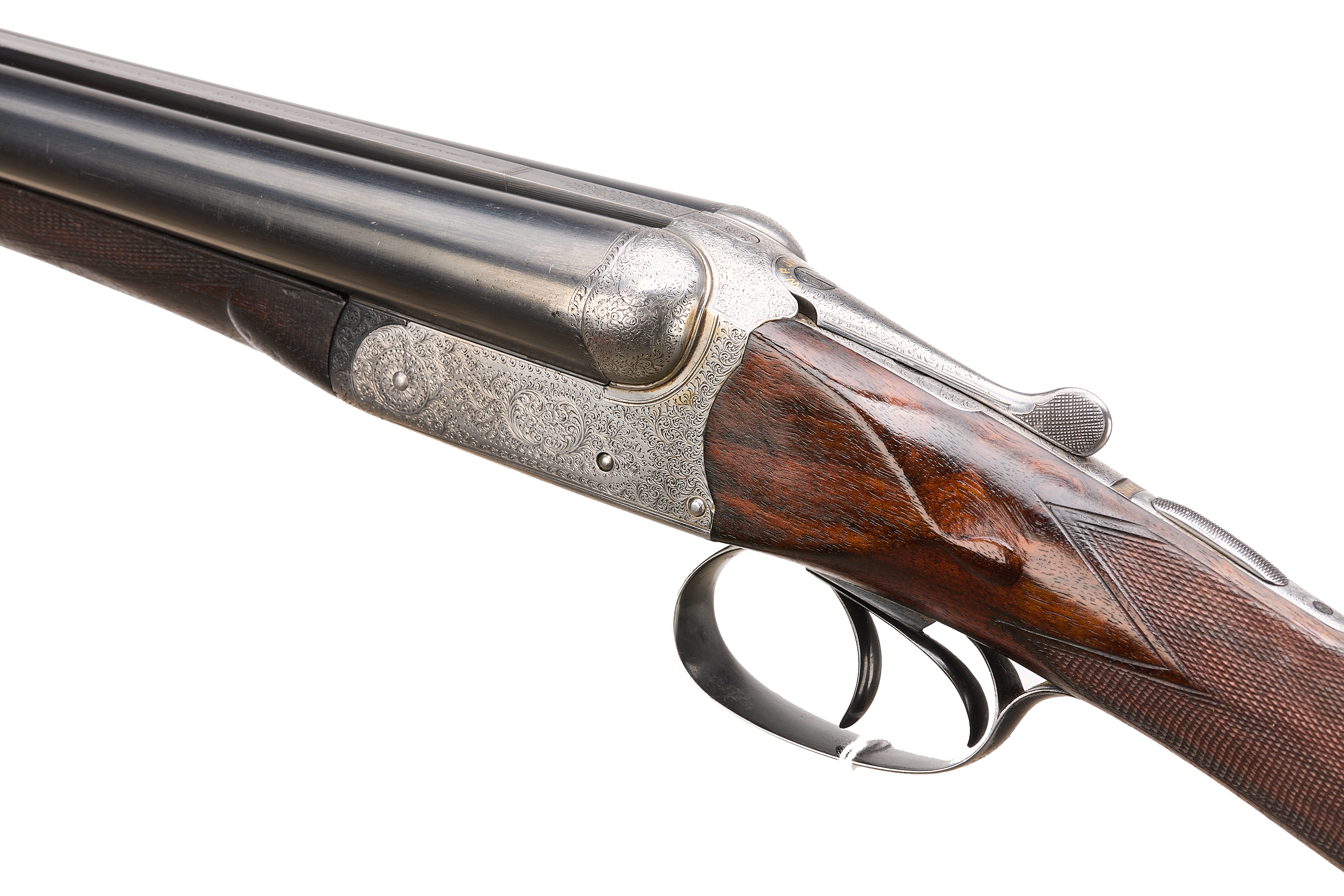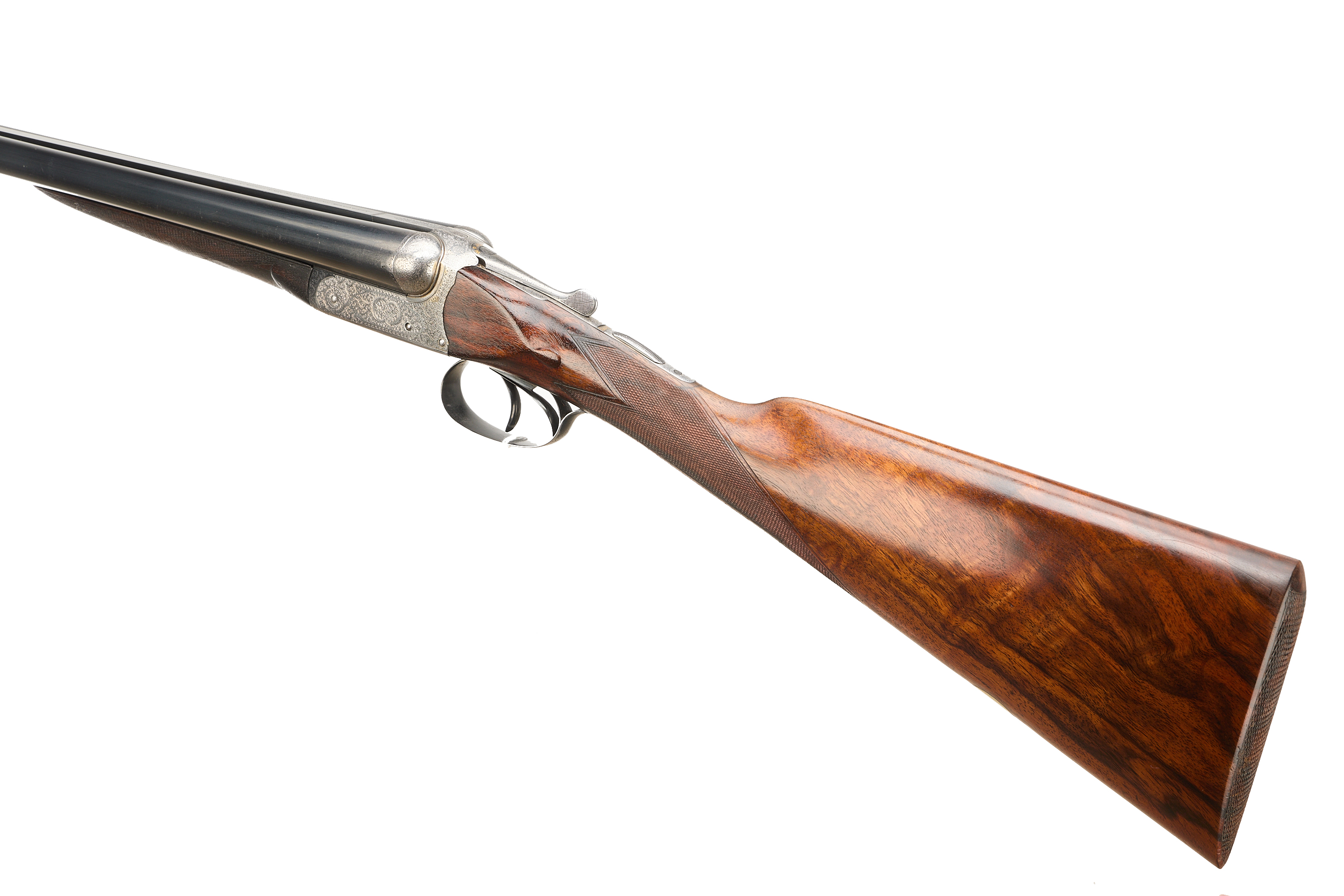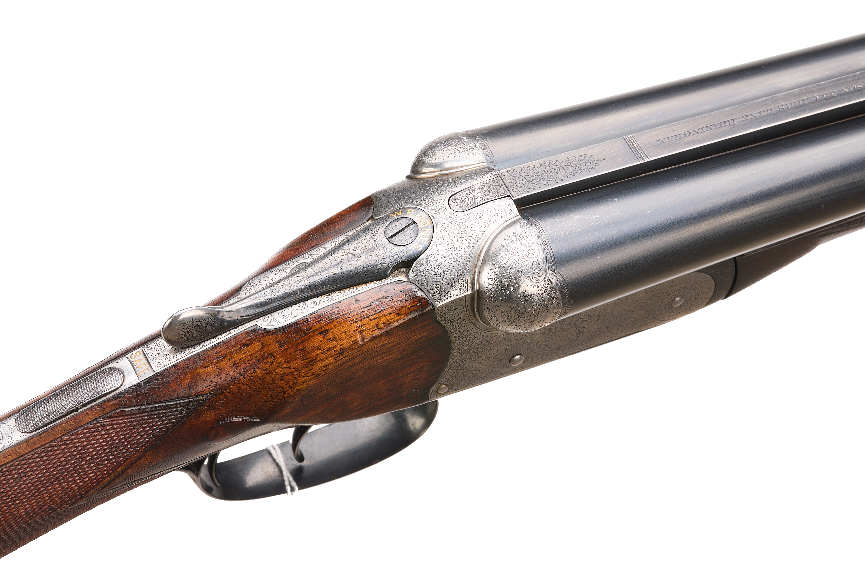 Chequered butt, replaced stock, cast off, chequered straight grip and forend. Broad, tapered rib to replacement barrels, engraved ‘WILLIAM POWELL etc’ (Ser No 11667), reproved Birmingham 1971. Cross-bolt extension, treble grip action, top lever ‘W.P. JONES’ in gold, automatic safety with ‘SAFE’ inlaid in gold, the underside with ‘WPJ’ logo. Sideclips, scooped-back action, finely engraved with extensive acanthus scrolling.