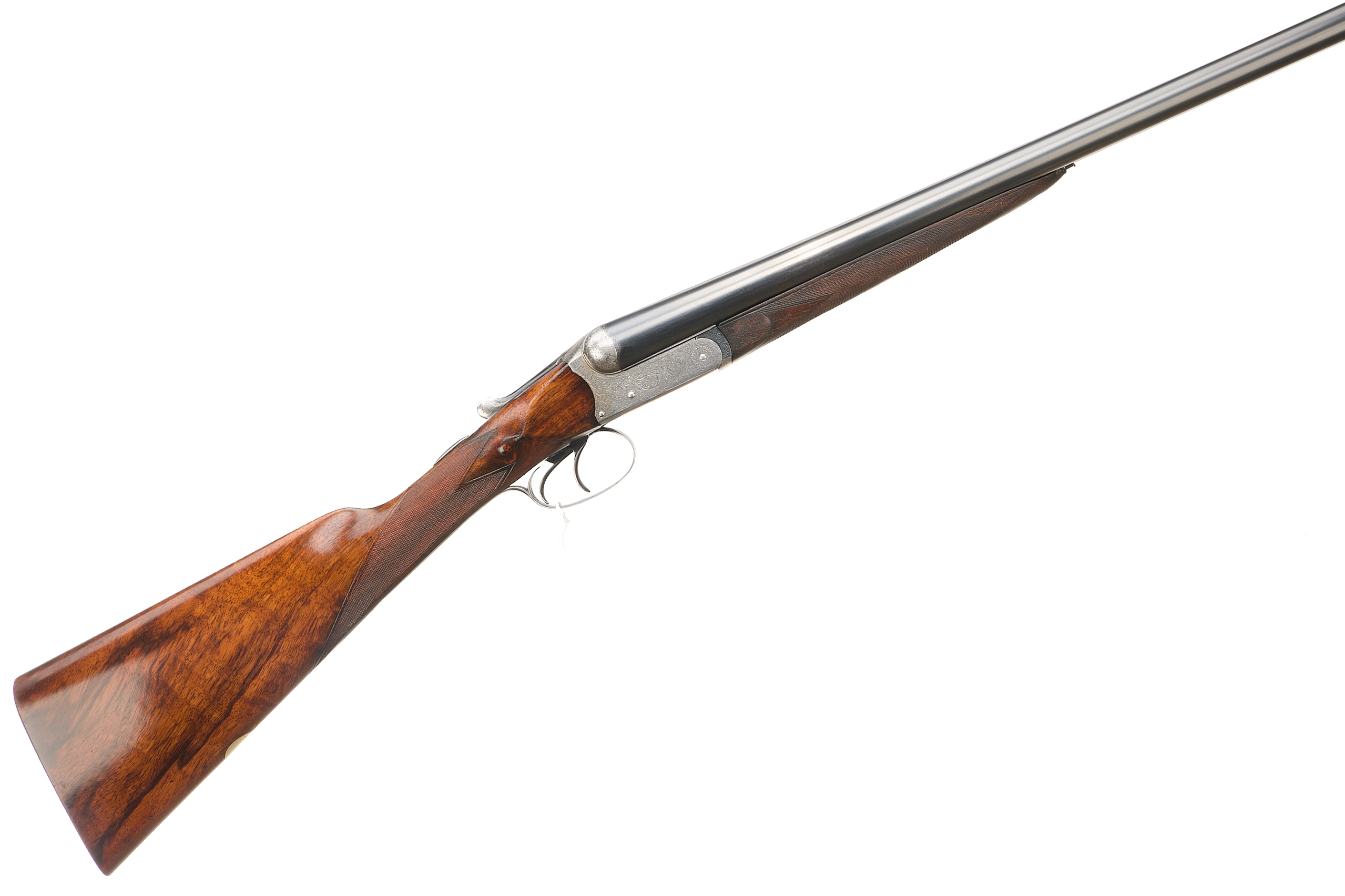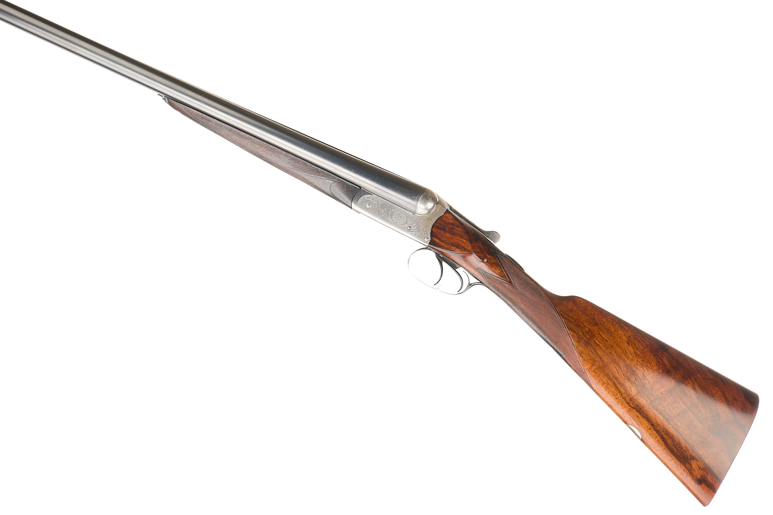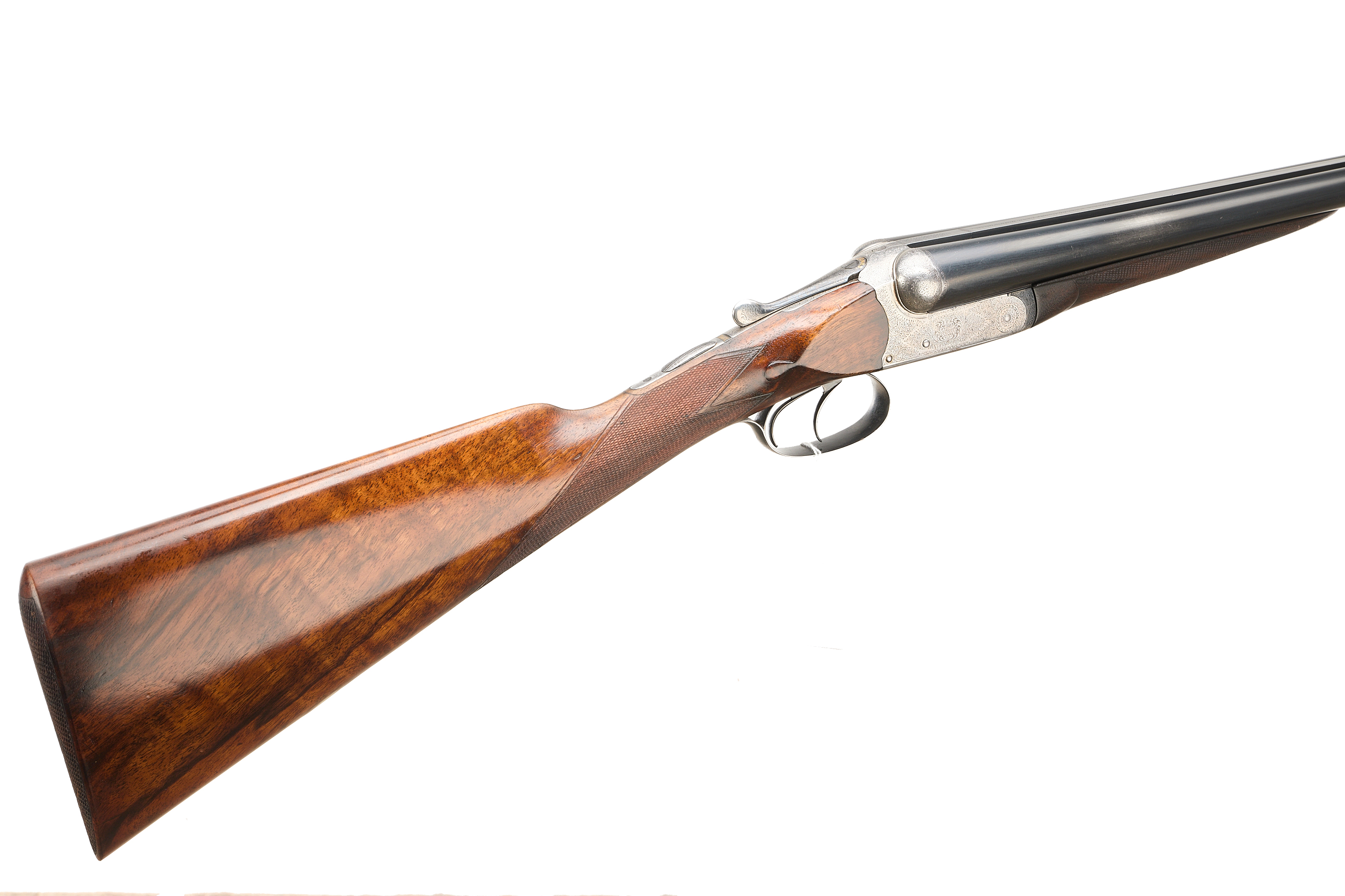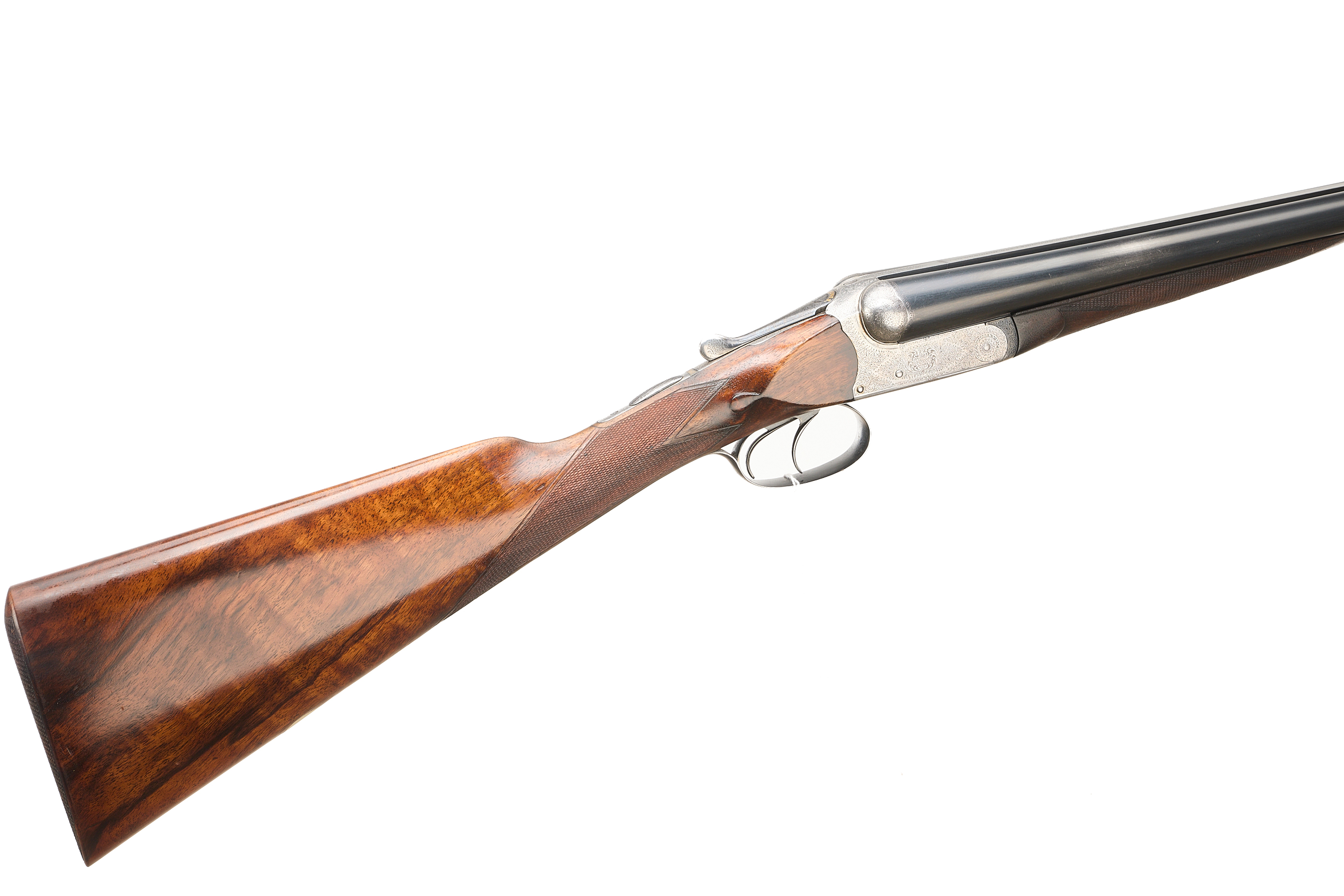 Chequered butt, replaced stock, cast off, chequered straight grip and forend. Broad, tapered rib to replacement barrels, engraved ‘WILLIAM POWELL etc’ (Ser No 11667), reproved Birmingham 1971. Cross-bolt extension, treble grip action, top lever ‘W.P. JONES’ in gold, automatic safety with ‘SAFE’ inlaid in gold, the underside with ‘WPJ’ logo. Sideclips, scooped-back action, finely engraved with extensive acanthus scrolling.