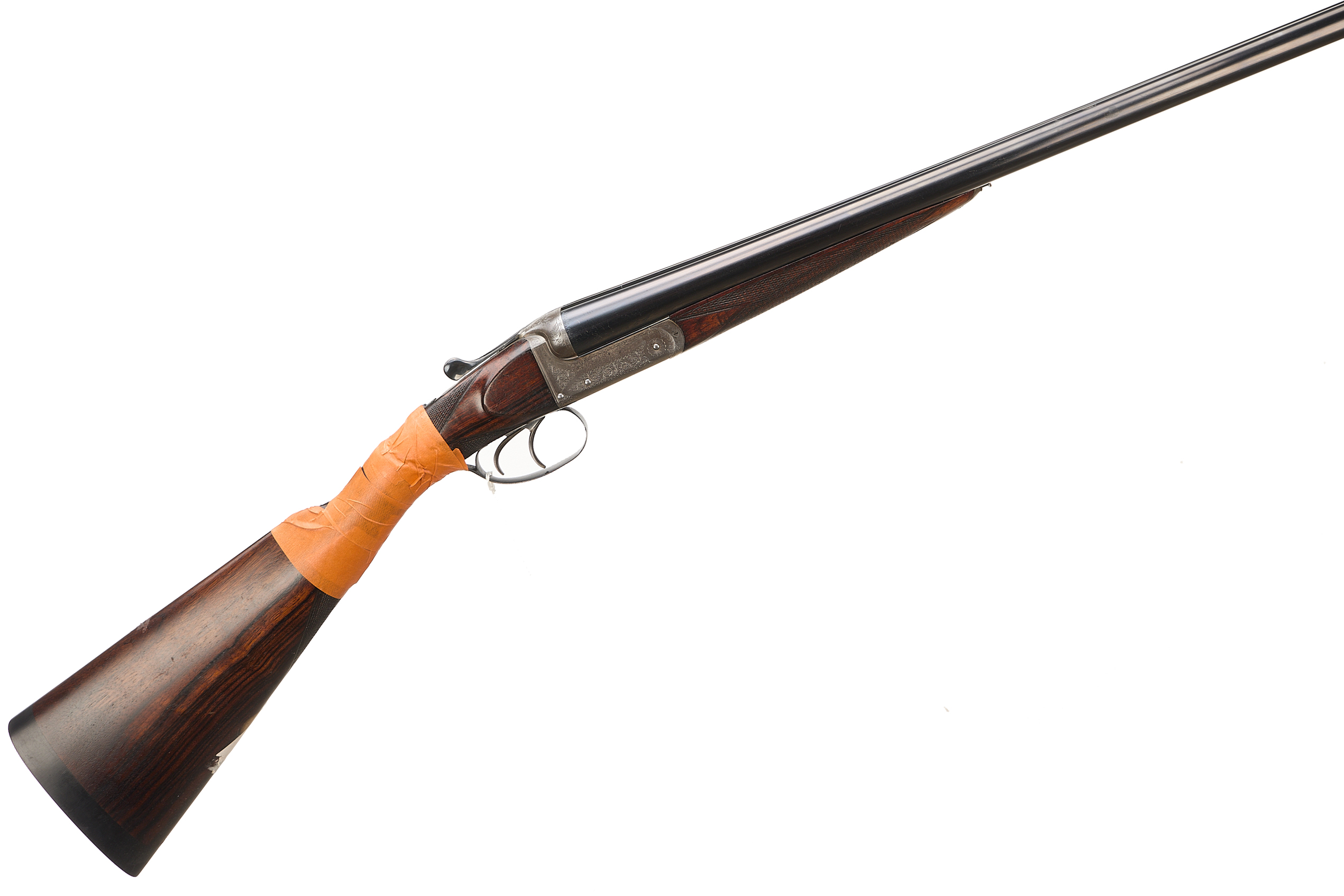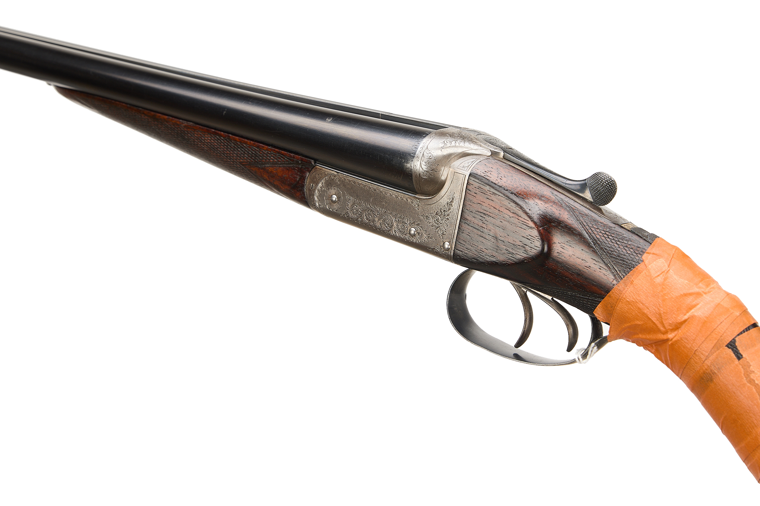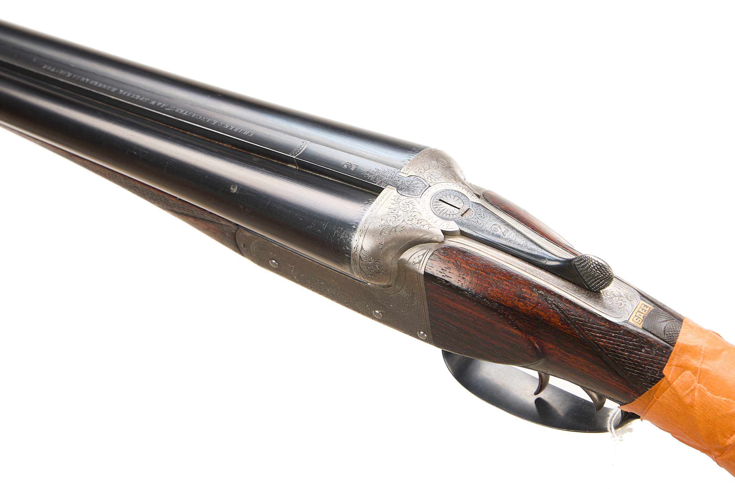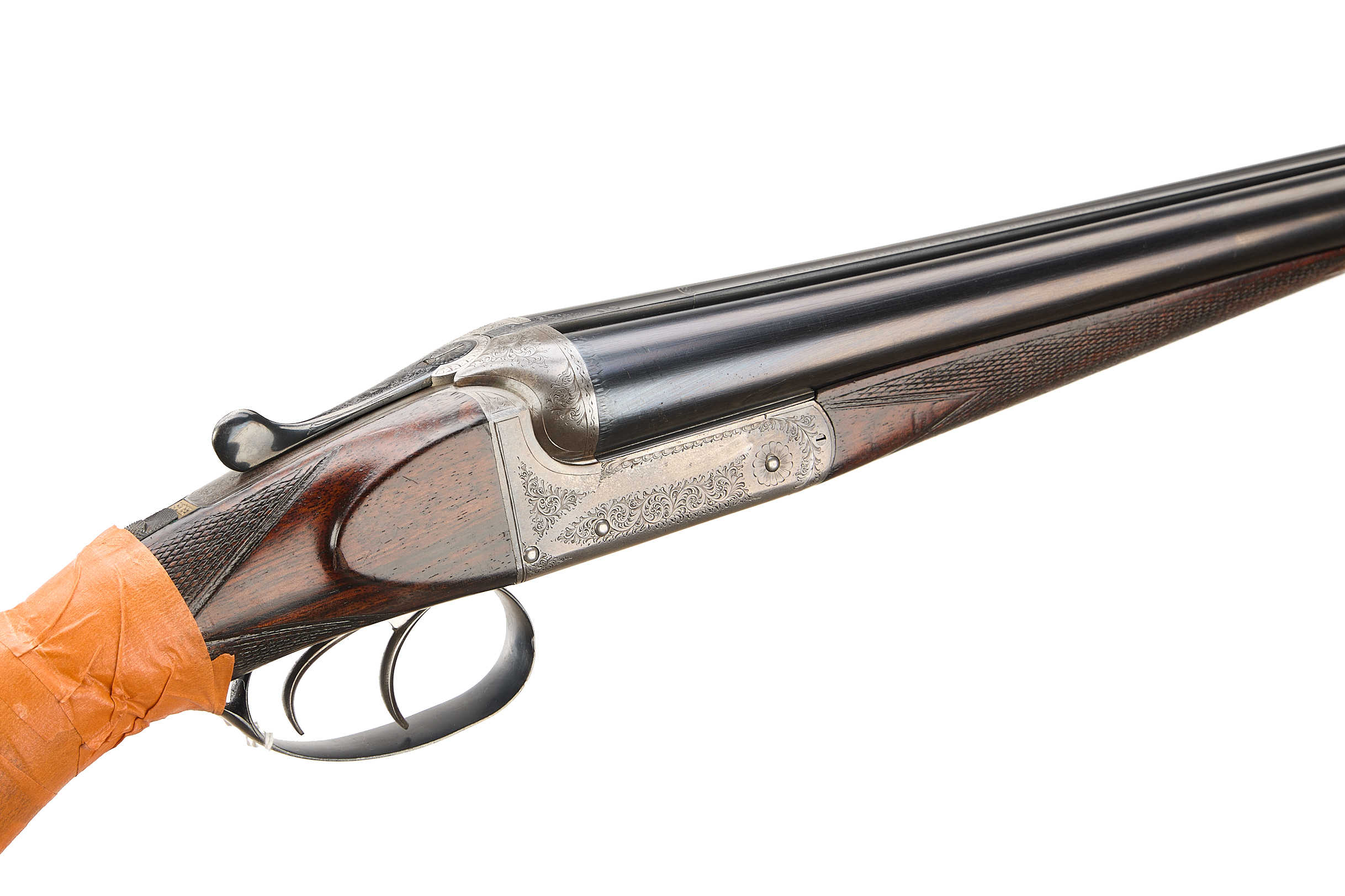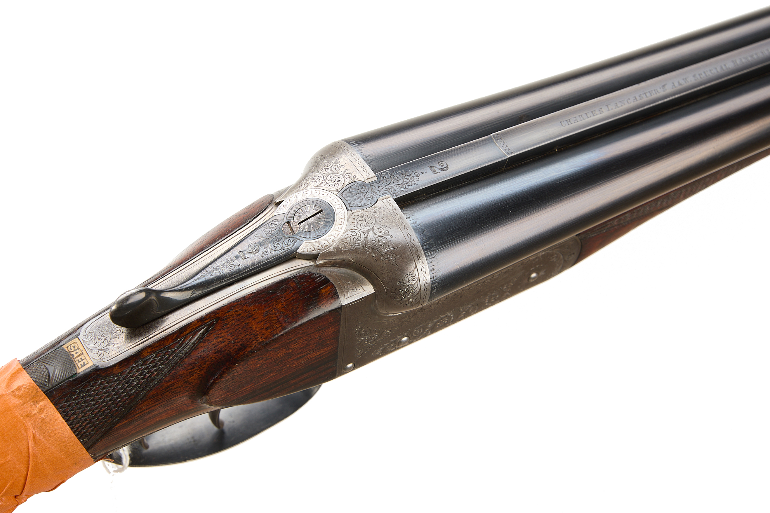 Circa 1915. Stock snapped. Tapered rib engraved ‘CHARLES LANCASTER’s A&W SPECIAL HAMMERLESS EJECTOR’ and No ‘2’. Treble grip action, hold open top lever, automatic safety with ‘SAFE’ inlaid in gold. The action engraved with bouquets and extensive acanthus scrolling.