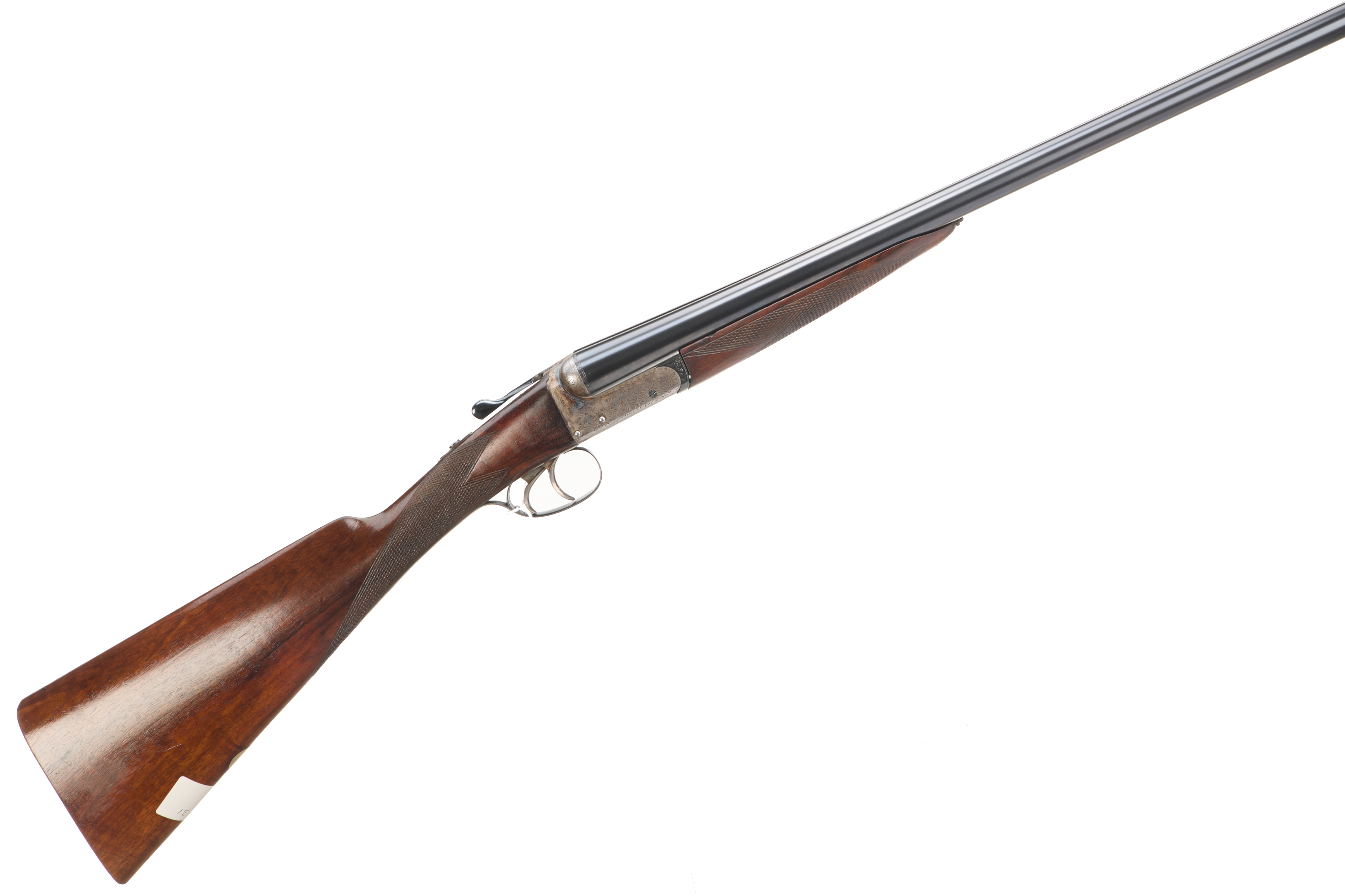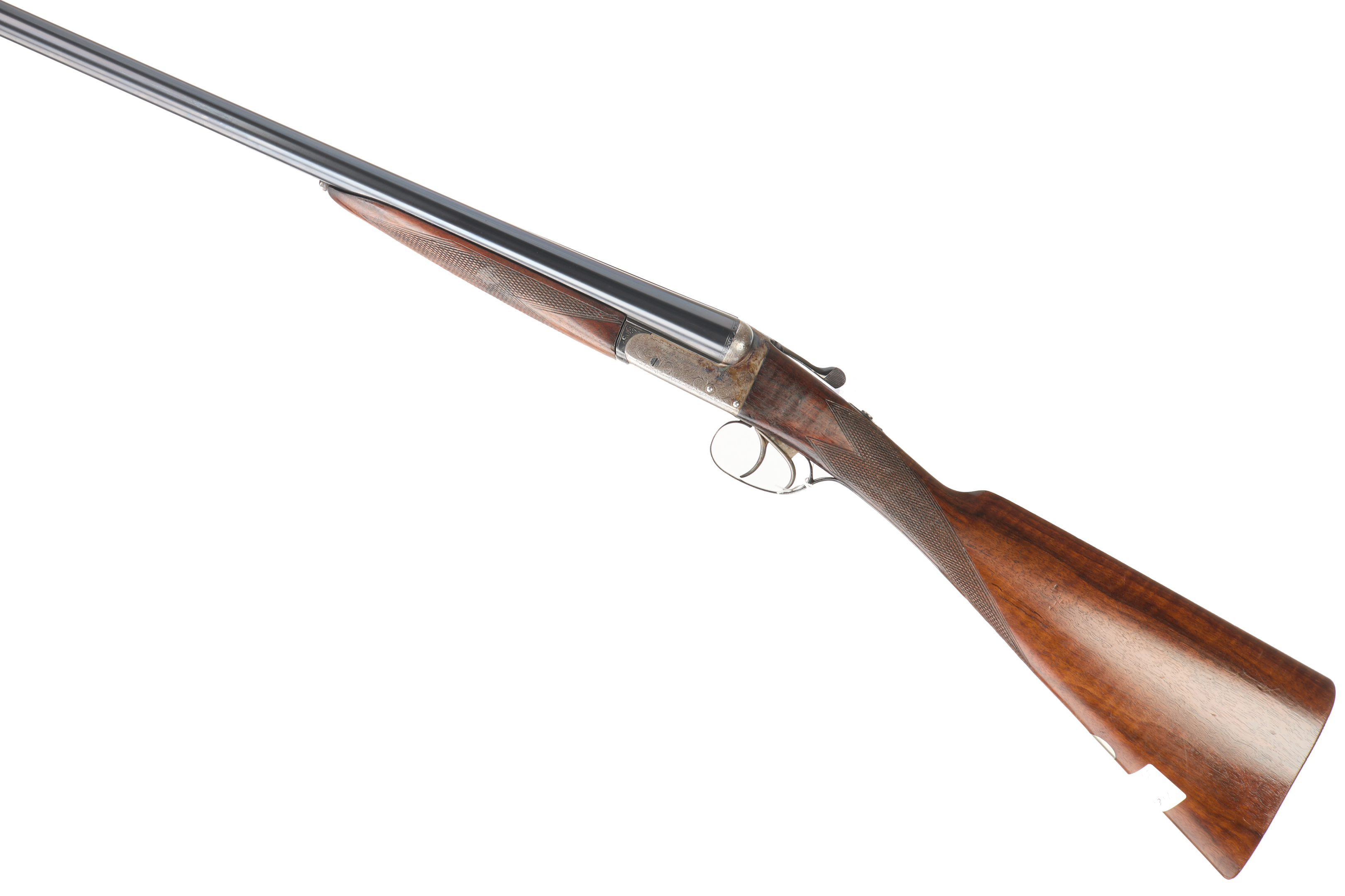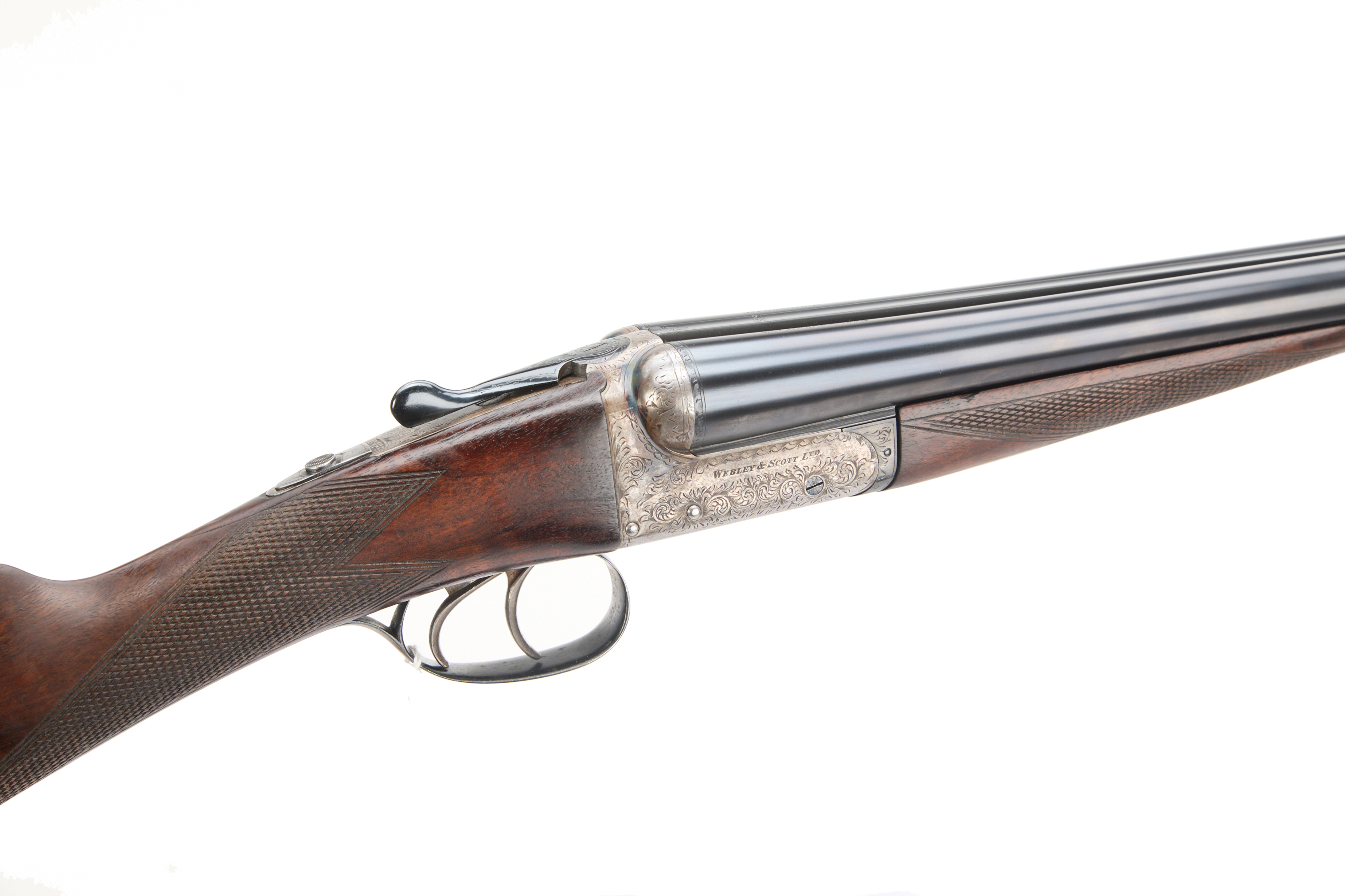 Ribbed butt, chequered straight grip and forend. The barrels engraved ‘WEBLEY & SCOTT BIRMINGHAM’. Treble grip action, hold open top lever, automatic safety with ‘SAFE’ engraved. The action engraved with acanthus scrolling and fine edging.