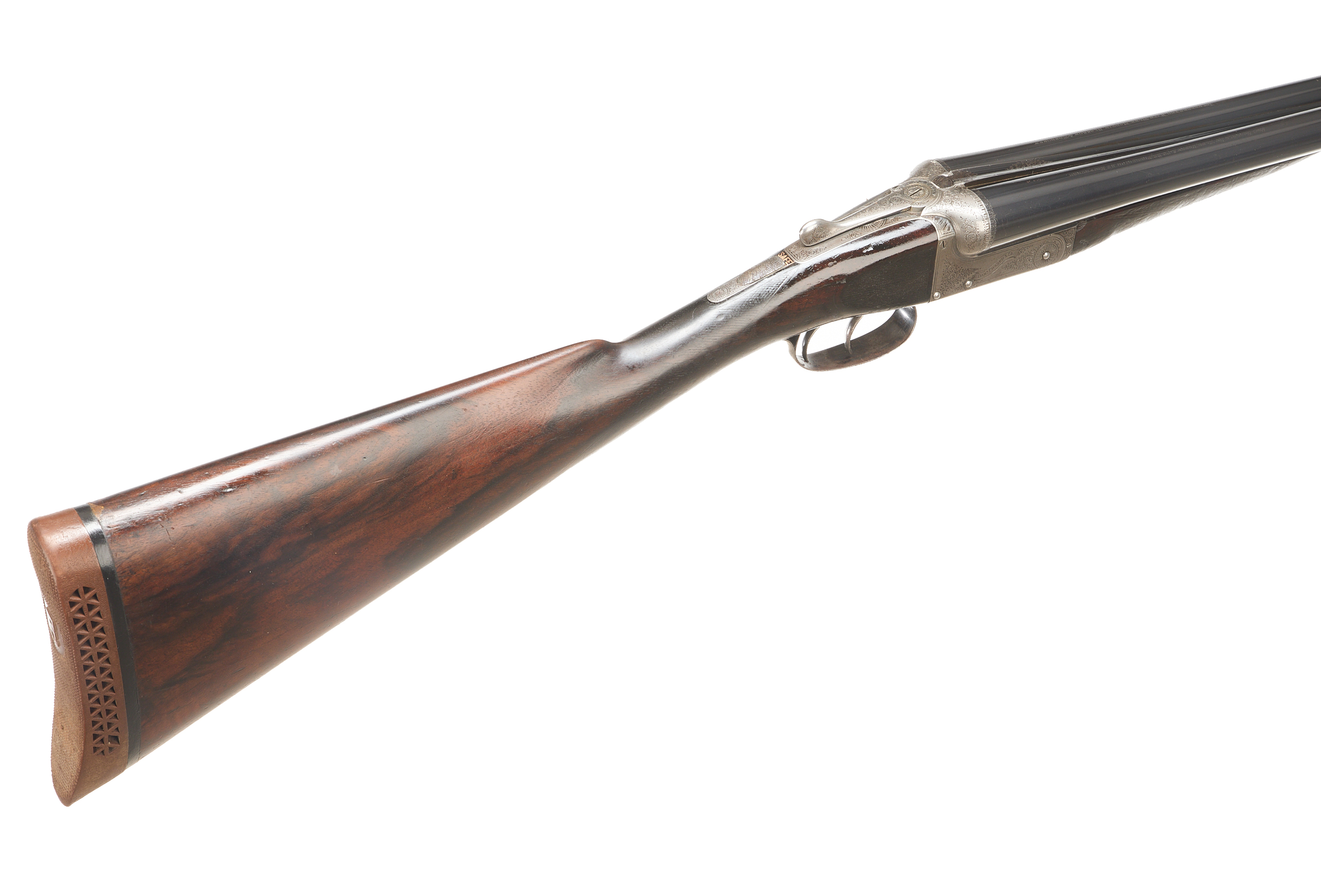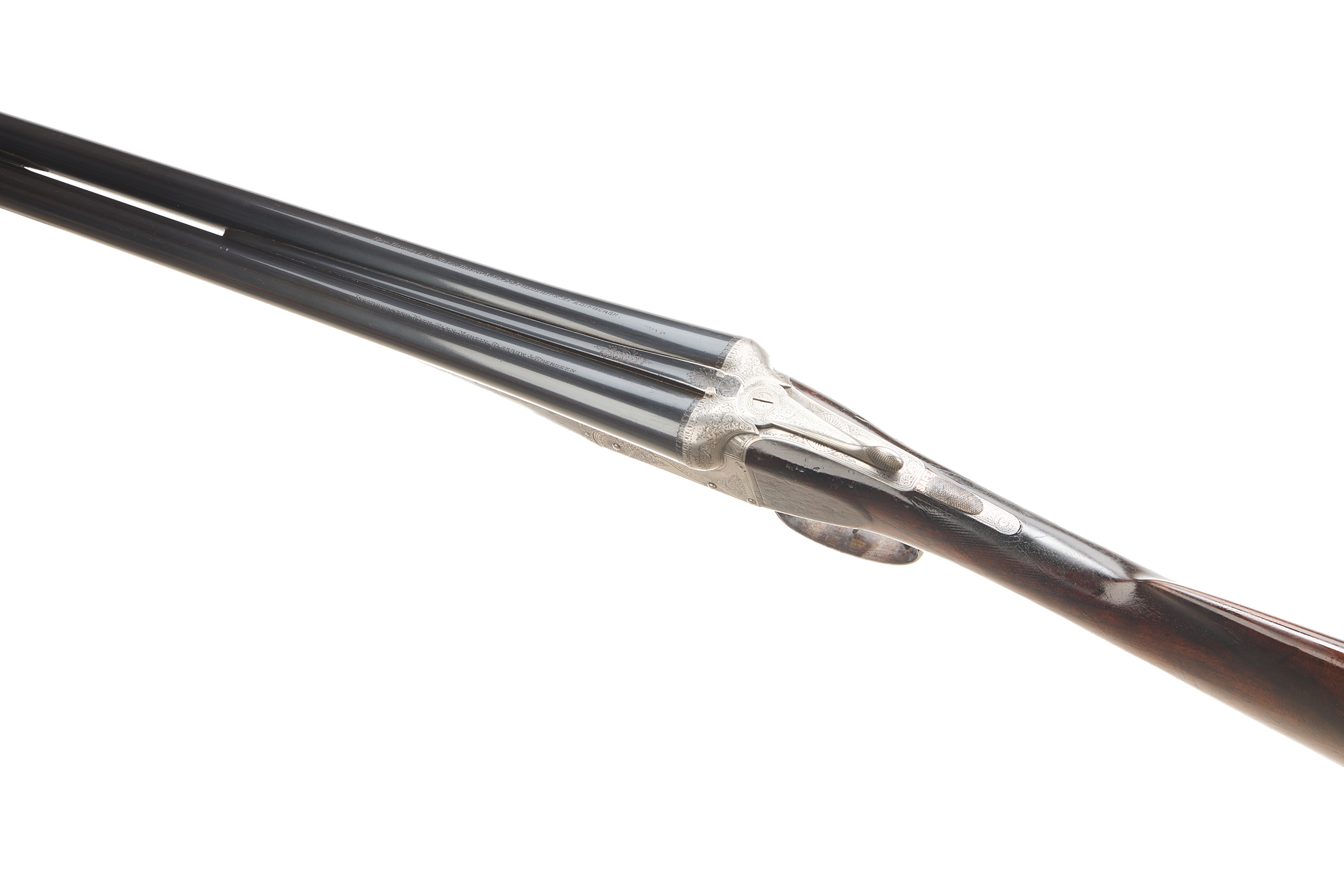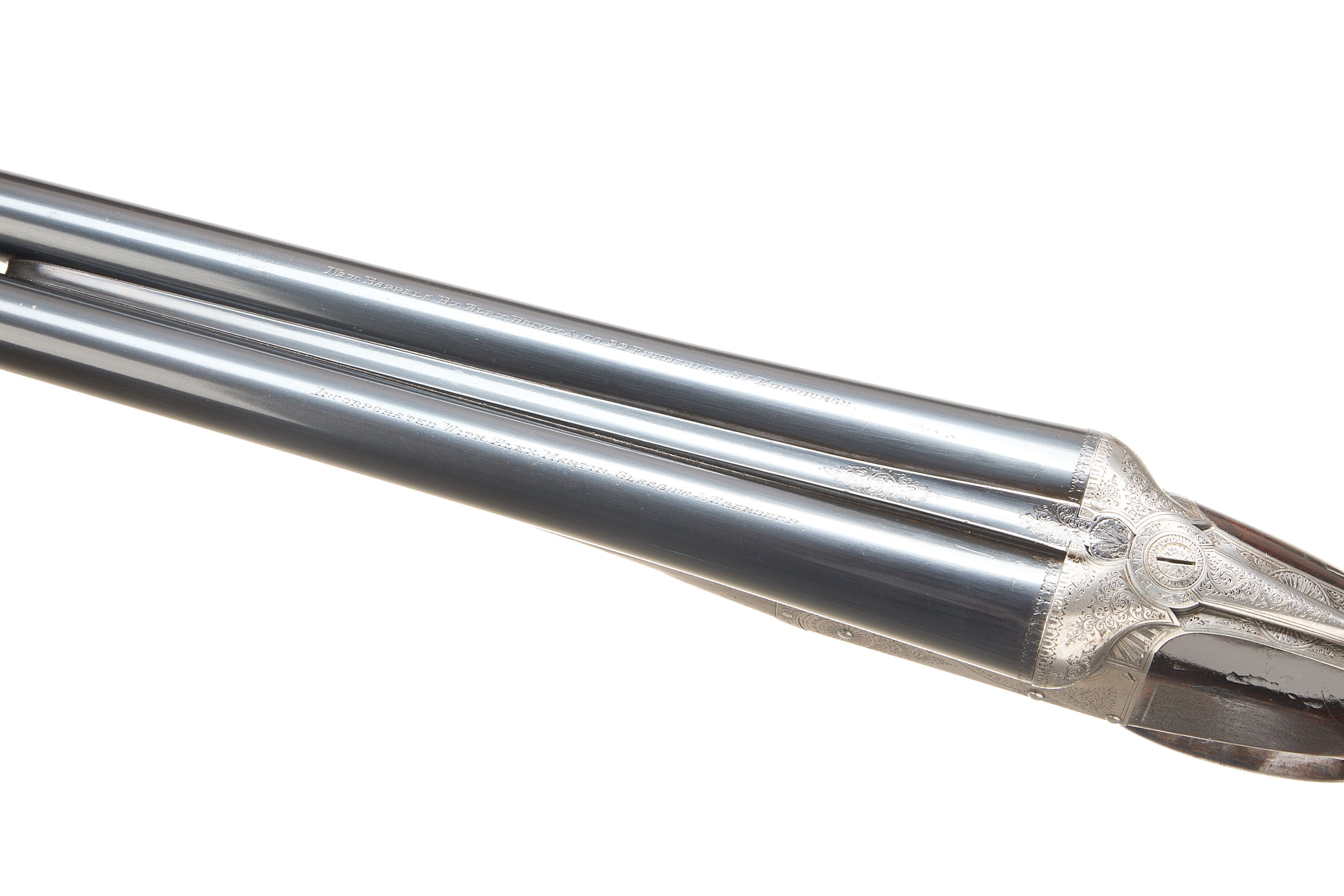 Parker Hale ventilated butt pad, straight grip and forend with little chequering. Replaced Alex Martin ribless barrels engraved ‘NEW BARRELS BY ALEX. HENRY & Co. 22 FREDERICK ST. EDINBURGH’, ‘INCORPORTAED WITH ALEX.MARTIN GLASGOW & ABERDEEN’. Treble grip action, removable striker discs, slender hold open top lever, automatic safety with ‘SAFE’ inlaid in gold. The action finely engraved with bouquets and extensive acanthus scrolling, ‘DANL FRASER & CO’ on a scroll to the sides.