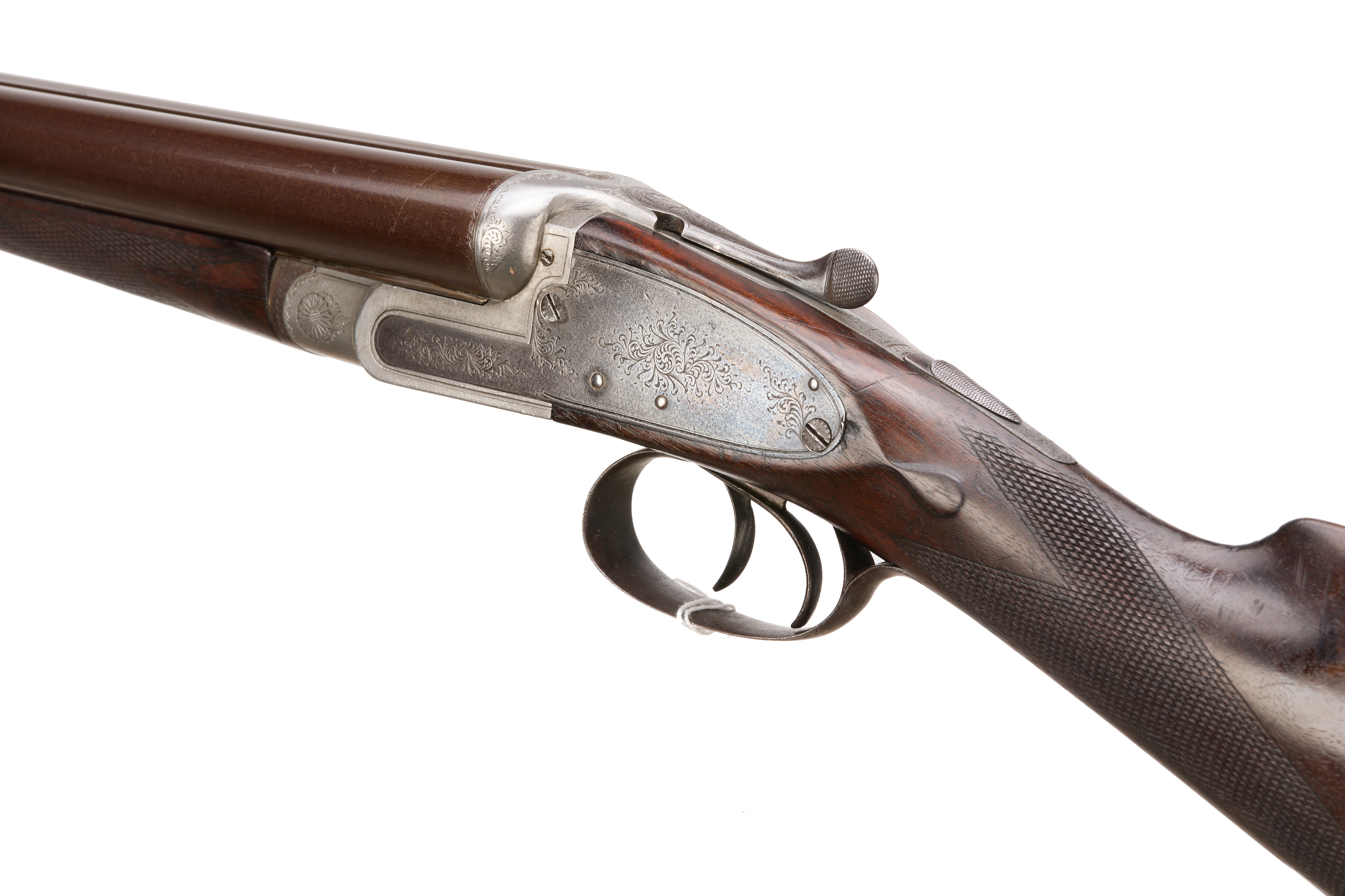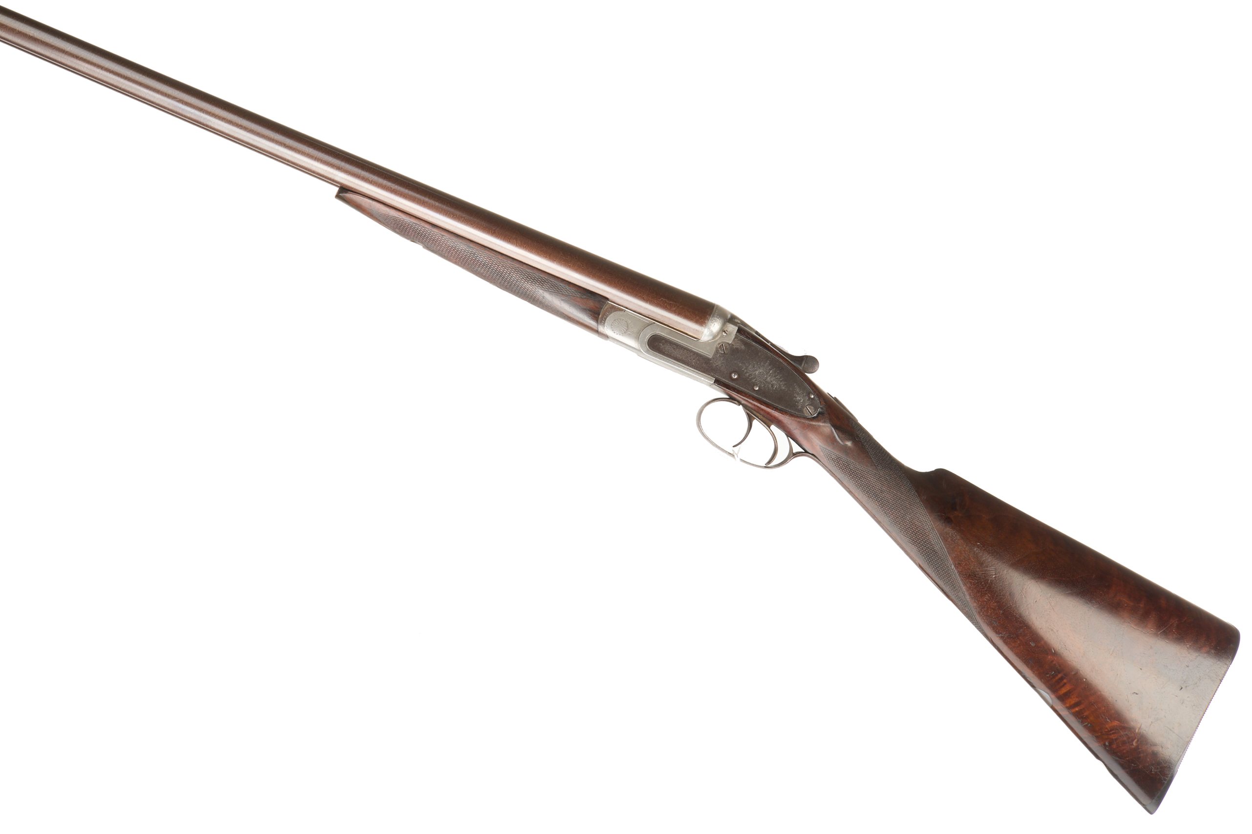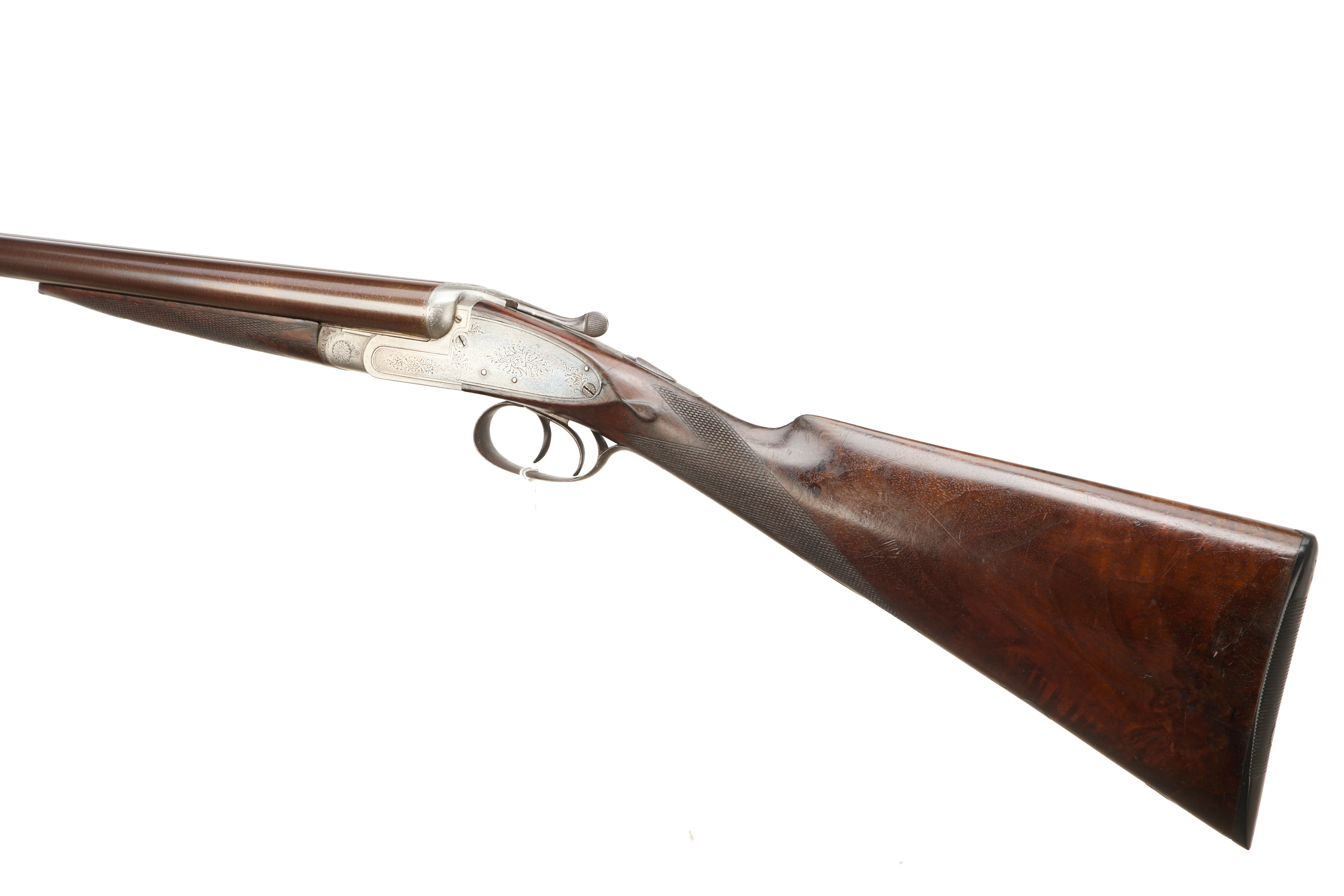 Ribbed, fine ebonite pad, chequered straight grip and forend. Damascus barrels, Deeley edge lever forend release, rib engraved ‘THOMAS HORSLEY, MAKER, YORK. PATENT 2410’. Doll’s head extension, Baker ejectors, automatic safety with ‘SAFE’. Unsigned action of typical Horsley form, with scroll highlight to simply edged locks. Marriage of 1866 barrels to another action c. 1890 with Baker ejectors added, nitro reproof 1986.