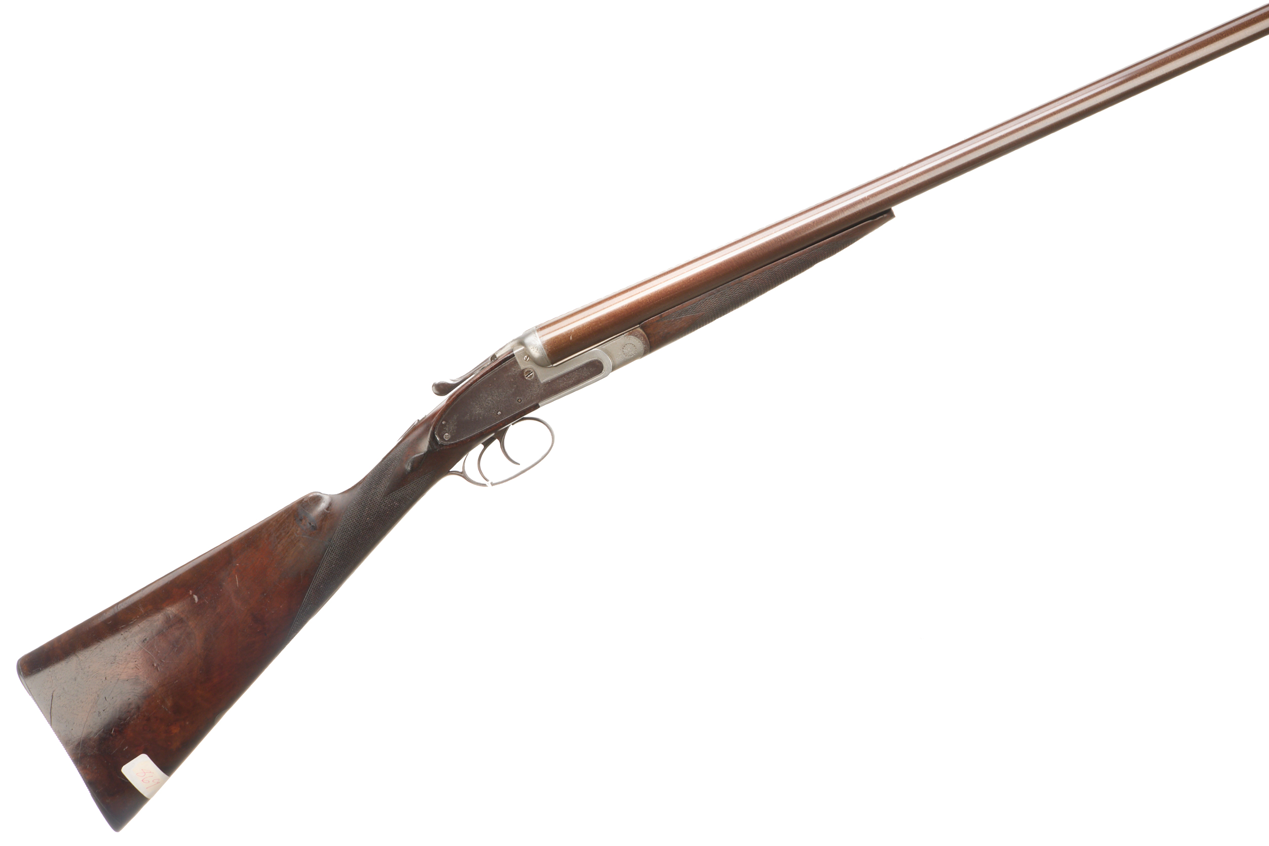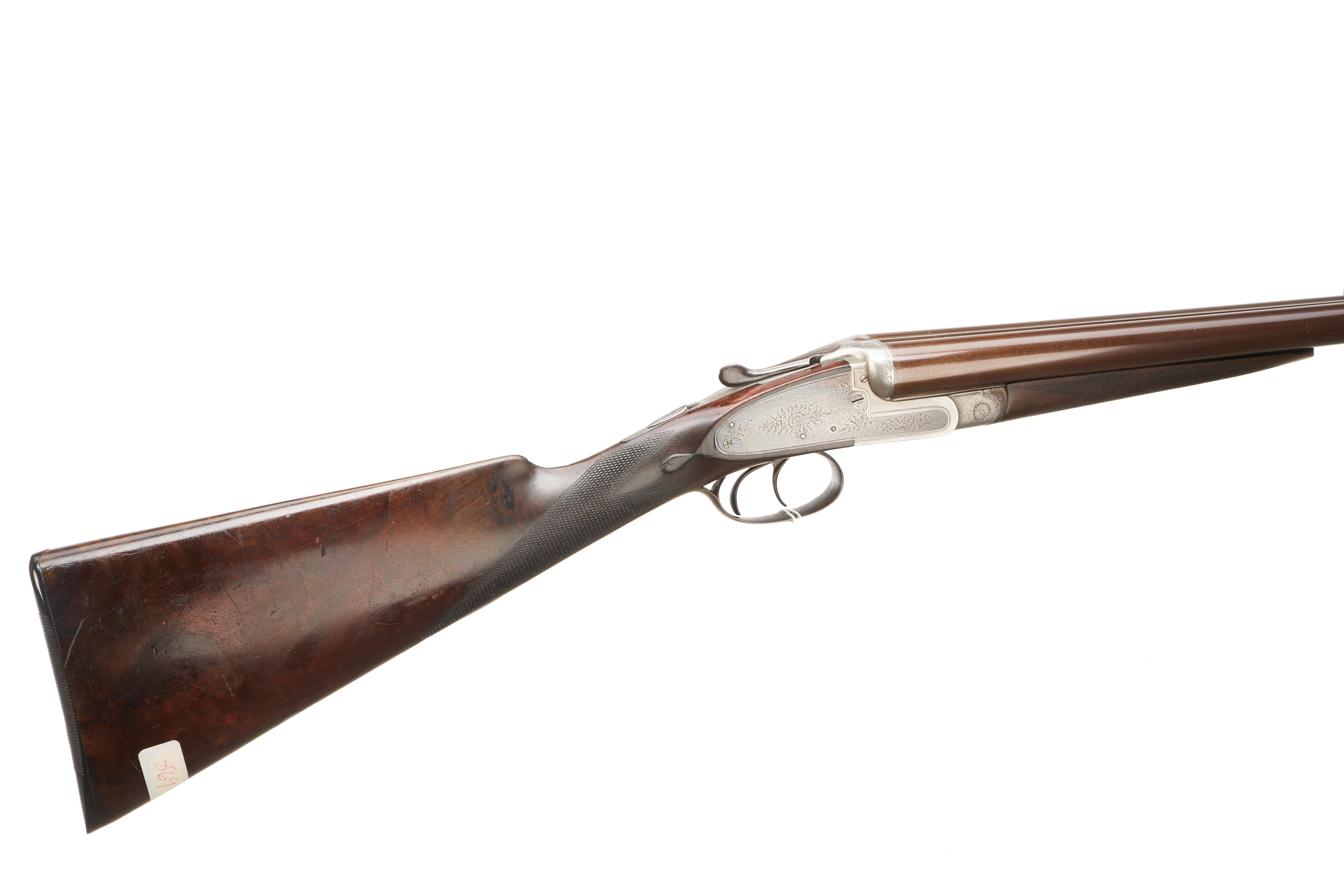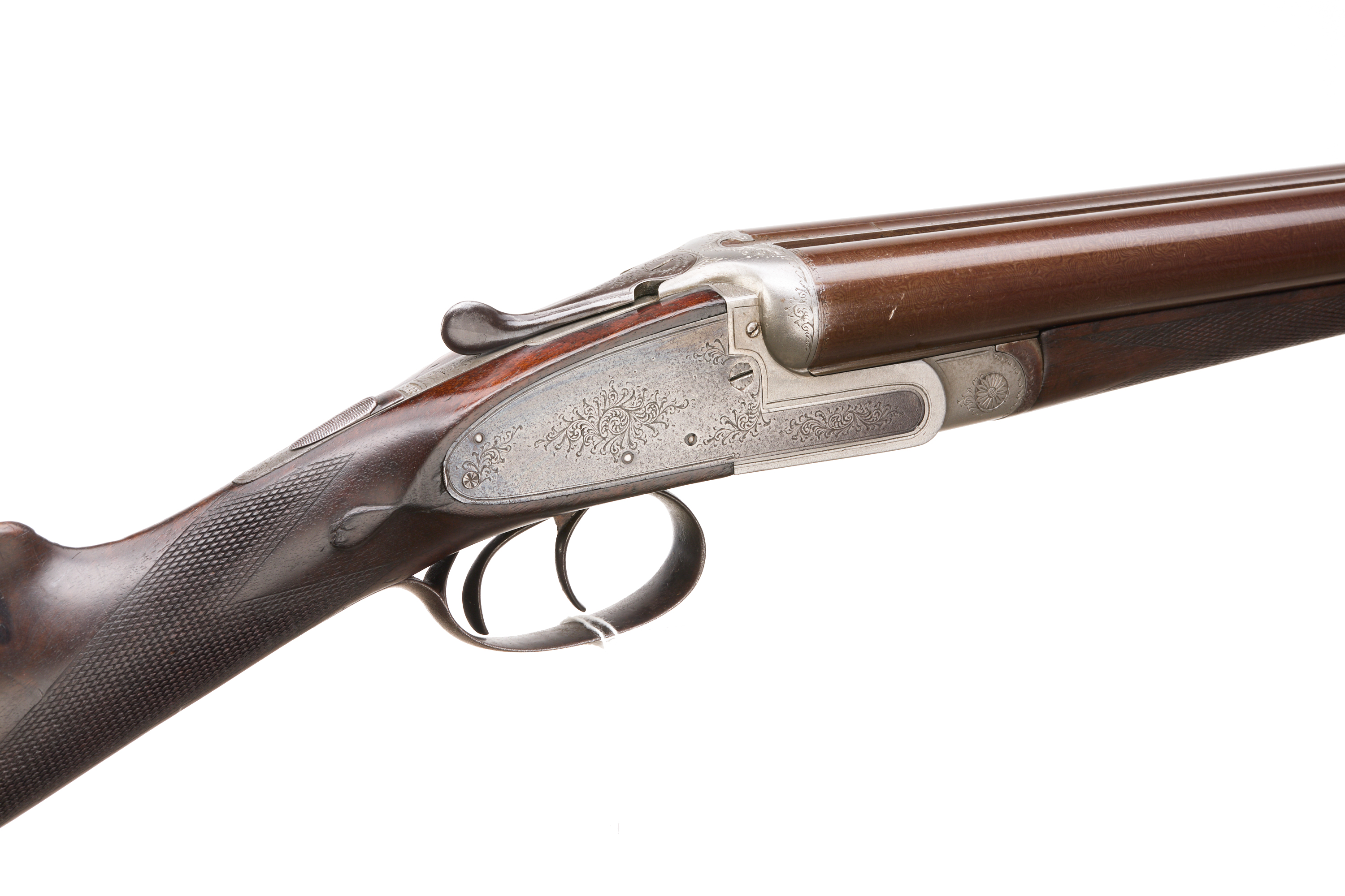 Ribbed, fine ebonite pad, chequered straight grip and forend. Damascus barrels, Deeley edge lever forend release, rib engraved ‘THOMAS HORSLEY, MAKER, YORK. PATENT 2410’. Doll’s head extension, Baker ejectors, automatic safety with ‘SAFE’. Unsigned action of typical Horsley form, with scroll highlight to simply edged locks. Marriage of 1866 barrels to another action c. 1890 with Baker ejectors added, nitro reproof 1986.