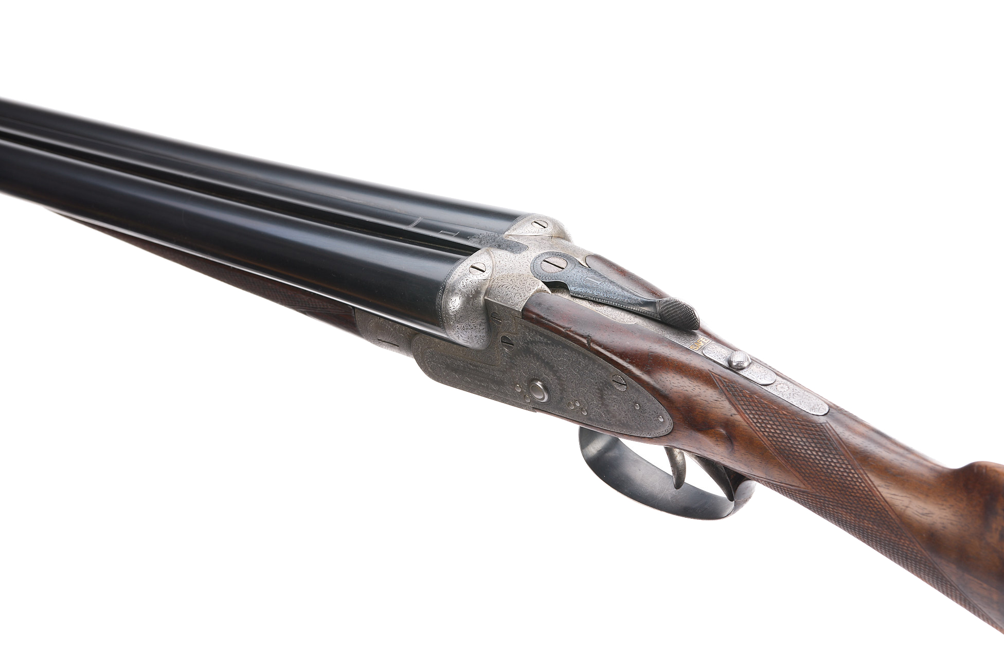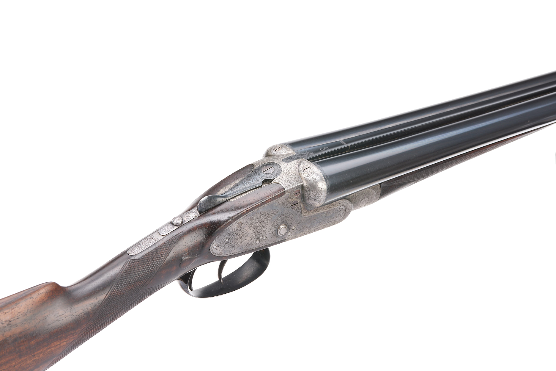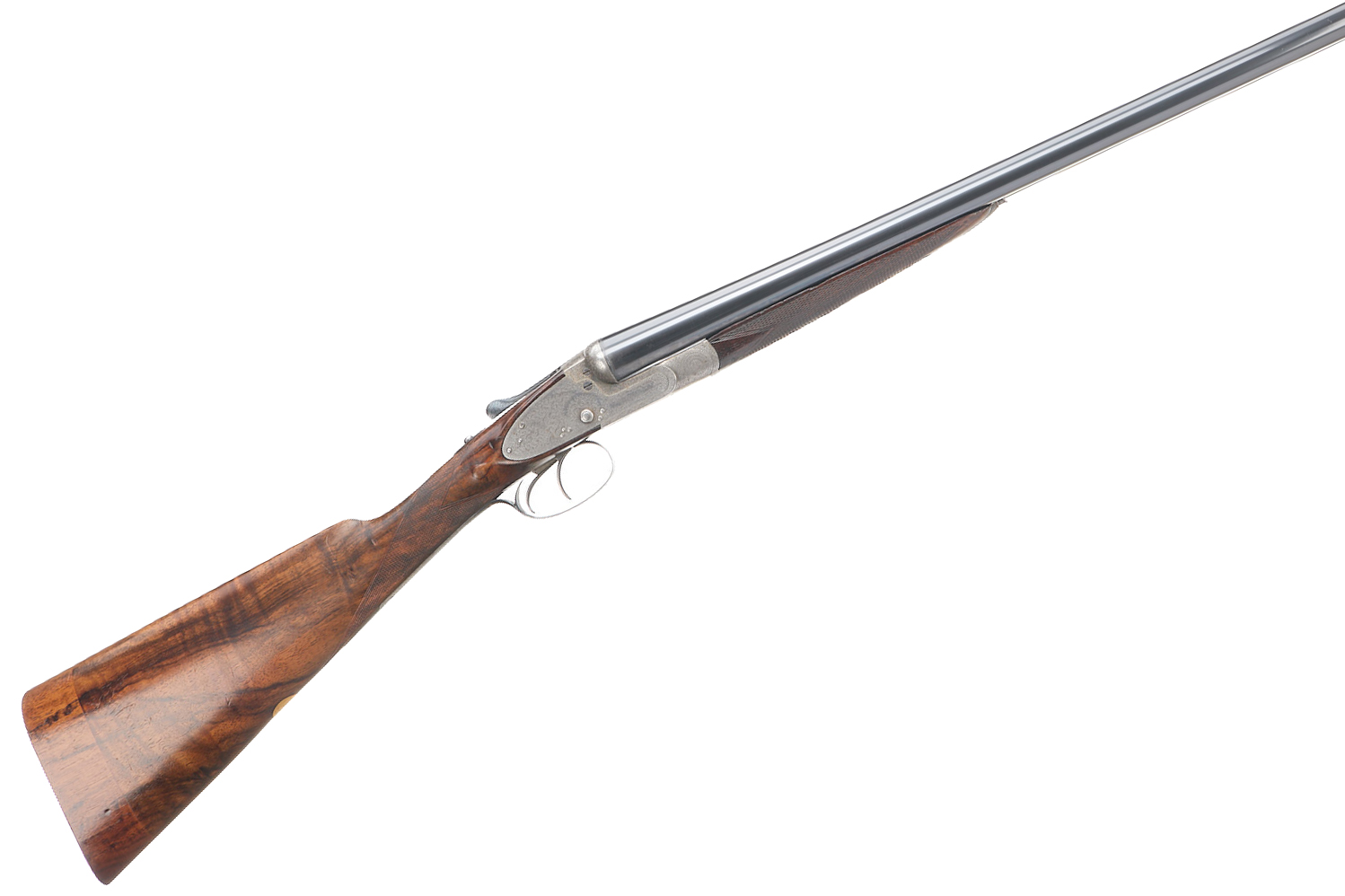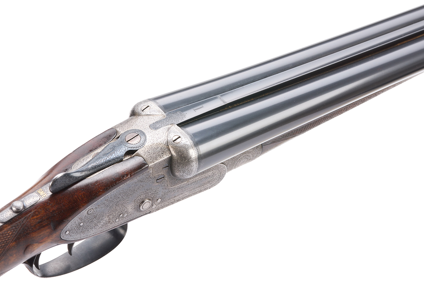 The Pair – Well-matched 1 1/2" ribbed extension to butt, nicely-figured straight grip stock with gold escutcheon, finely chequered straight grip alongwith the forend. Plain, tapered ribs engraved ‘1’ & ‘2’ respectively, the same to the hold open top levers. Treble grip action, automatic safety with ‘SAFE’ inlaid in gold, cocking indicators. The actions retaining some original colour, extensively adorned and finely engraved with extensive acanthus bouquets. With oak, leather and brass cornered double case opening to a blue baize lined interior marked E.M. Reilly & Co Gun & Rifle Makers, 227 Oxford Street London. Chambers 2 1/2", Choke No 1 – Imp, 1/4; No 2 – Cyl, 1/4, Barrels 28", Pull 14 1/2", OAL 44 7/8"