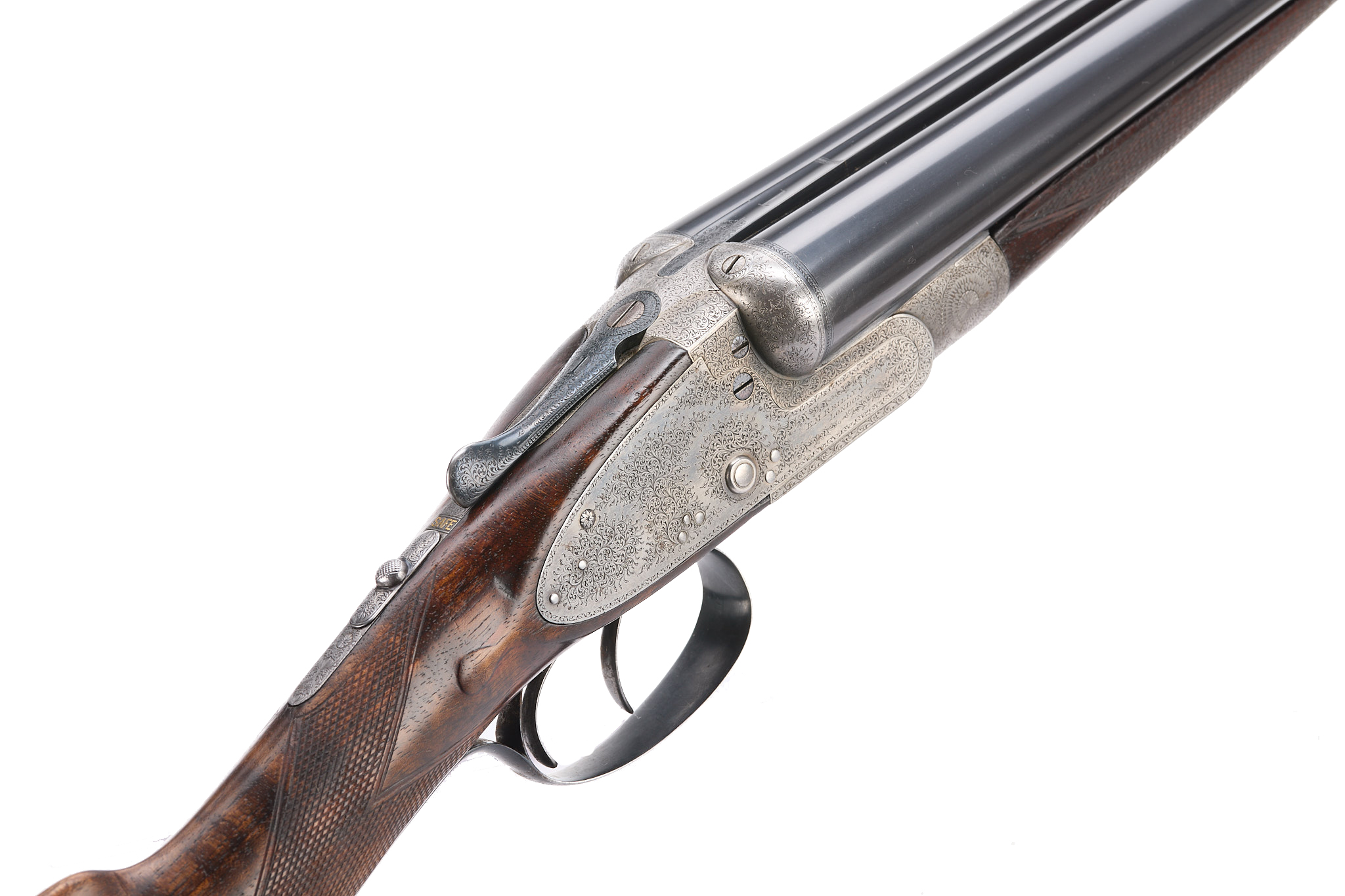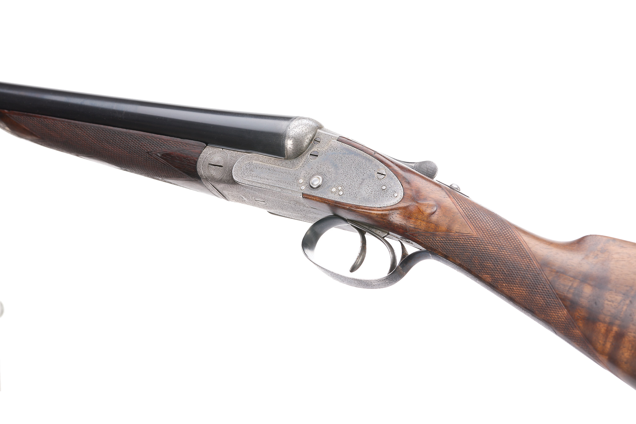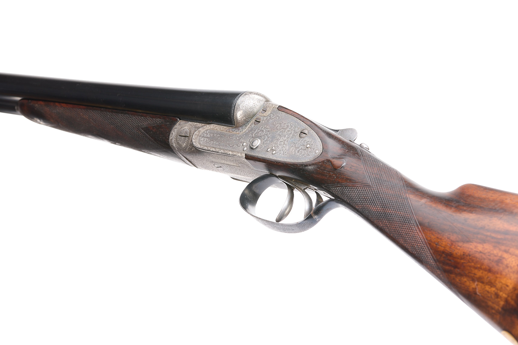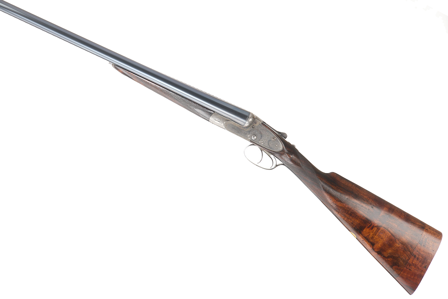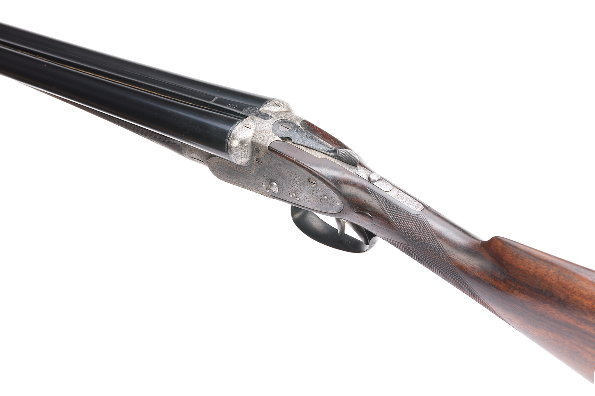 The Pair – Well-matched 1 1/2" ribbed extension to butt, nicely-figured straight grip stock with gold escutcheon, finely chequered straight grip alongwith the forend. Plain, tapered ribs engraved ‘1’ & ‘2’ respectively, the same to the hold open top levers. Treble grip action, automatic safety with ‘SAFE’ inlaid in gold, cocking indicators. The actions retaining some original colour, extensively adorned and finely engraved with extensive acanthus bouquets. With oak, leather and brass cornered double case opening to a blue baize lined interior marked E.M. Reilly & Co Gun & Rifle Makers, 227 Oxford Street London. Chambers 2 1/2", Choke No 1 – Imp, 1/4; No 2 – Cyl, 1/4, Barrels 28", Pull 14 1/2", OAL 44 7/8"