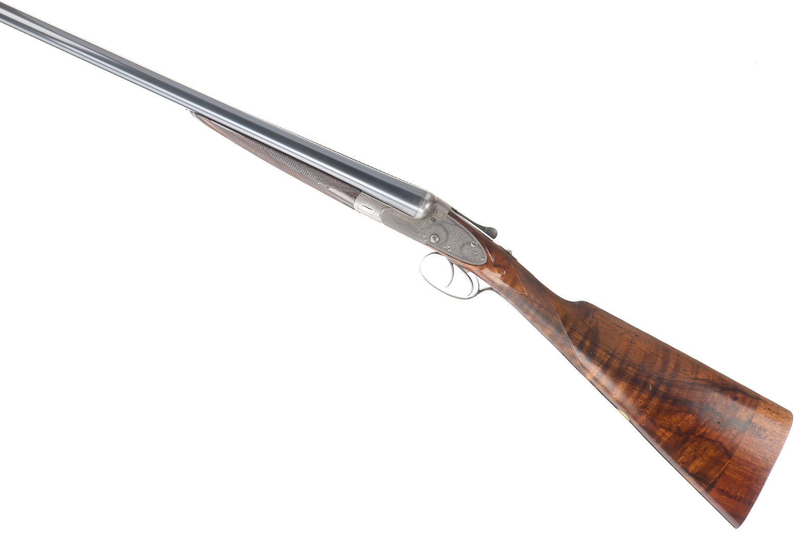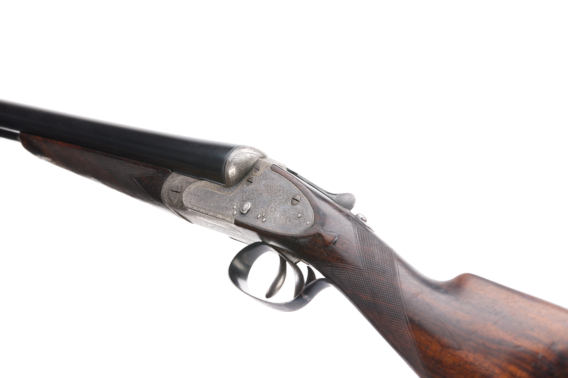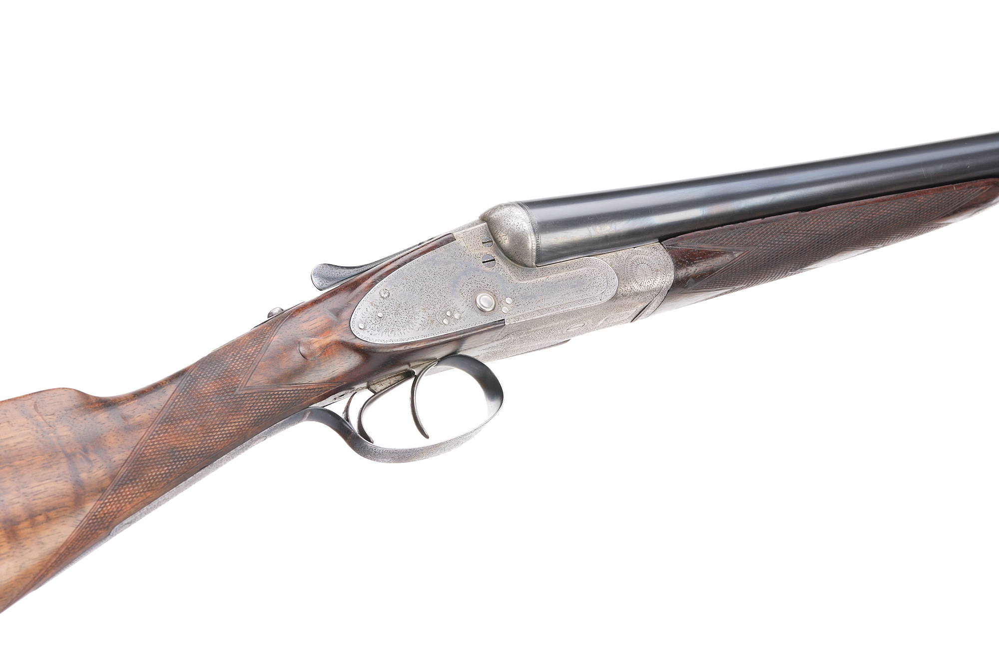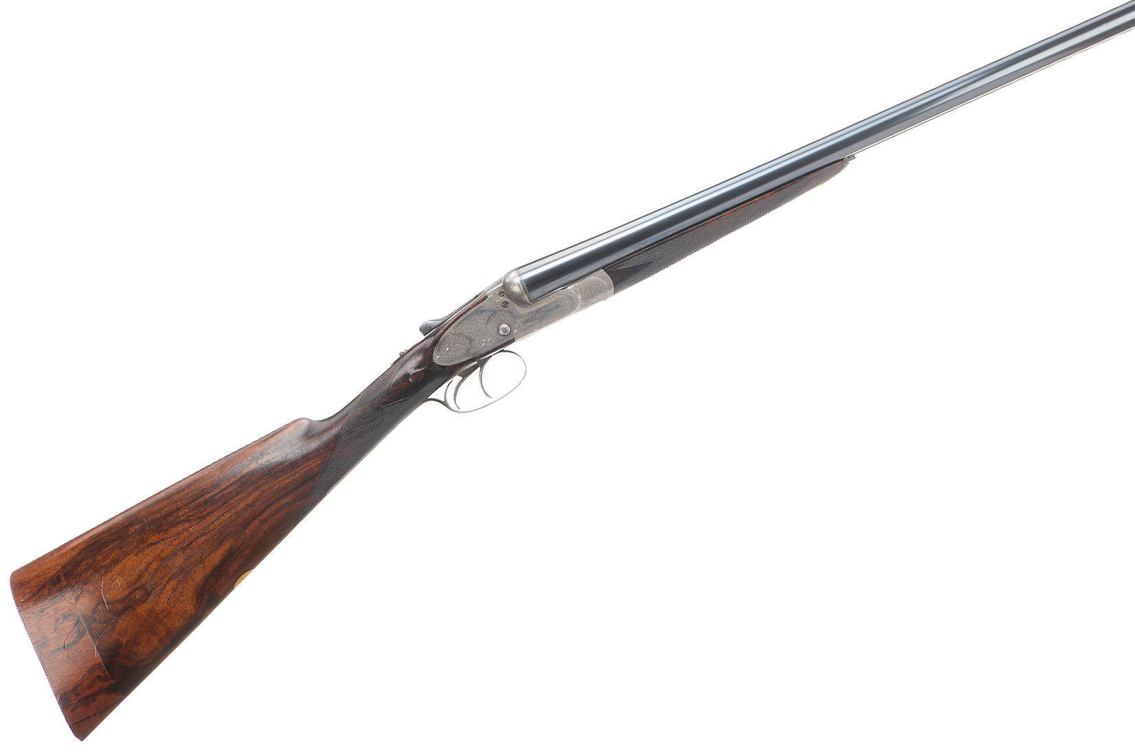 The Pair – Well-matched 1 1/2" ribbed extension to butt, nicely-figured straight grip stock with gold escutcheon, finely chequered straight grip alongwith the forend. Plain, tapered ribs engraved ‘1’ & ‘2’ respectively, the same to the hold open top levers. Treble grip action, automatic safety with ‘SAFE’ inlaid in gold, cocking indicators. The actions retaining some original colour, extensively adorned and finely engraved with extensive acanthus bouquets. With oak, leather and brass cornered double case opening to a blue baize lined interior marked E.M. Reilly & Co Gun & Rifle Makers, 227 Oxford Street London. Chambers 2 1/2", Choke No 1 – Imp, 1/4; No 2 – Cyl, 1/4, Barrels 28", Pull 14 1/2", OAL 44 7/8"