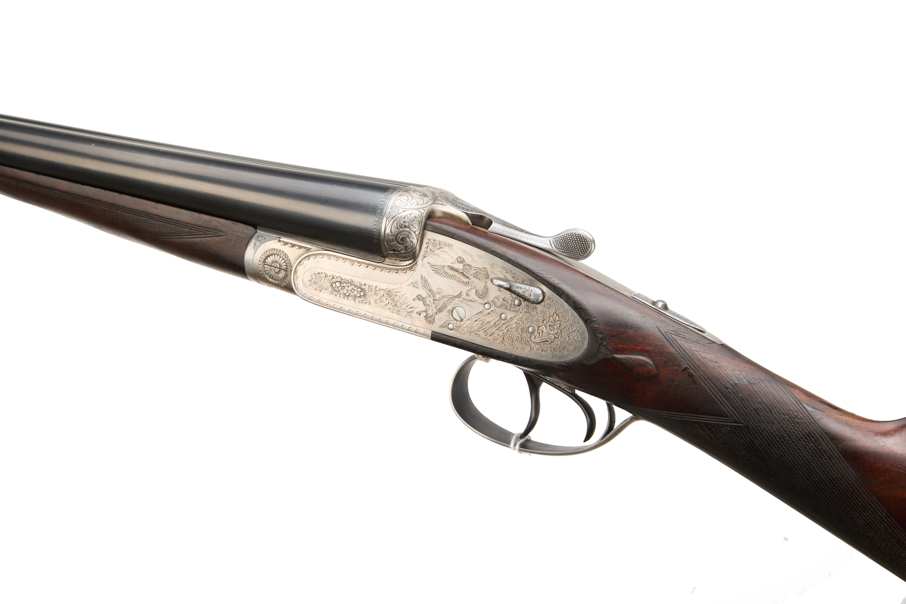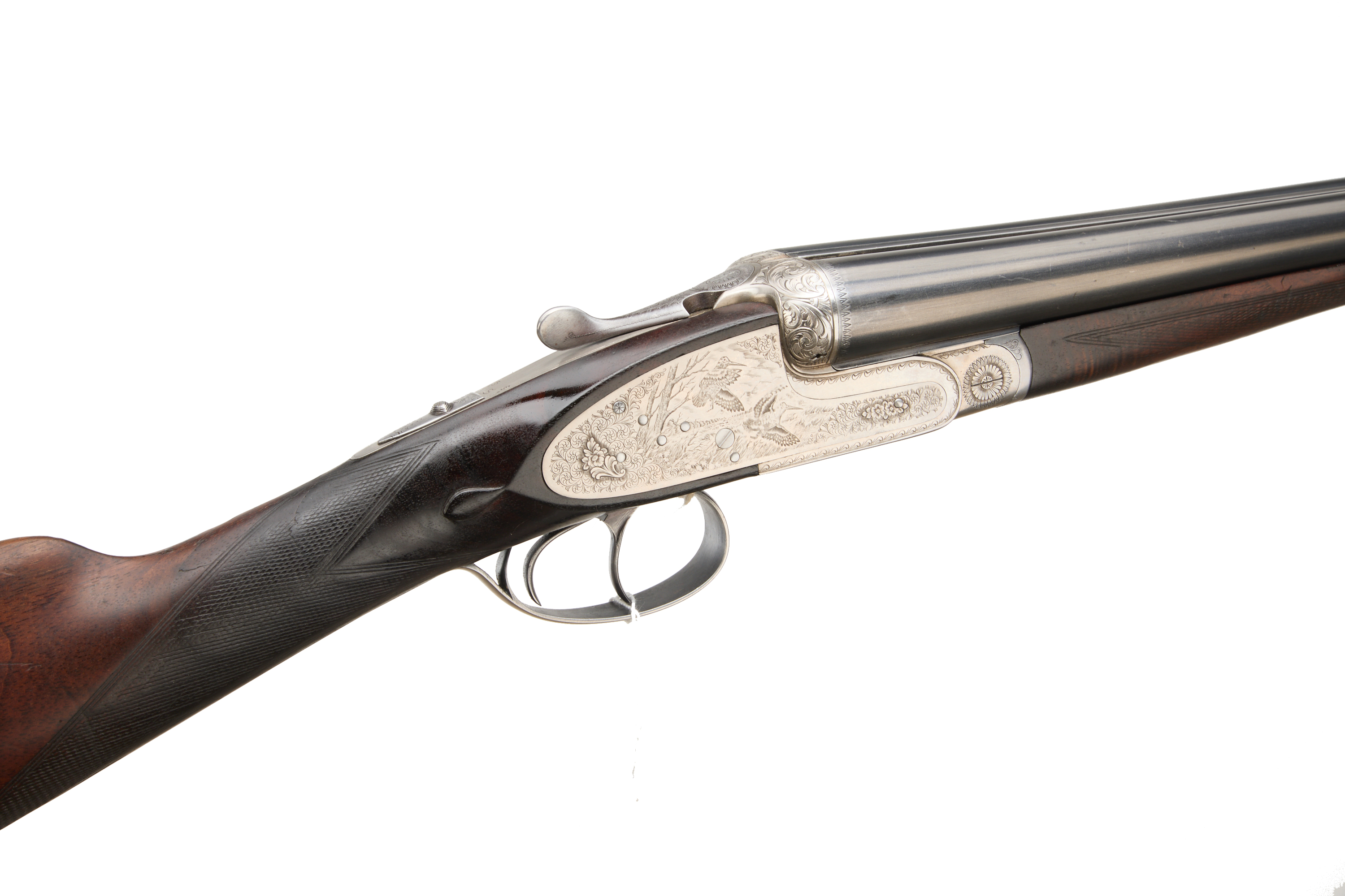 1/4" extension to butt, straight grip and forend. Tapered fine 8mm rib, engraved ‘GUNMARK ROYALE’, disc set strikers, top lever, automatic safety with ‘S’ inlaid in gold. The action with coin finish, engraved with ducks flighting over reeds to the left, woodcock in woodland to the right and partridge to the floorplate. For 1987.
