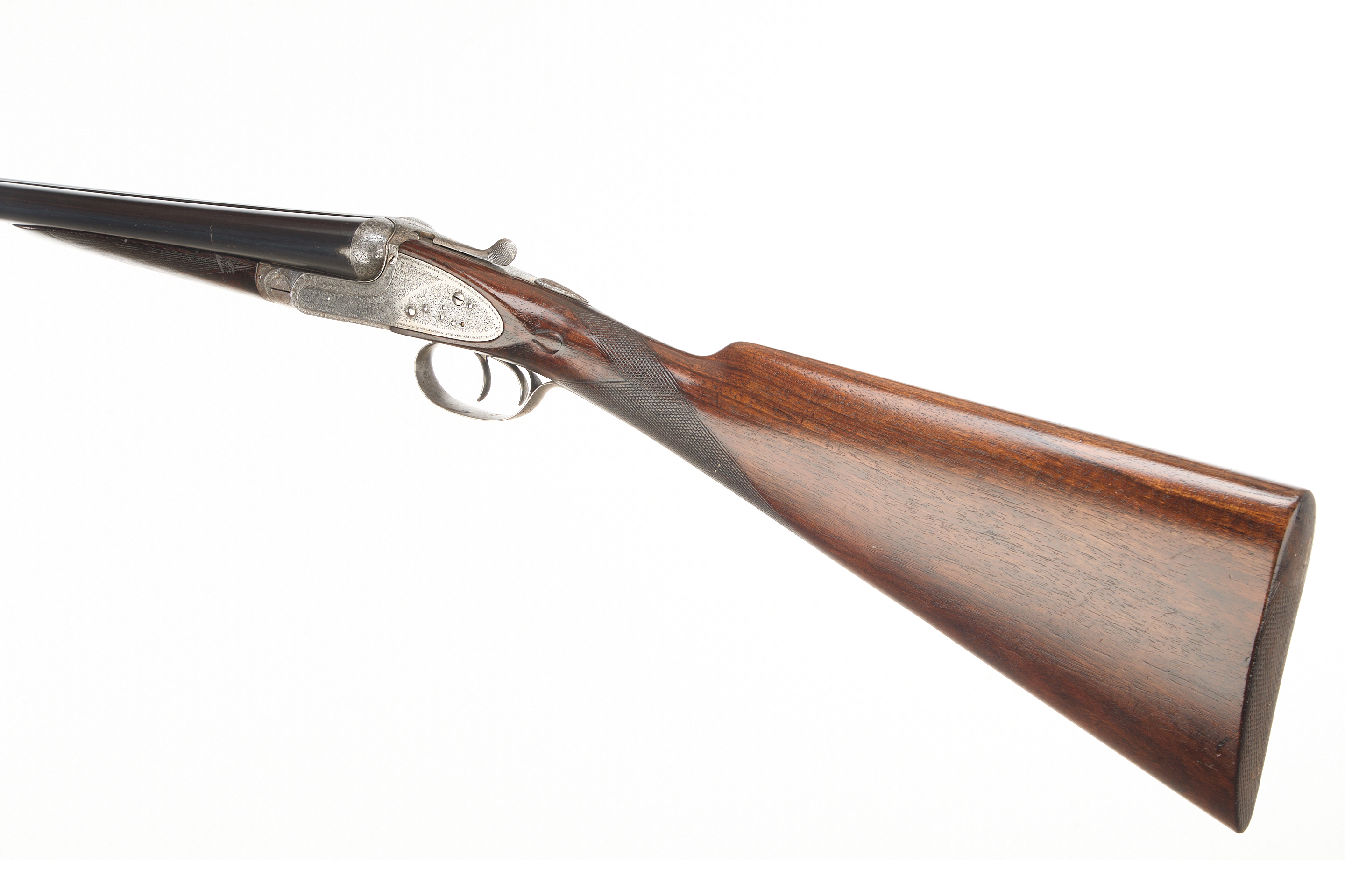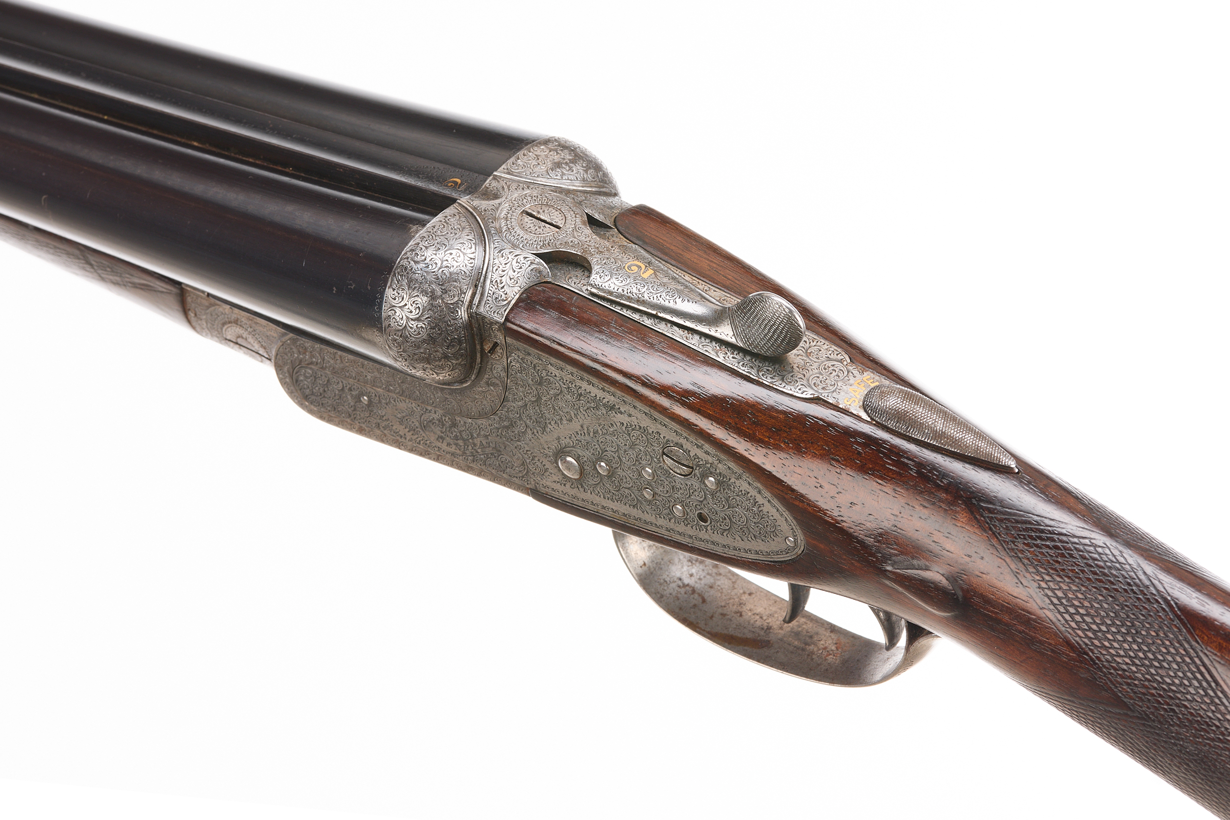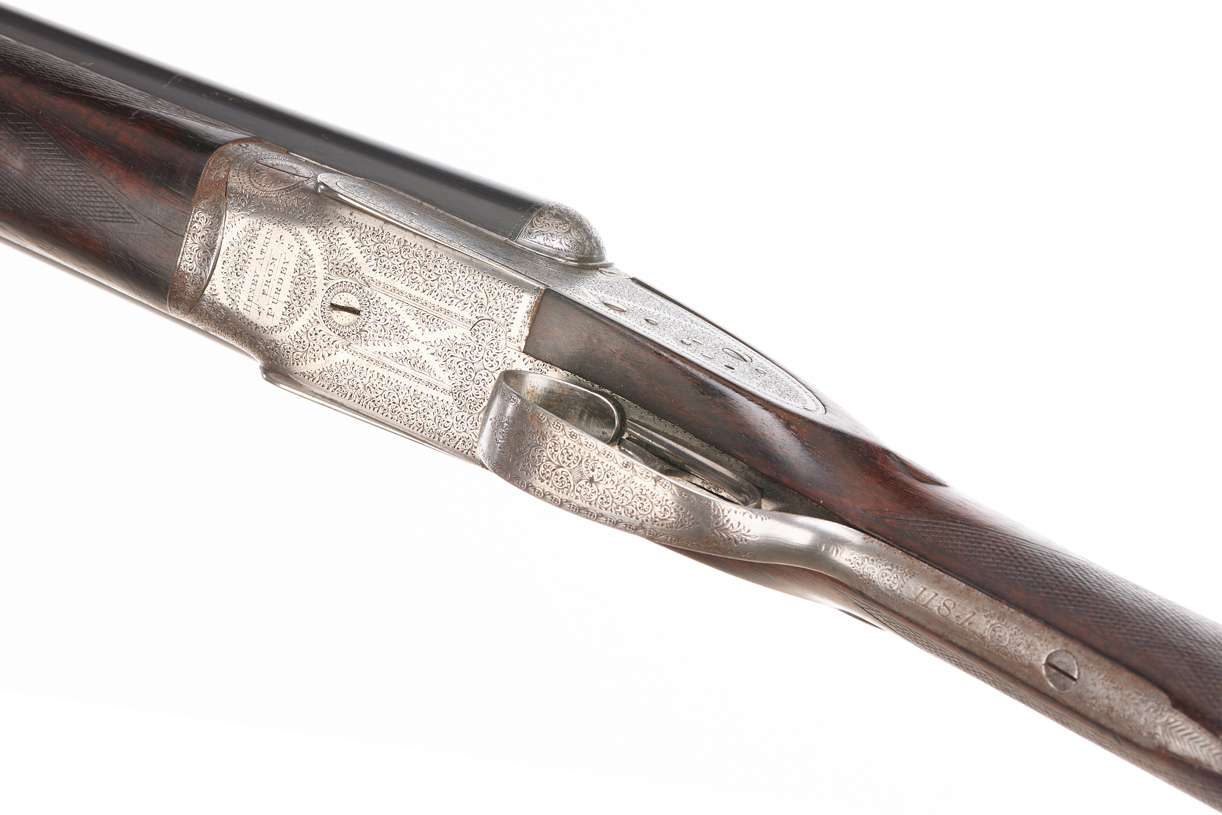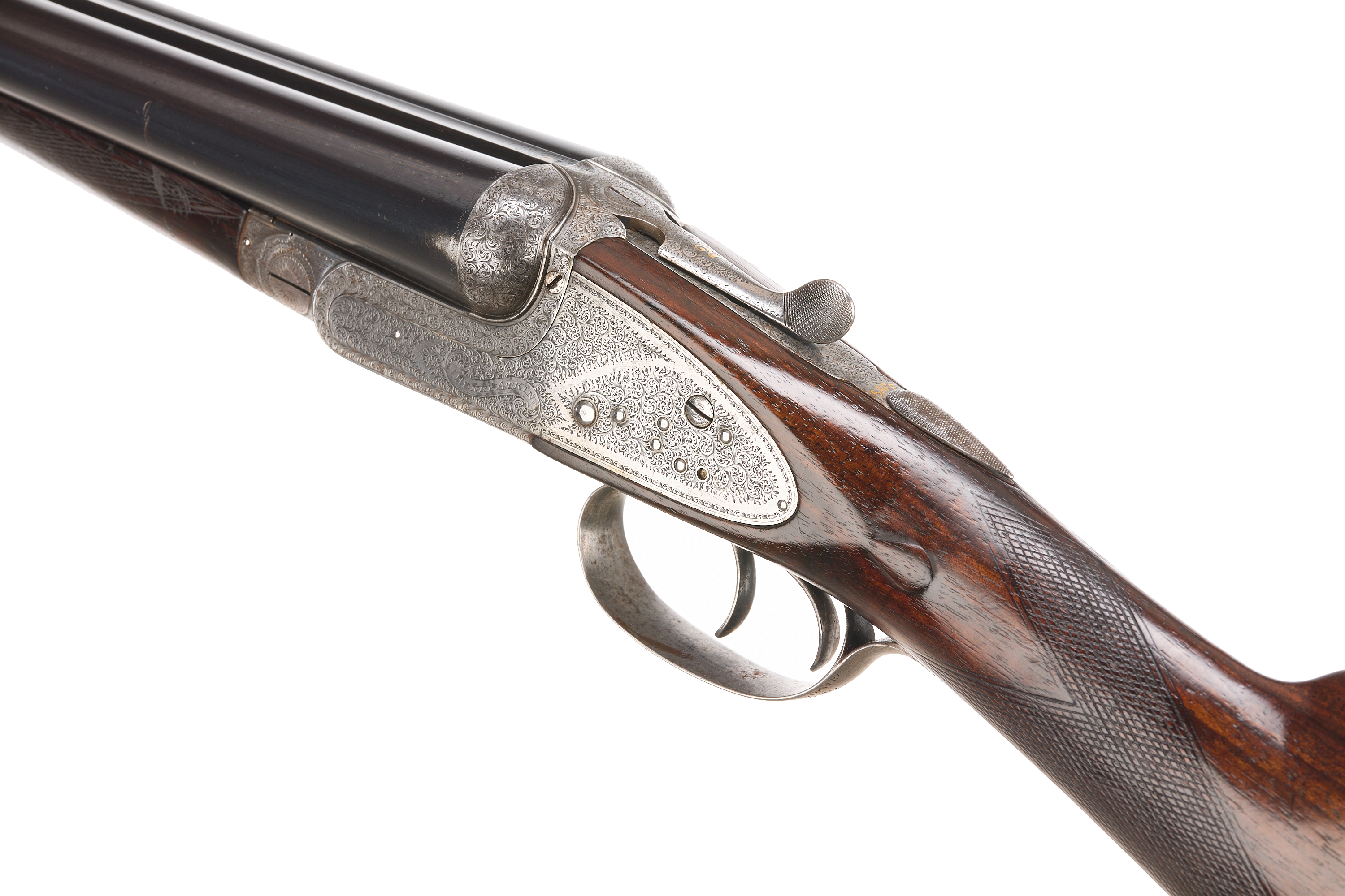 Circa 1899. Chequered butt, straight grip and forend. Rib with gold inlaid ‘2′, manufacturer’s marks faded. Treble grip action, cocking indicators, hold-open top lever, automatic safety with ‘SAFE’ also ‘2’ inlaid in gold. The action finely engraved throughout with bouquets and extensive acanthus scrolling, ‘HENRY ATKIN’ on scrolls to the sides. Reproved London 2010.