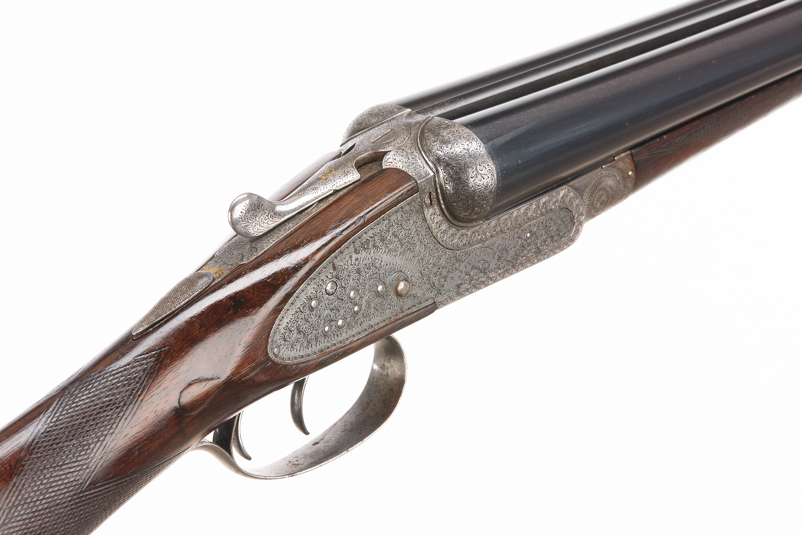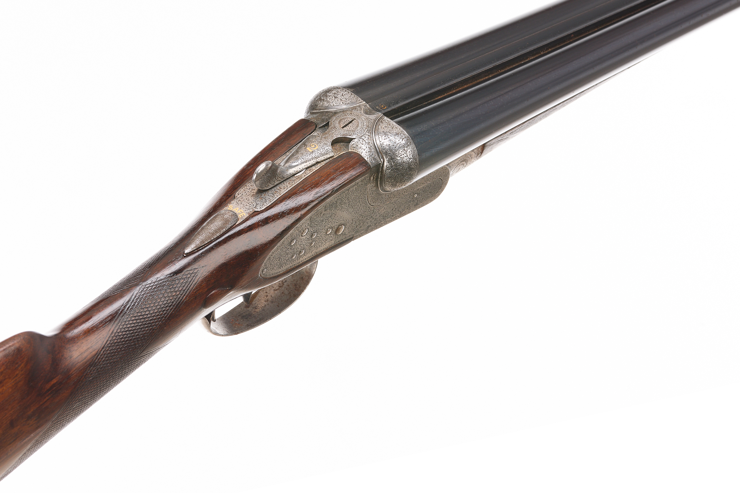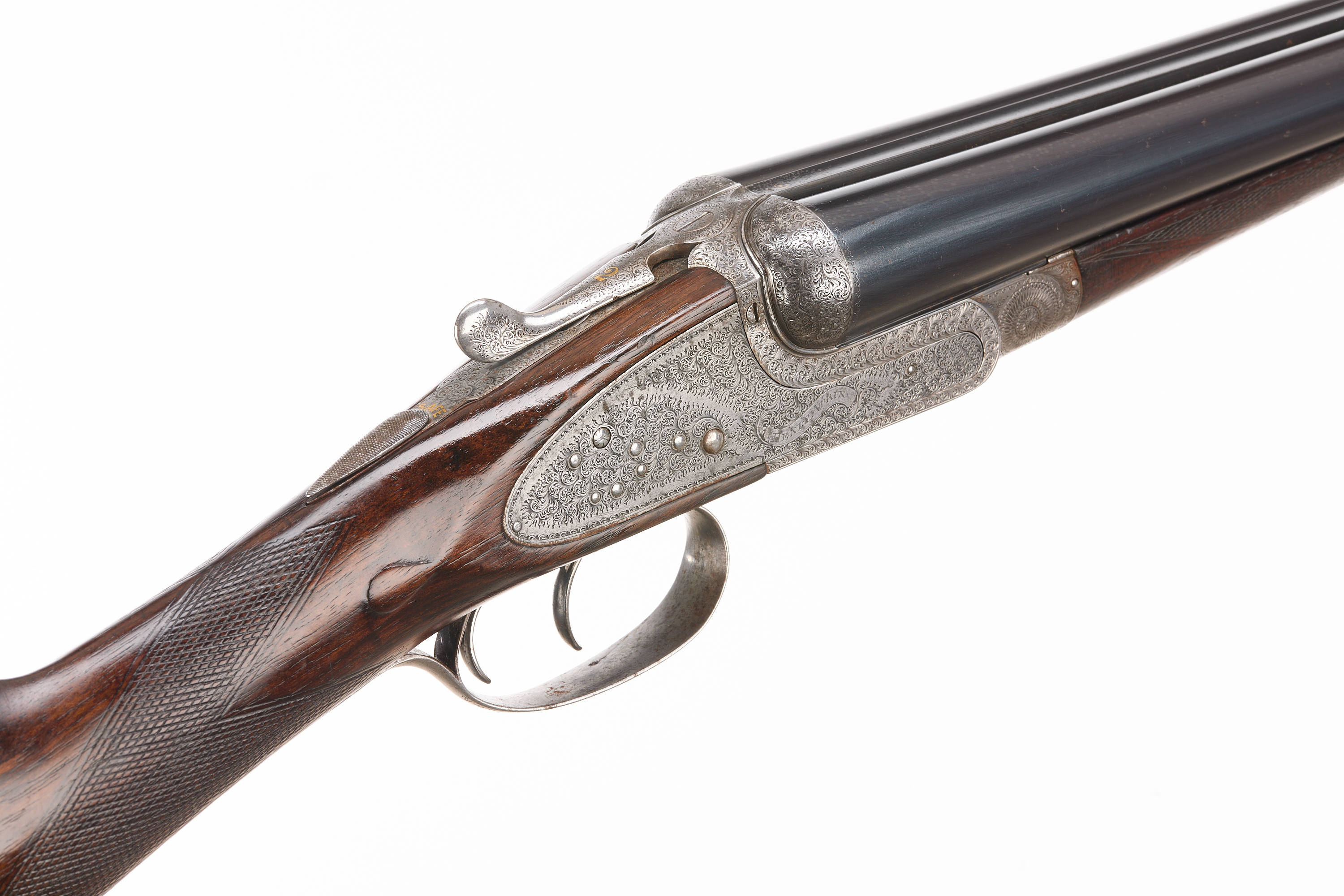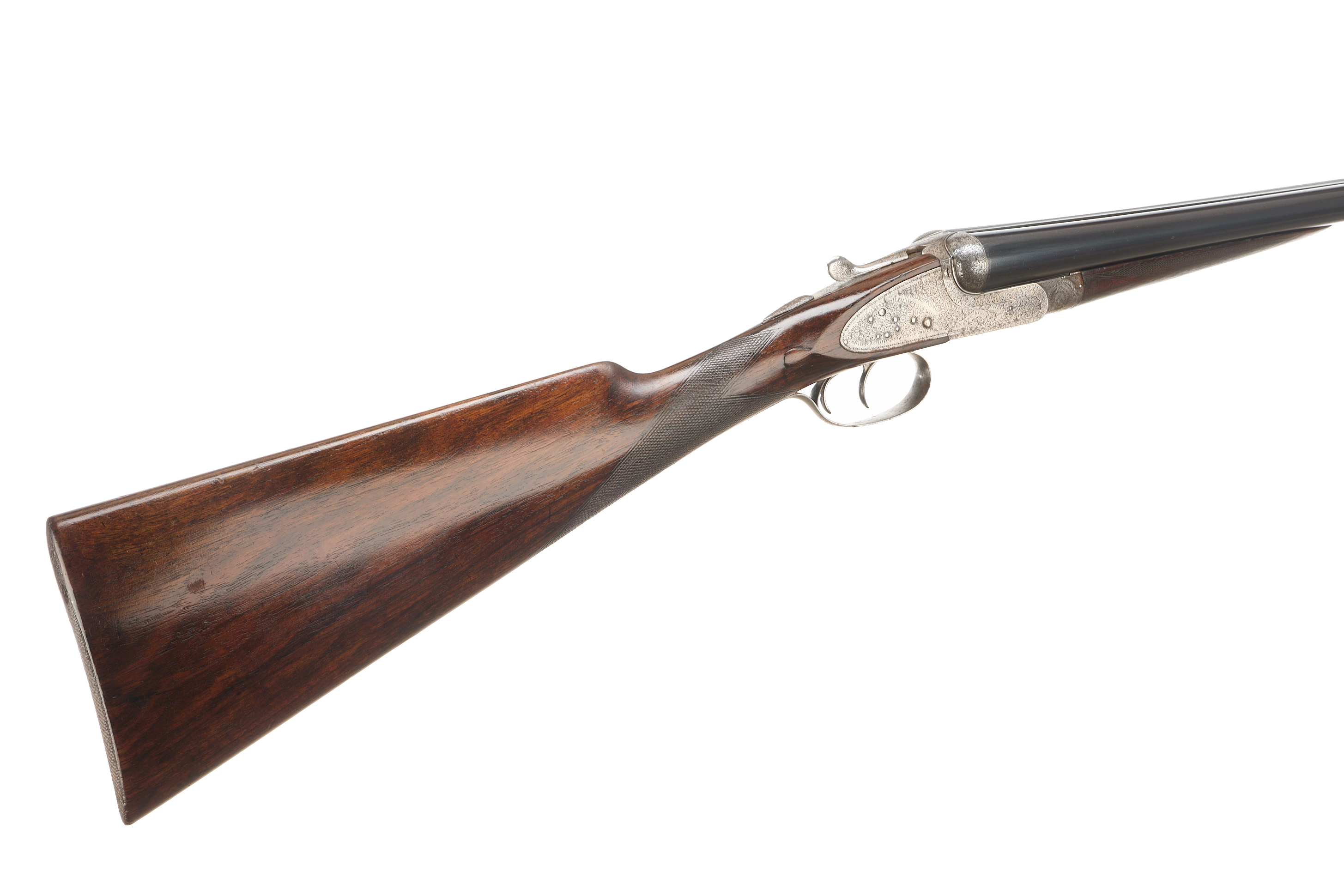 Circa 1899. Chequered butt, straight grip and forend. Rib with gold inlaid ‘2′, manufacturer’s marks faded. Treble grip action, cocking indicators, hold-open top lever, automatic safety with ‘SAFE’ also ‘2’ inlaid in gold. The action finely engraved throughout with bouquets and extensive acanthus scrolling, ‘HENRY ATKIN’ on scrolls to the sides. Reproved London 2010.