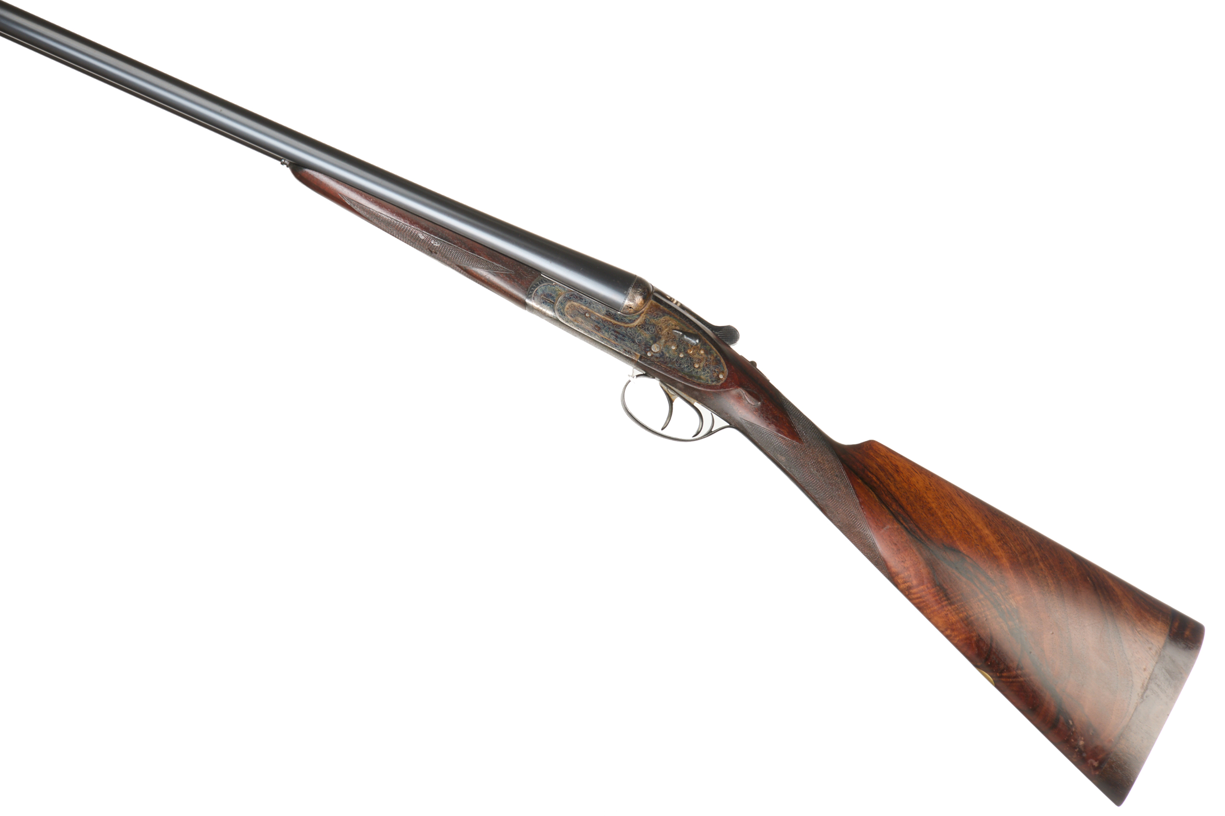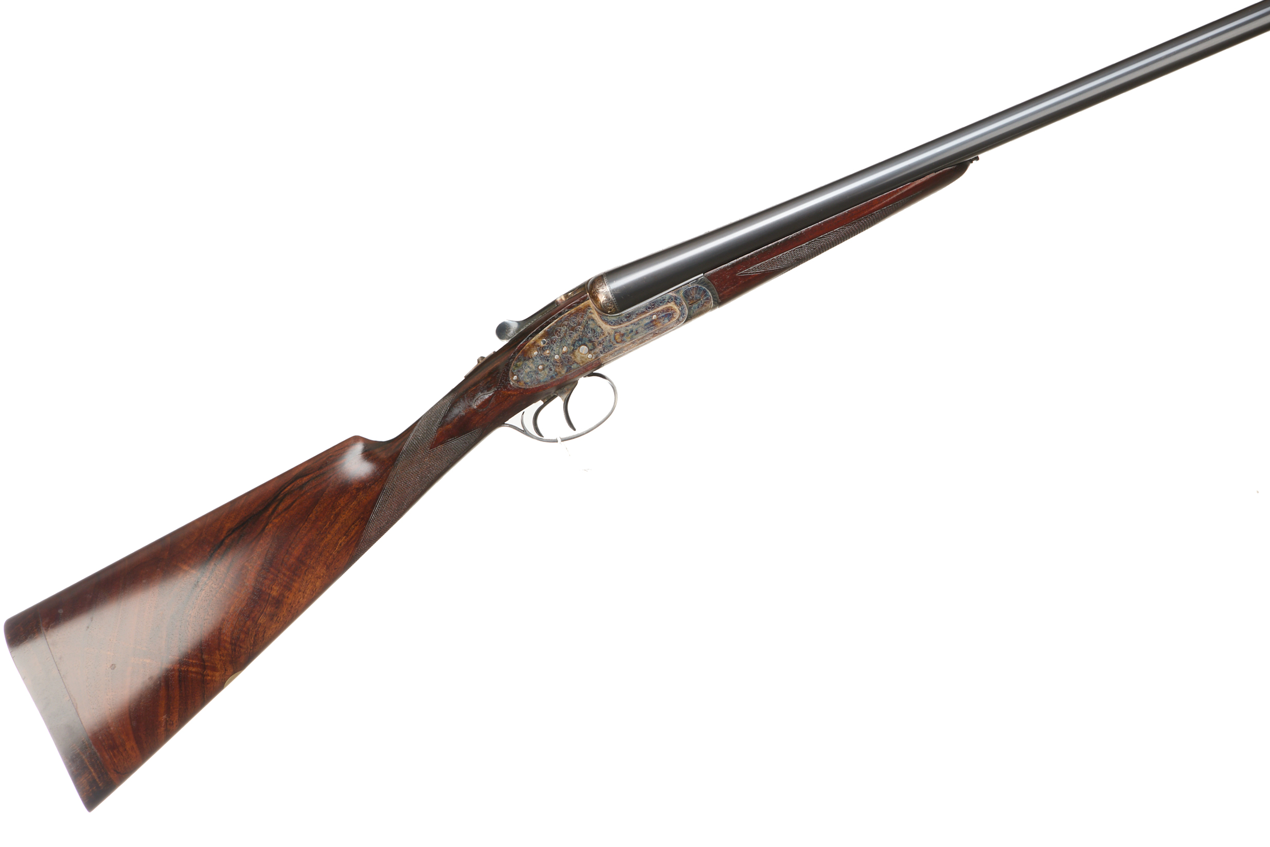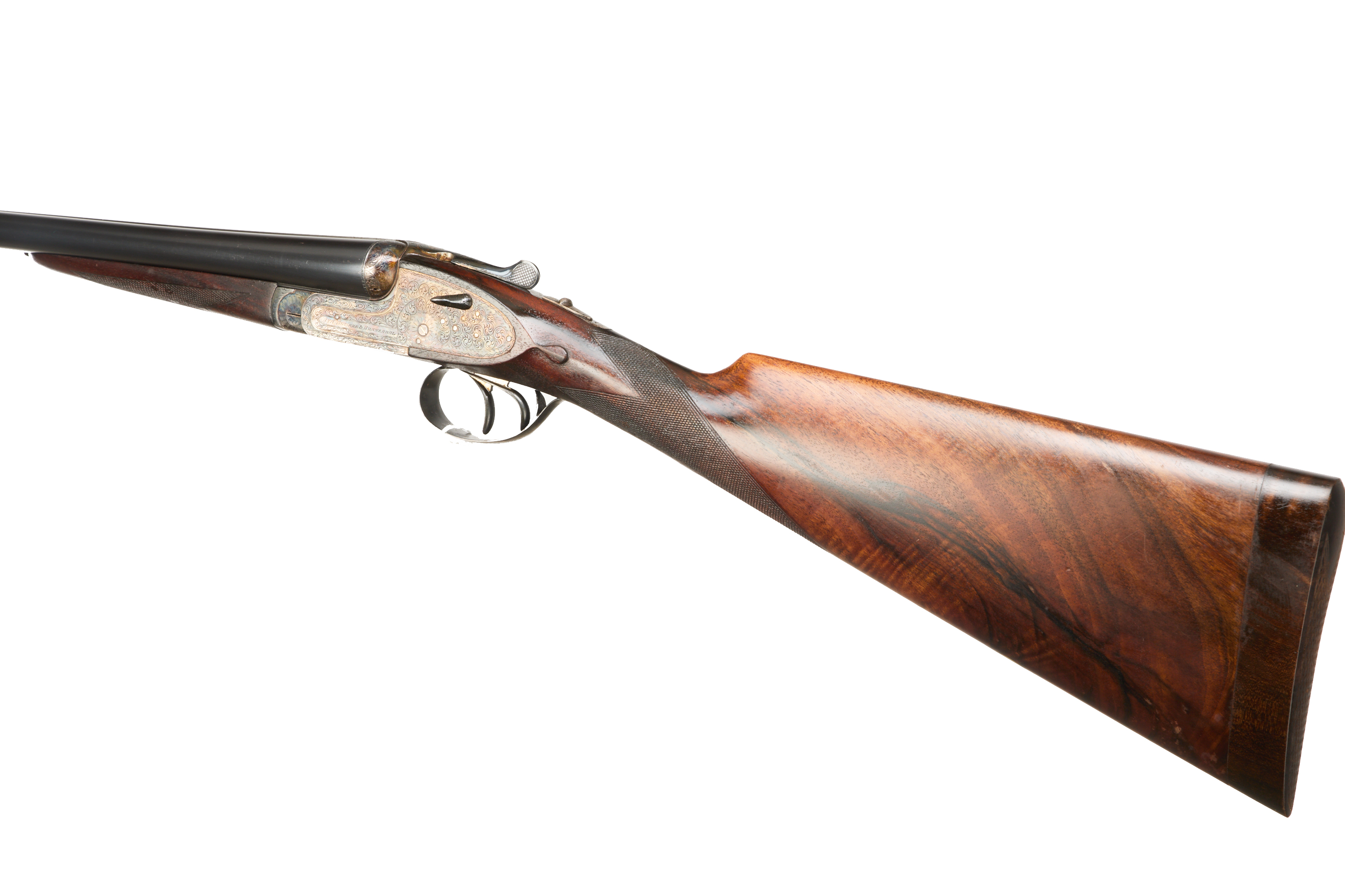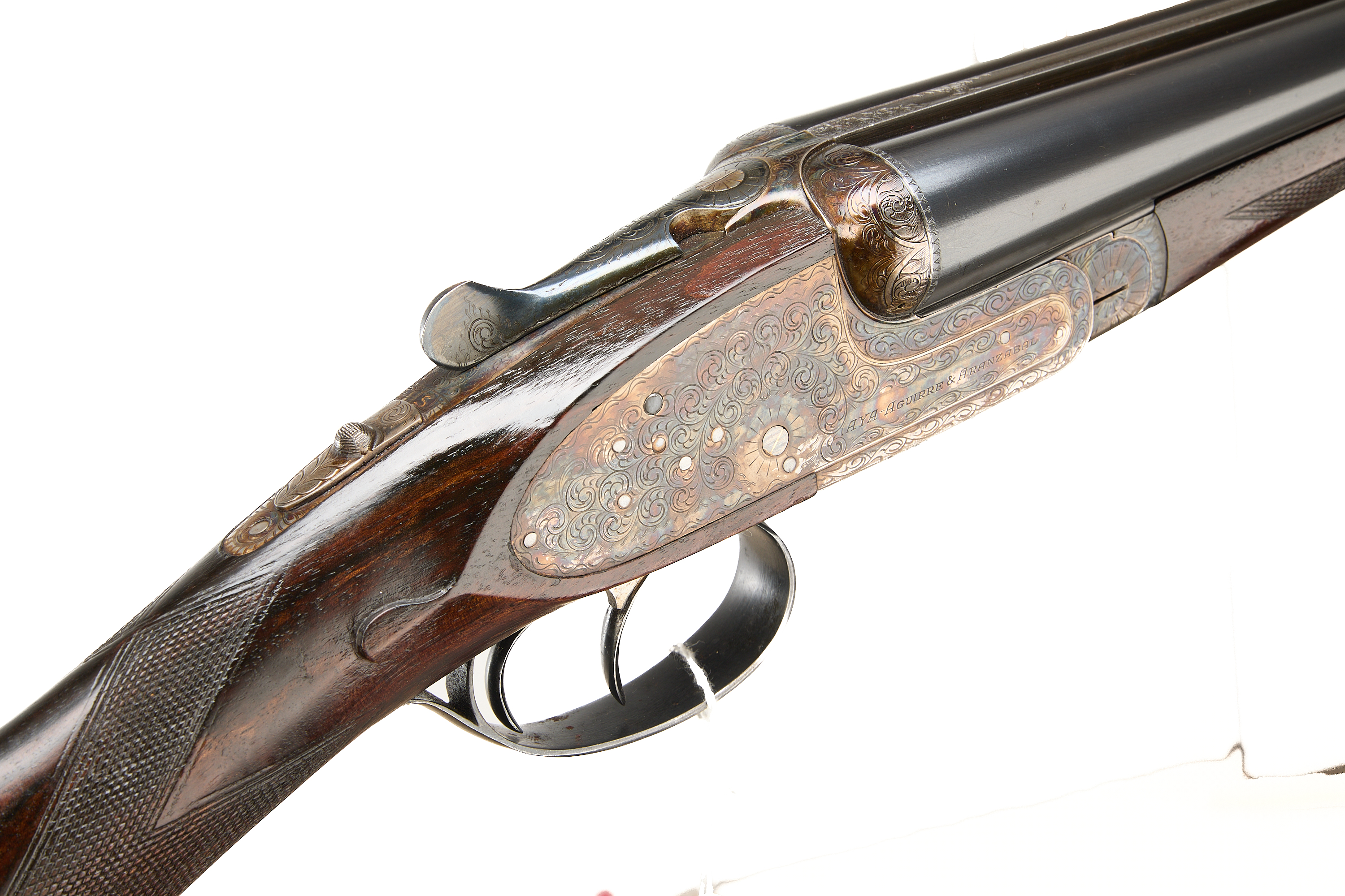 Chequered walnut extension, to highly figured stock, chequered straight grip and forend. Tapered game rib, engraved ‘AYA AGUIRRE AND ARANZABAL’ . Top lever, automatic safety with ‘S’ inlaid in gold. The action with full colour, engraved with bouquets and "AYA AGUIRRE AND ARANZABAL". N1 for 1968.