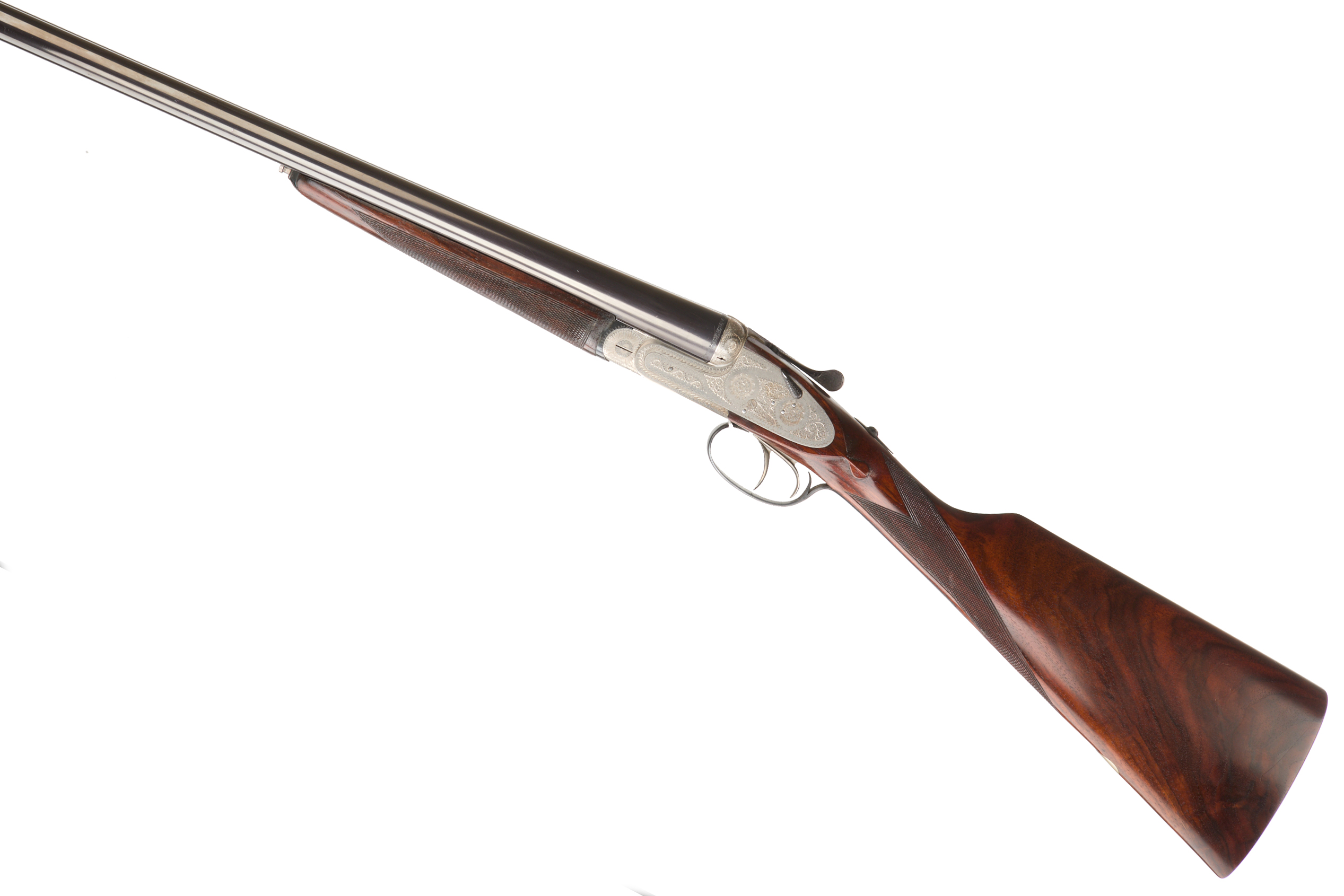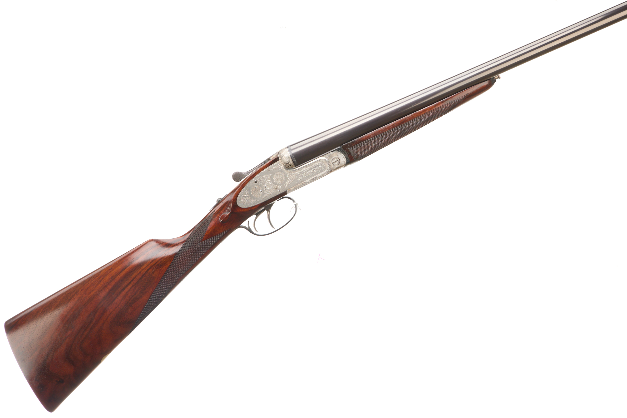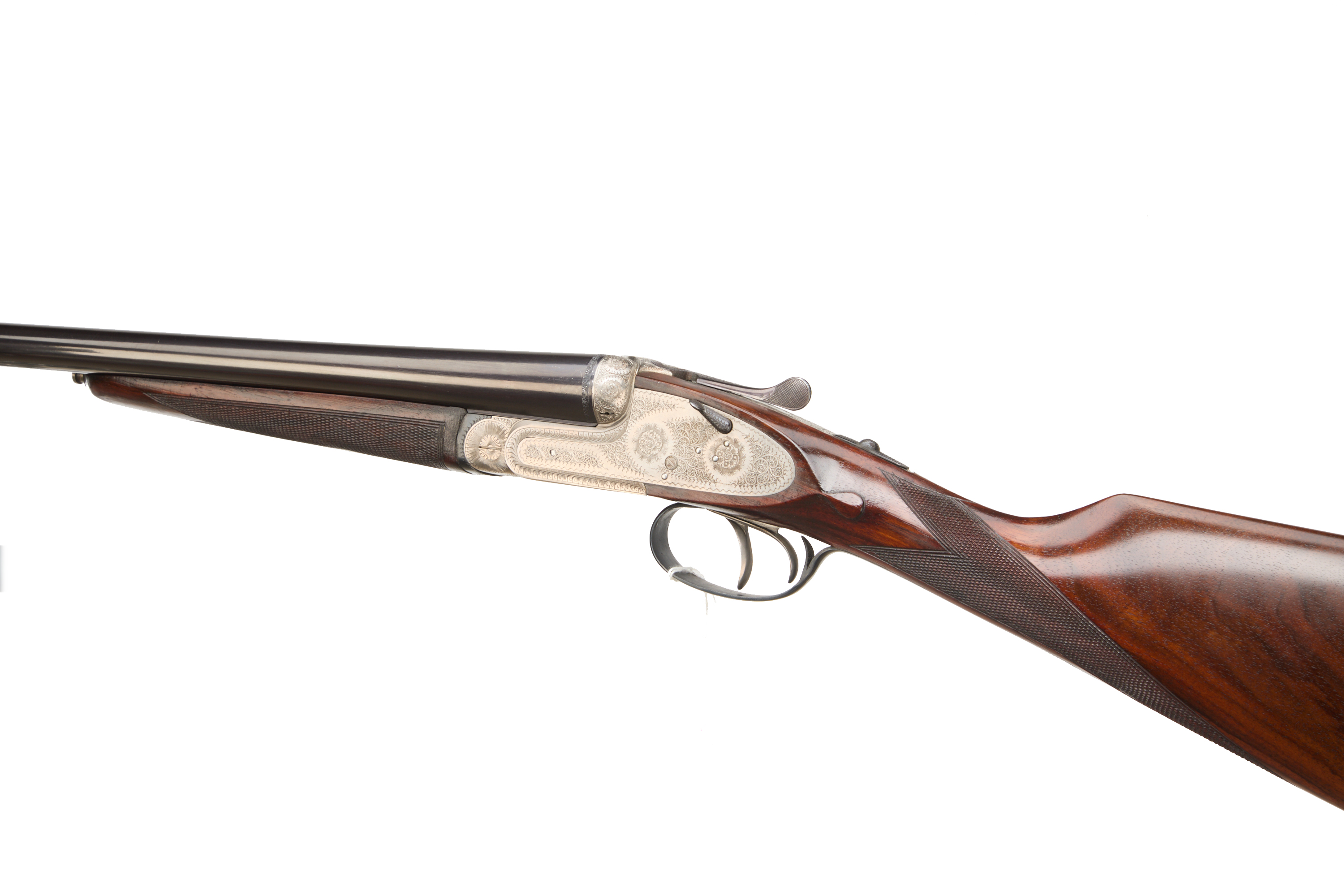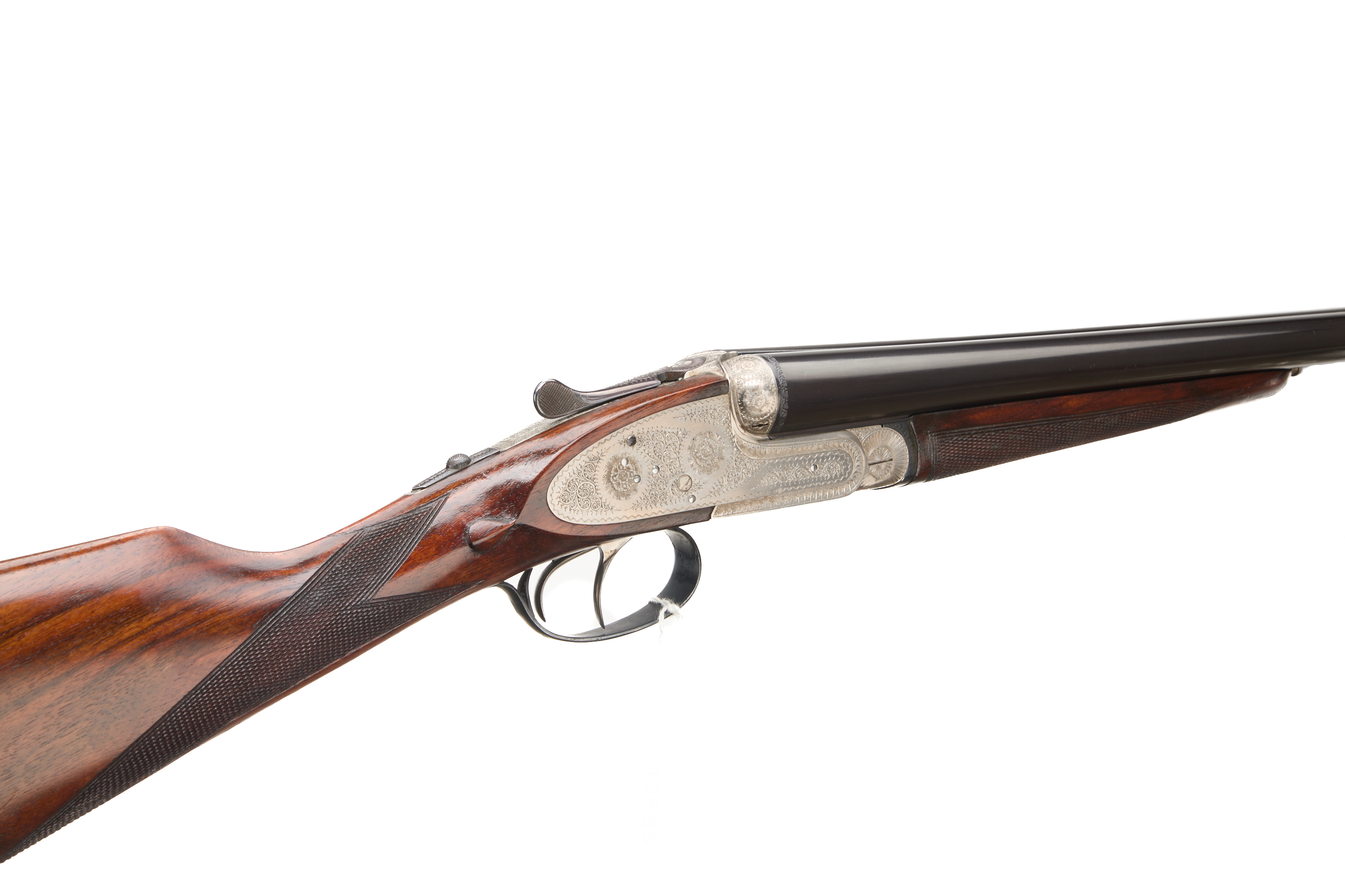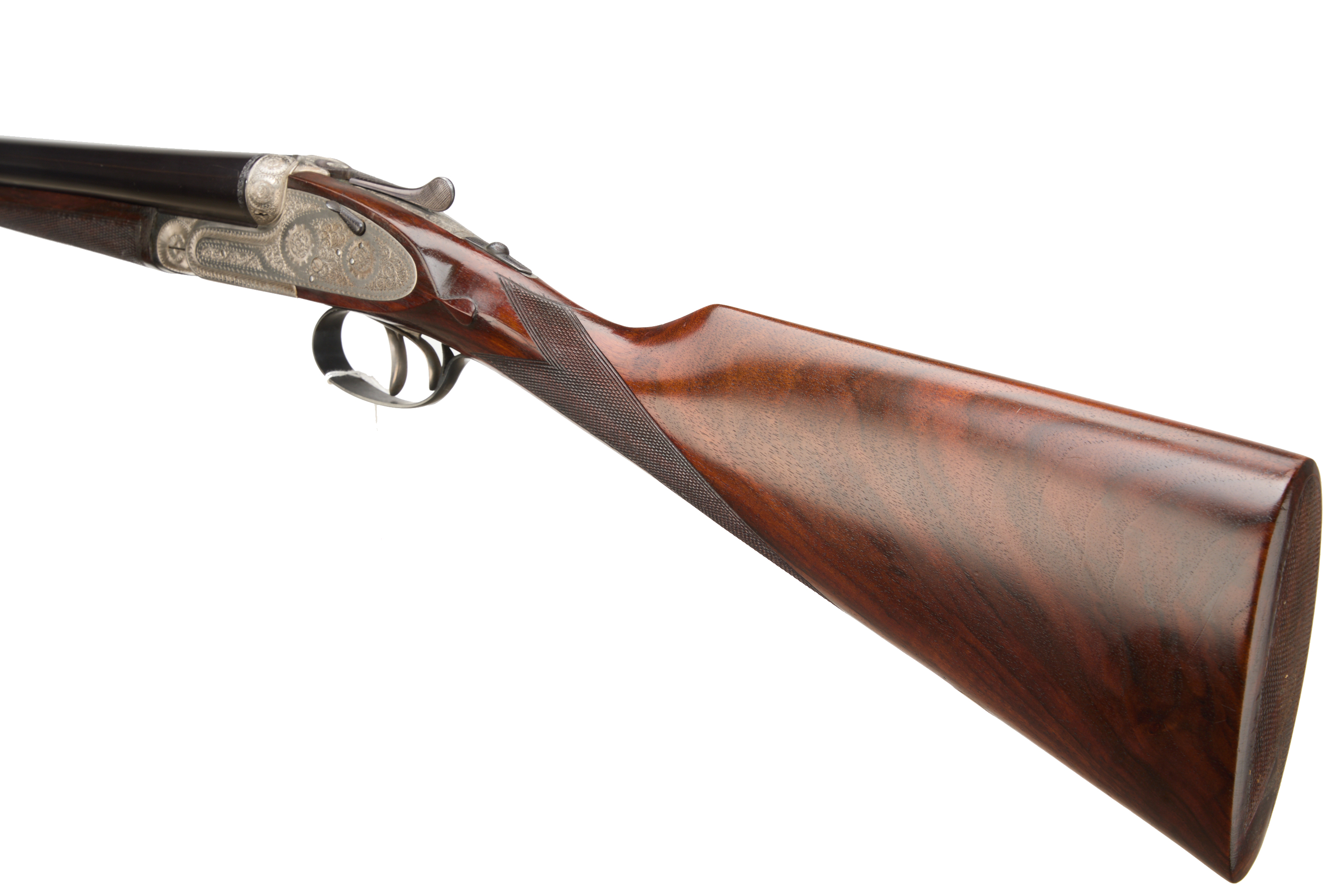 For 1987 by Armas Parkemy for Somerton. Fine, chequered butt, straight grip and forend. Tapered rib engraved ‘SOMERTON GUNS’. Chopper lump barrels, hand-detachable locks, cocking indicators, treble grip action, hold open top lever, automatic safety with ‘SAFE’ engraved. Rolled-edge trigger guard, removable striker discs The action engraved with bouquets and acanthus scrolling throughout.