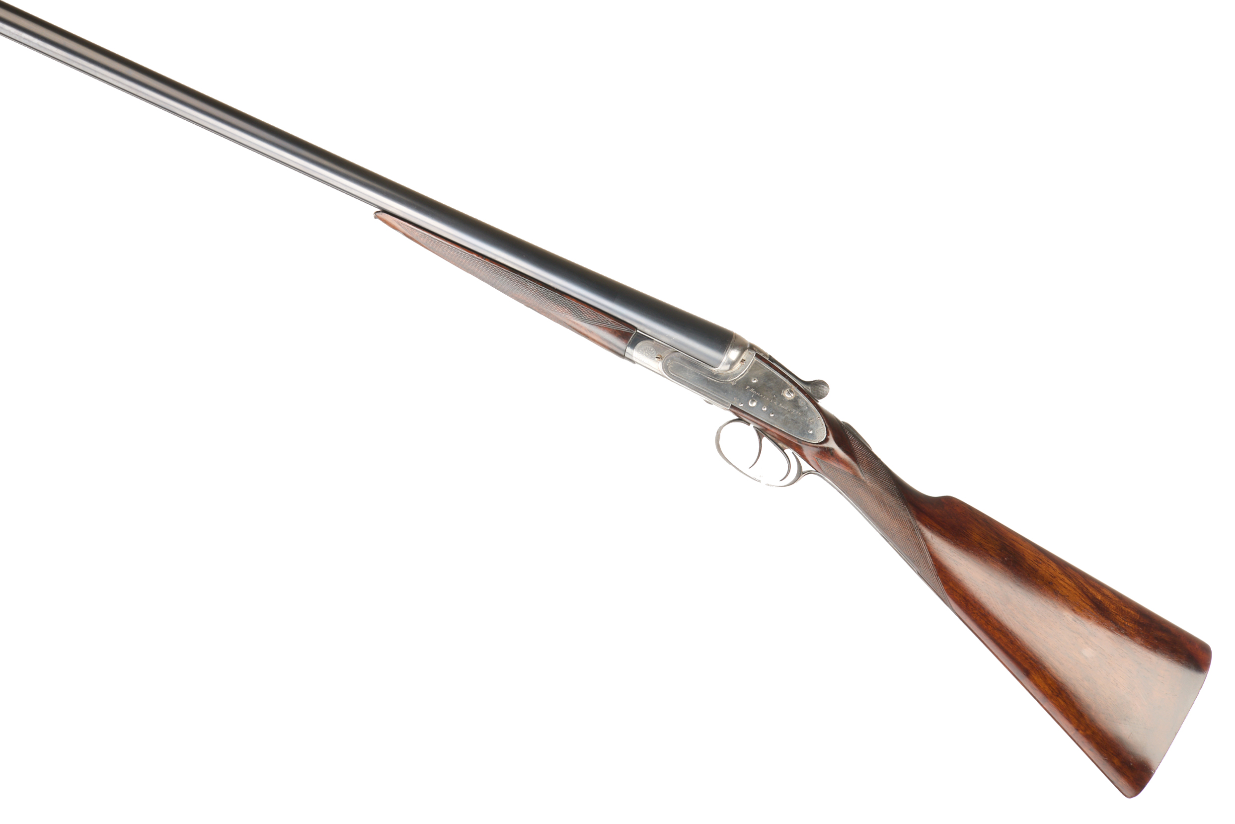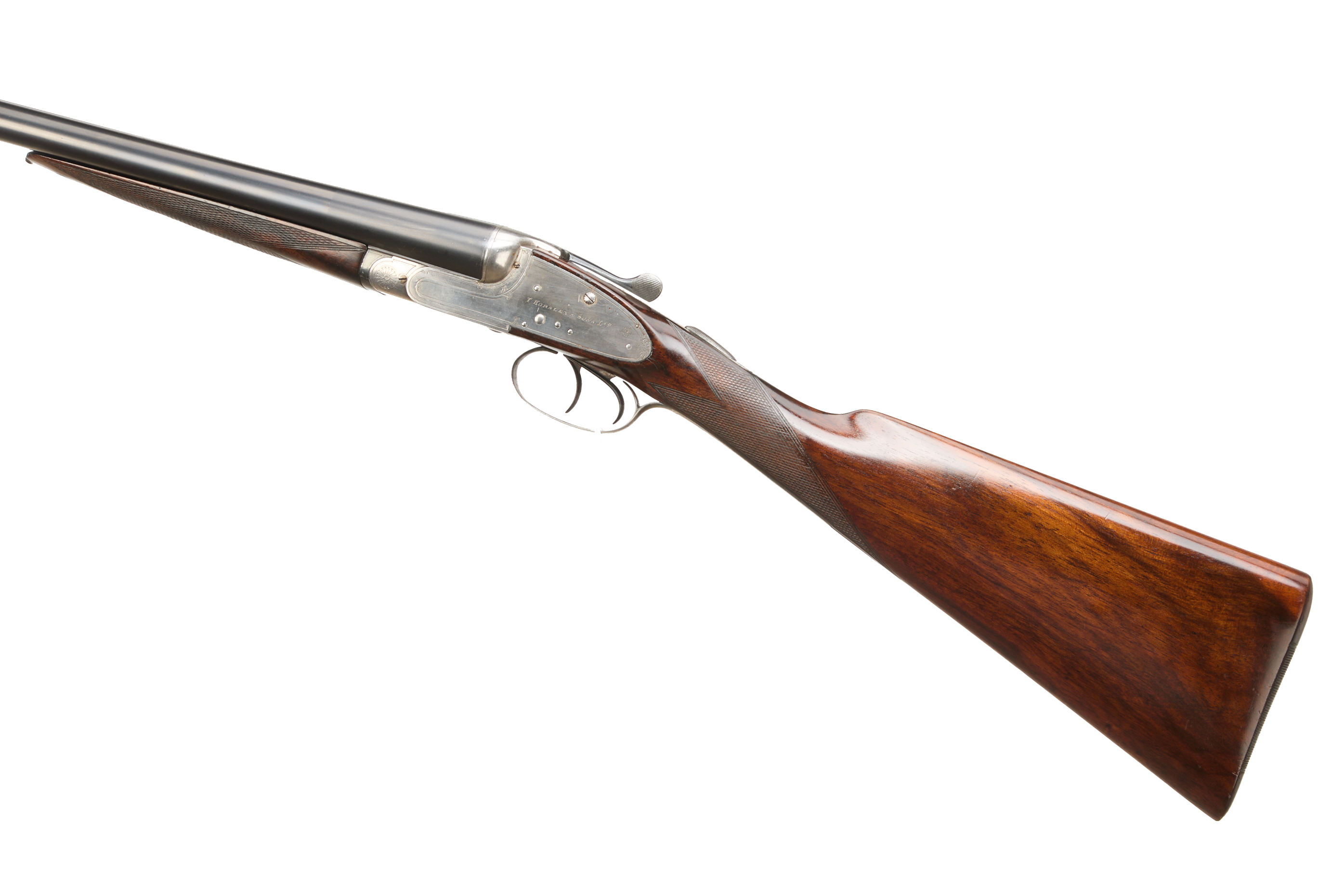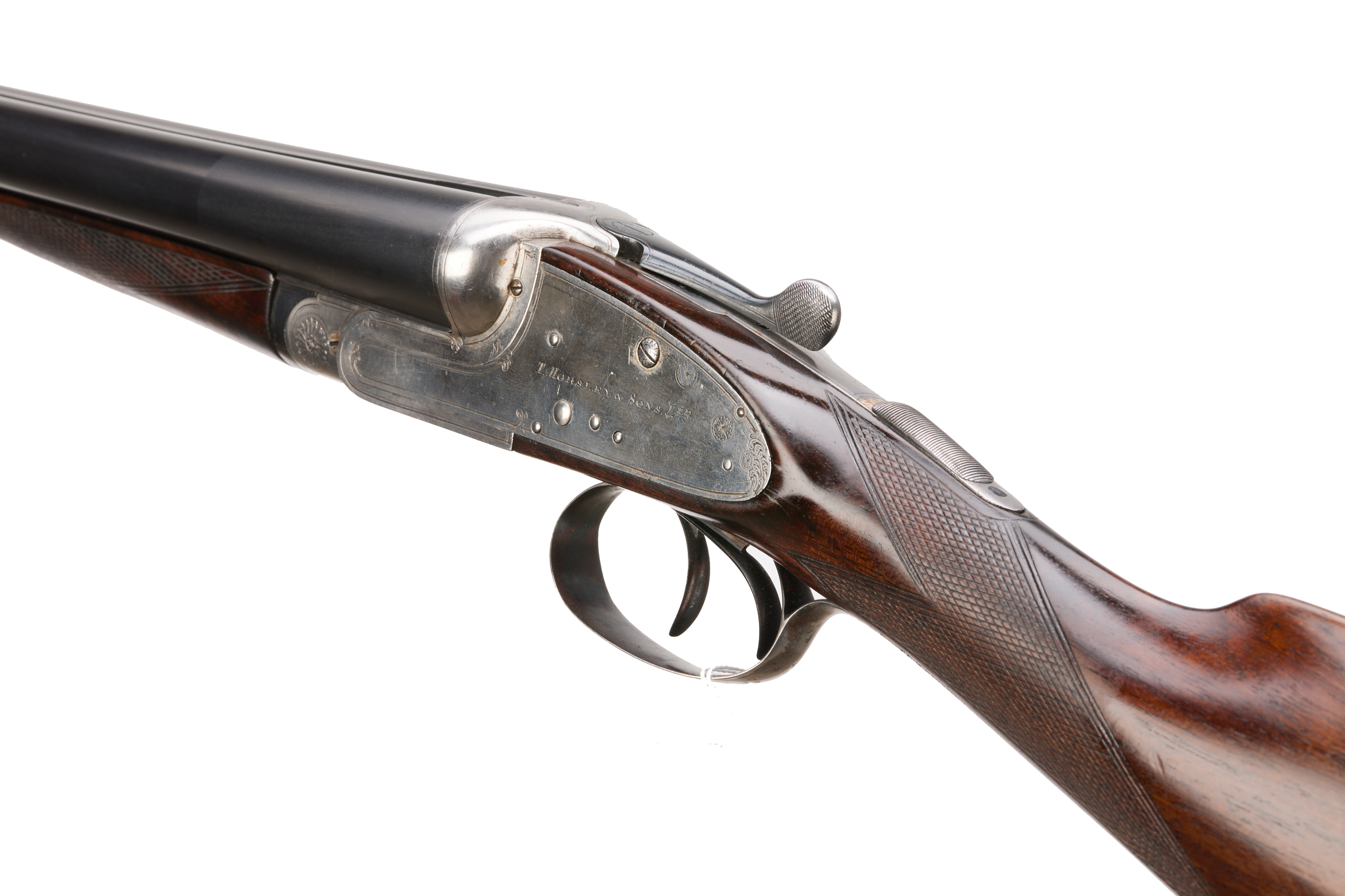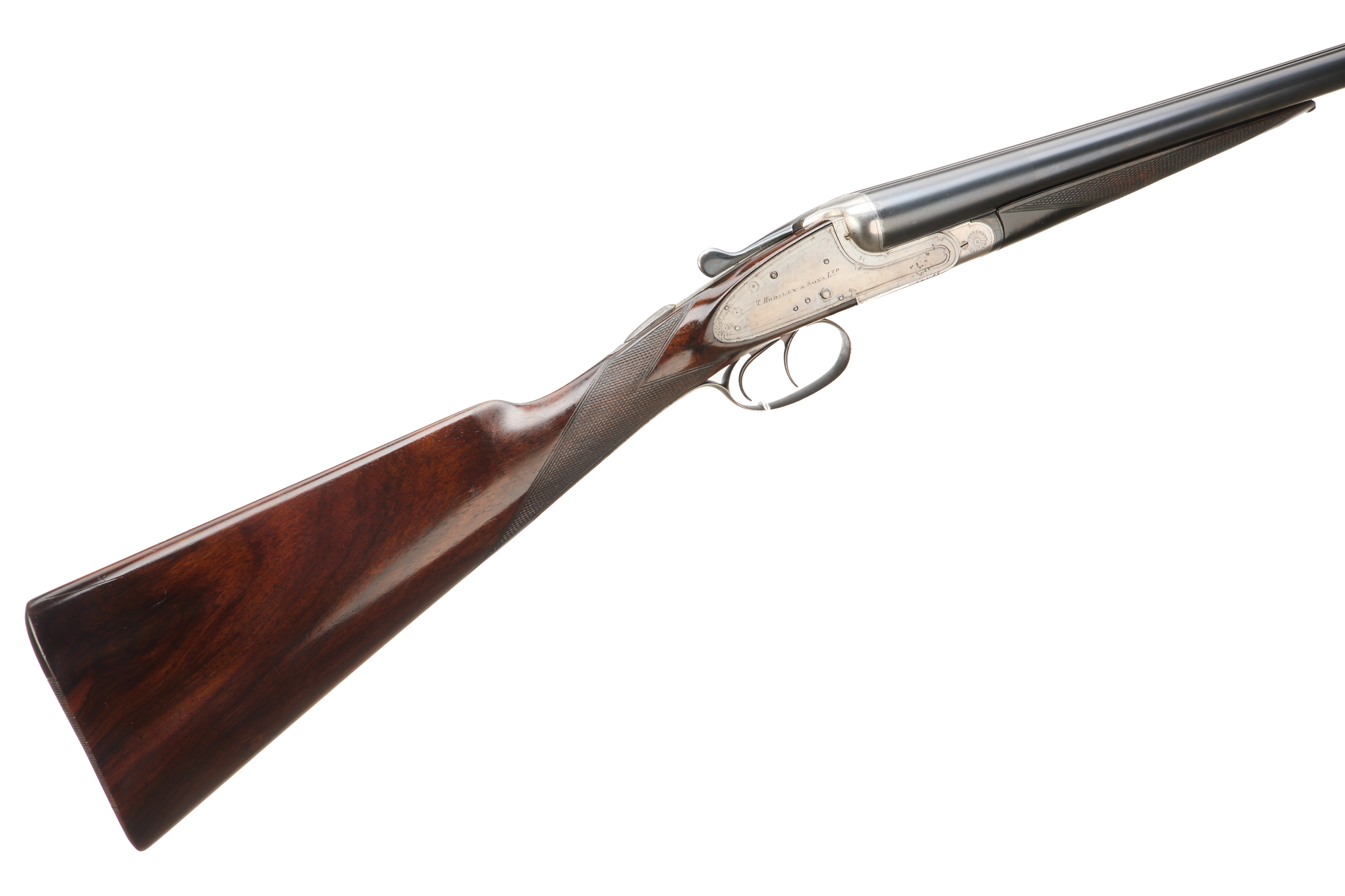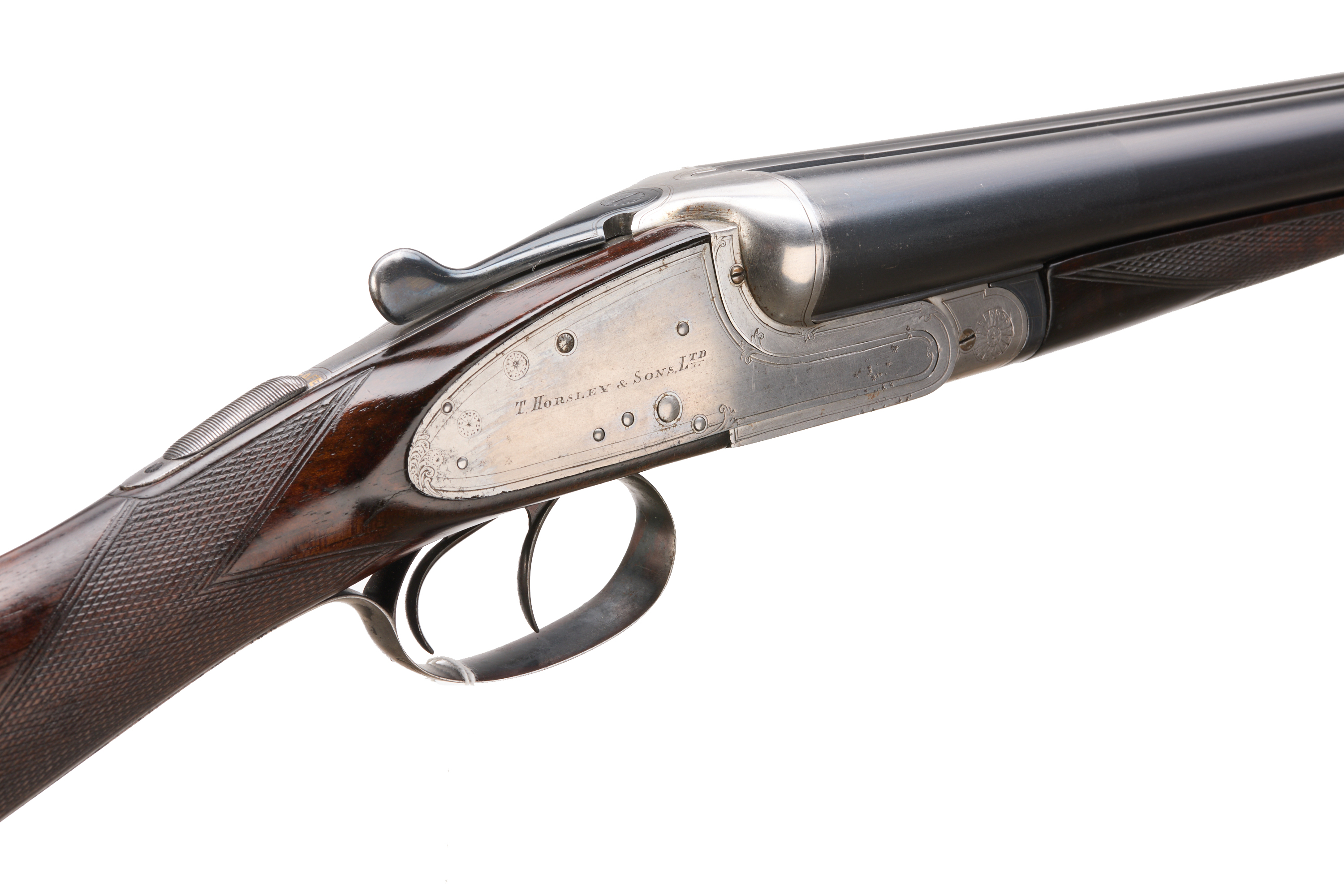 Ribbed butt, chequered straight grip and forend. Game rib, treble grip action, rib extension with third bite, sleeved. Automatic safety with ‘SAFE’ inlaid in gold. The action with scroll highlight to simply bordered locks now bright, engraved ‘T. HORSLEY & SON’ For post-1904. Sleeved and reproved 1991.