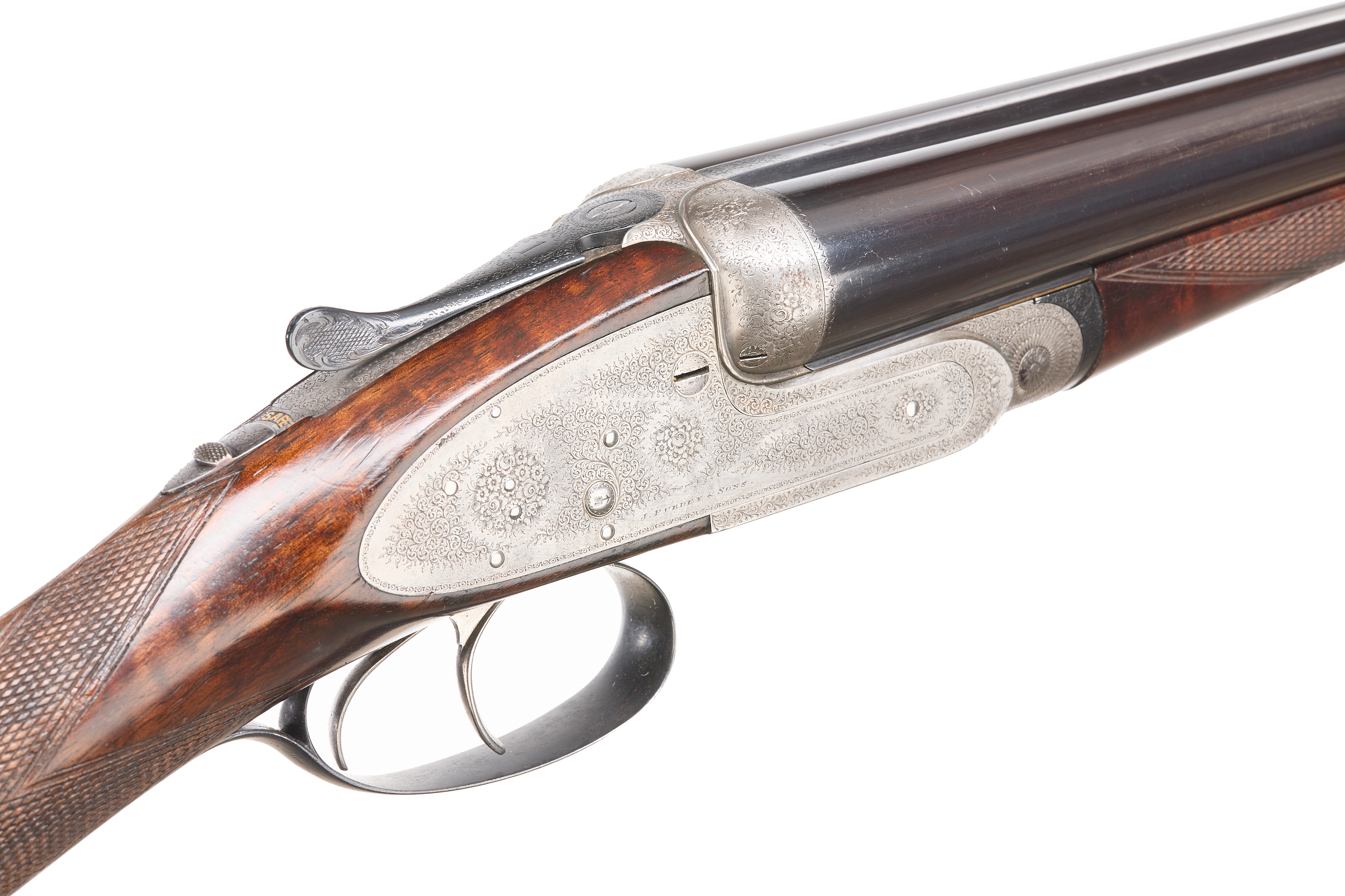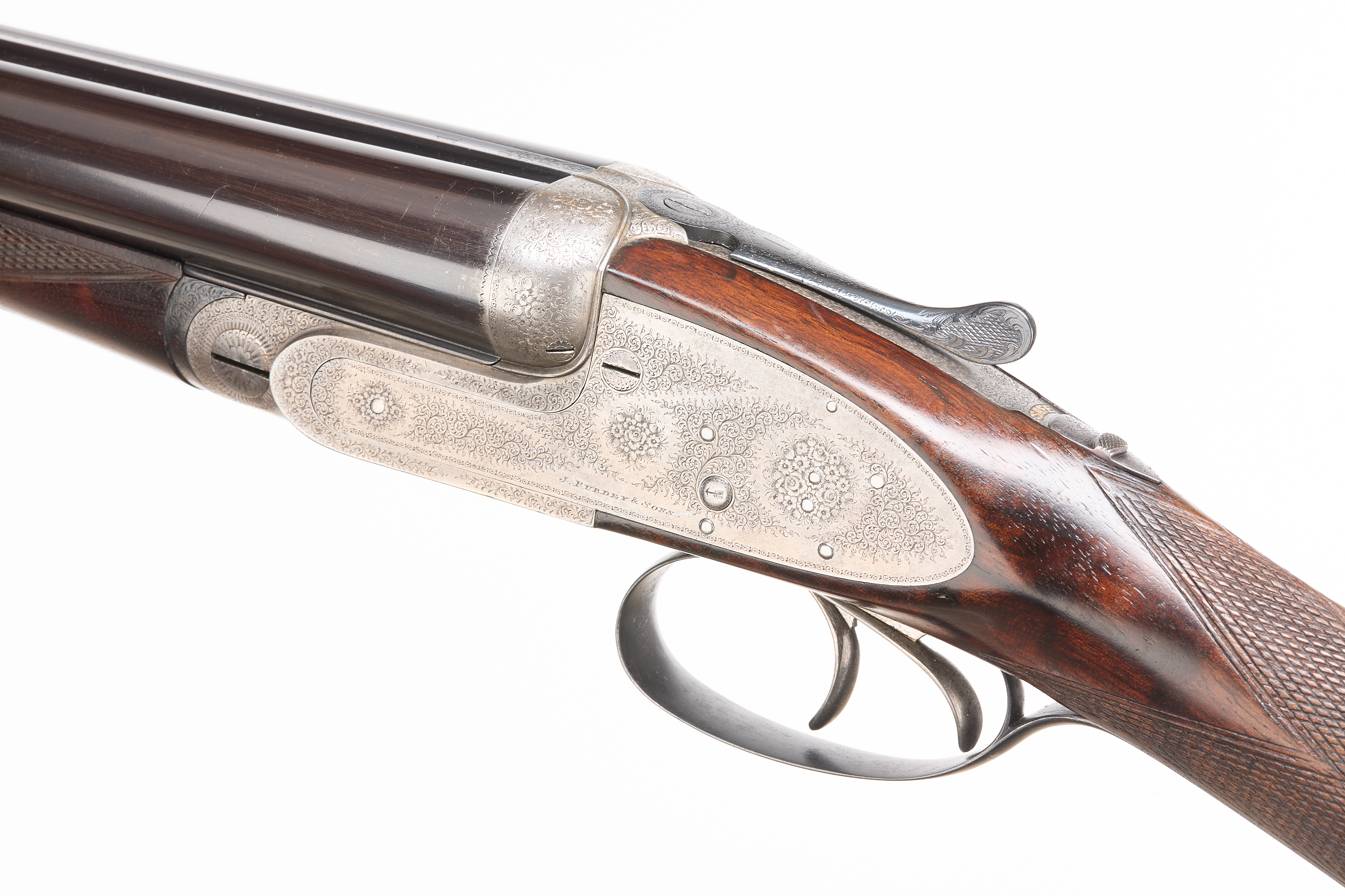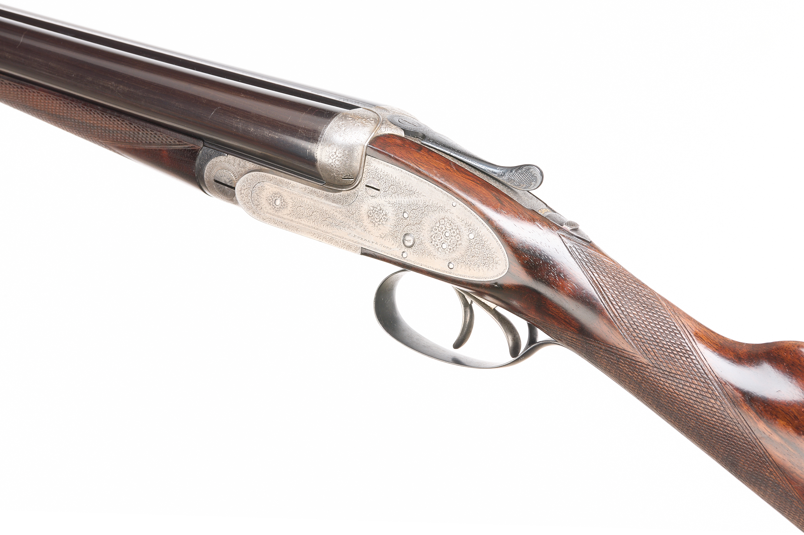 Chequered well-mated extensions to both, highly figured stocks, chequered straight grips and forends. The convex ribs engraved ‘J. PURDEY & SONS. AUDLEY HOUSE. SOUTH AUDLEY STREET. LONDON. MADE OF SIR JOSEPH WHITWORTH’S FLUID PRESSED STEEL.’ & ‘1’, ‘2’. The breech ends with delicate embellishments. Removable striker discs, cocking indicators, top levers engraved ‘1’ & ‘2’, automatic safeties, ‘SAFE’ inlaid in gold. The actions widely adorned with the finest acanthus scrolls and bouquets, ‘J PURDEY & SONS’ to the sides. Reproved London 1977.