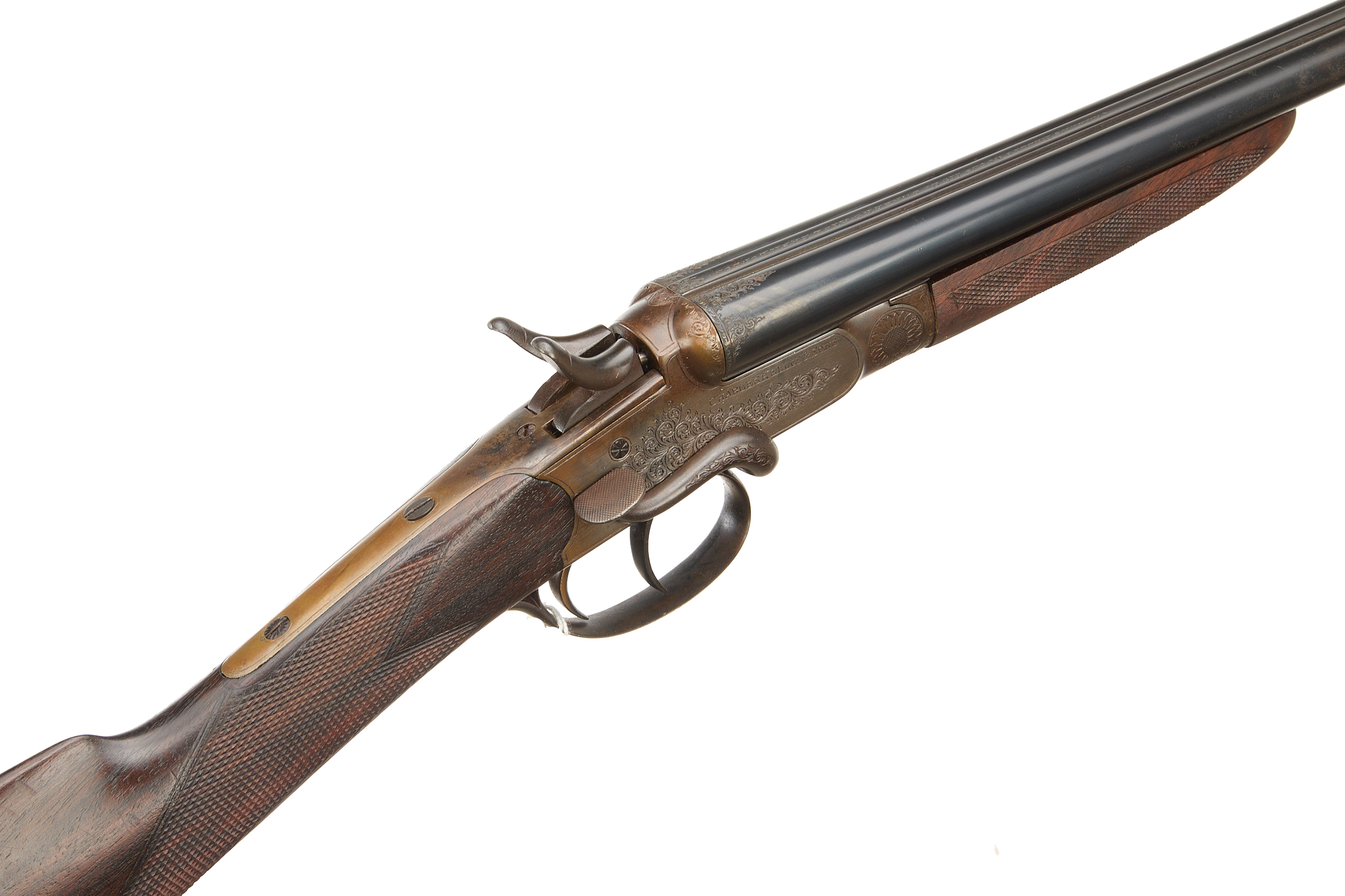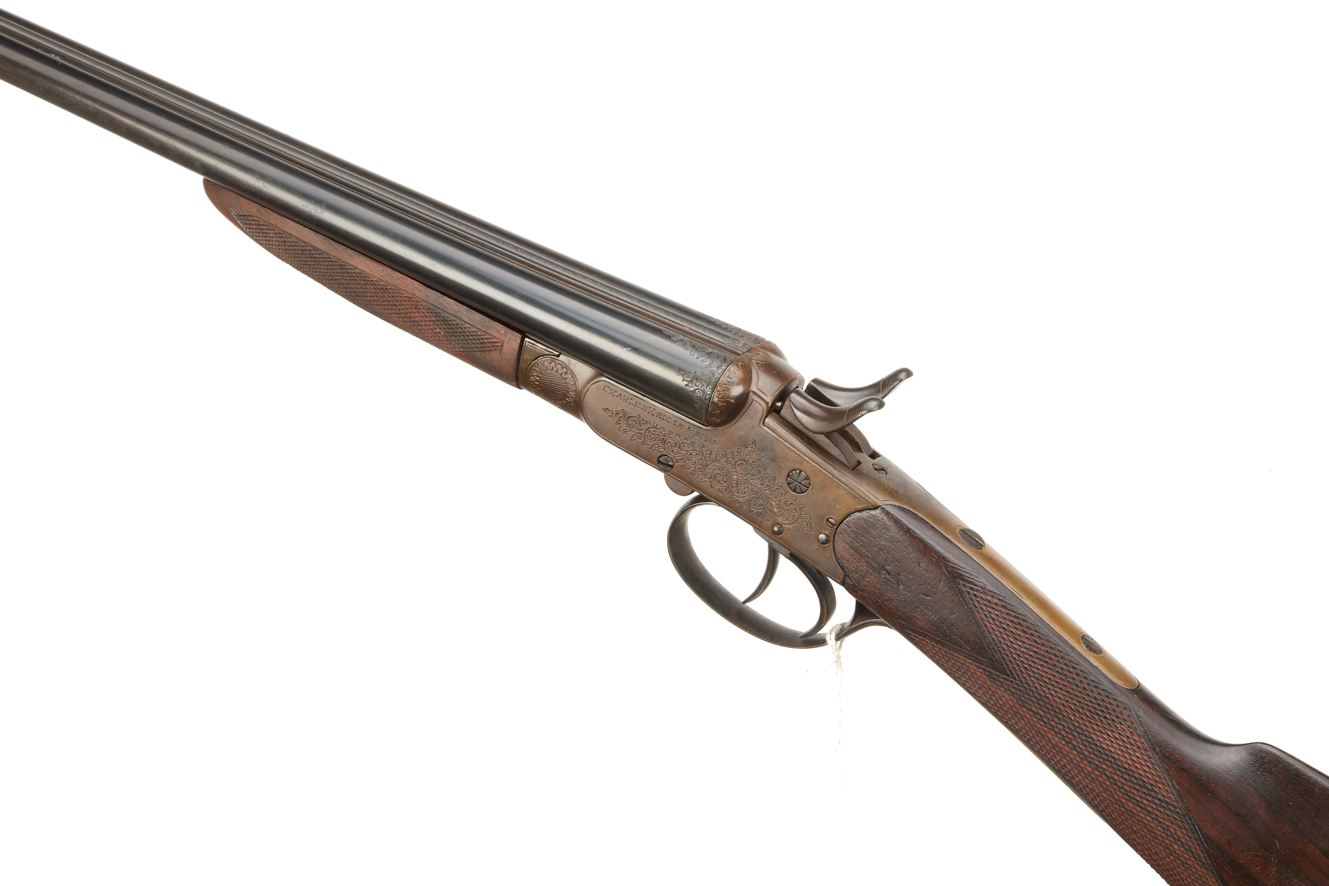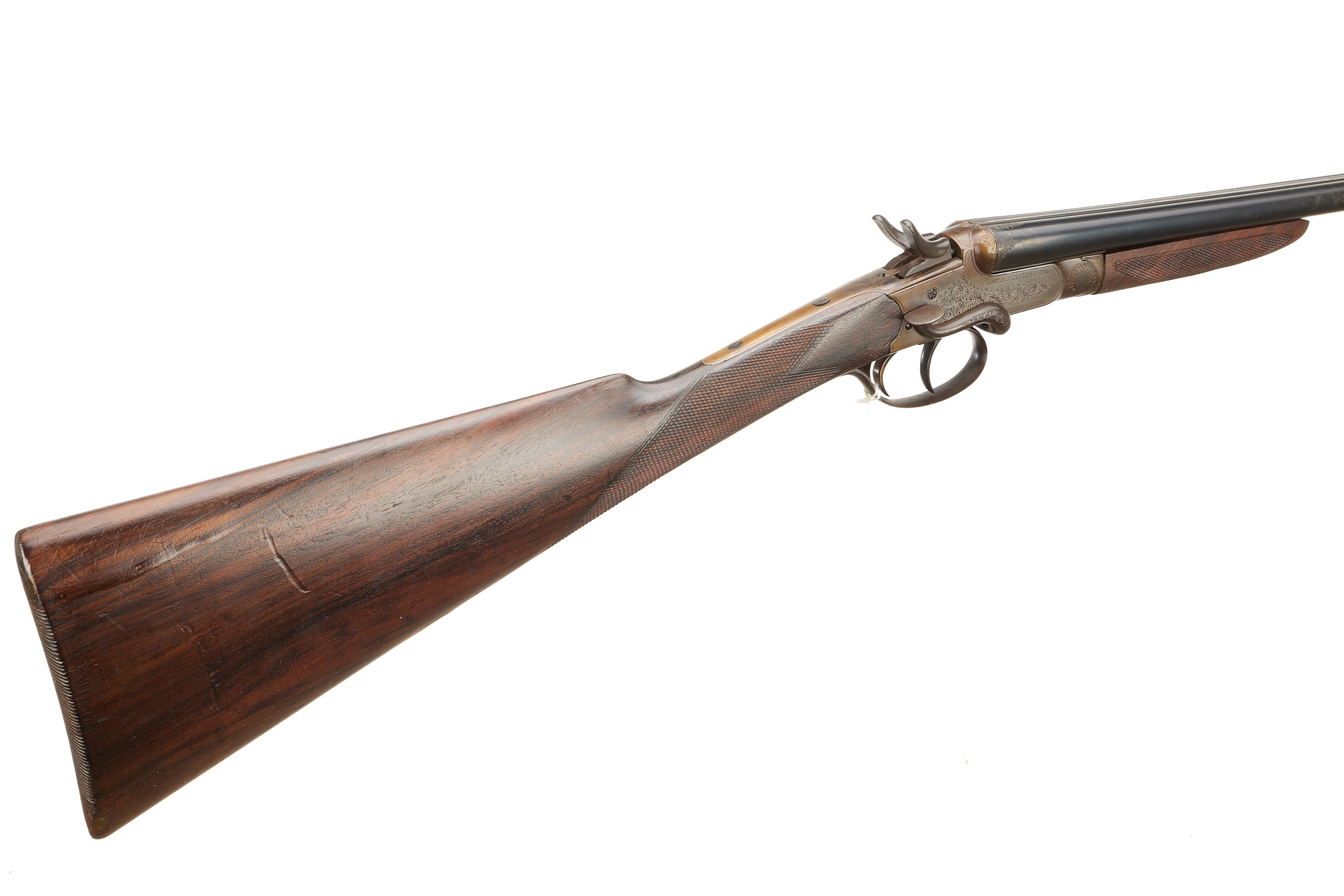 Replaced stock, scroll flourish embellishments to breech end. Action refinished, 2007 reproof. Chambers 2 1/2", Barrel 28 1/2", Pull 14 1/2", OAL 43 5/8".
